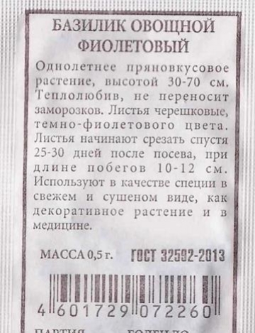 Среднеспелый (60-70 дней от всходов до технической спелости) сорт. Растение прямостоячее, полураскидистое, высотой до 60 см. Стебель антоциановой окраски. Листья темно-фиолетовые, среднего размера, яйцевидные, среднезубчатые по краю. Аромат сильный, пряный. Используется в свежем и сушеном виде в качестве пряновкусовой добавки в домашней кулинарии и при консервировании. Базилик предпочитает хорошо структурированные, богатые гумусом почвы. Выращивают рассадным способом. Посев на рассаду — конец марта — начало апреля. Высадка рассады в грунт — начало июня. Схема посадки: 30х30см.