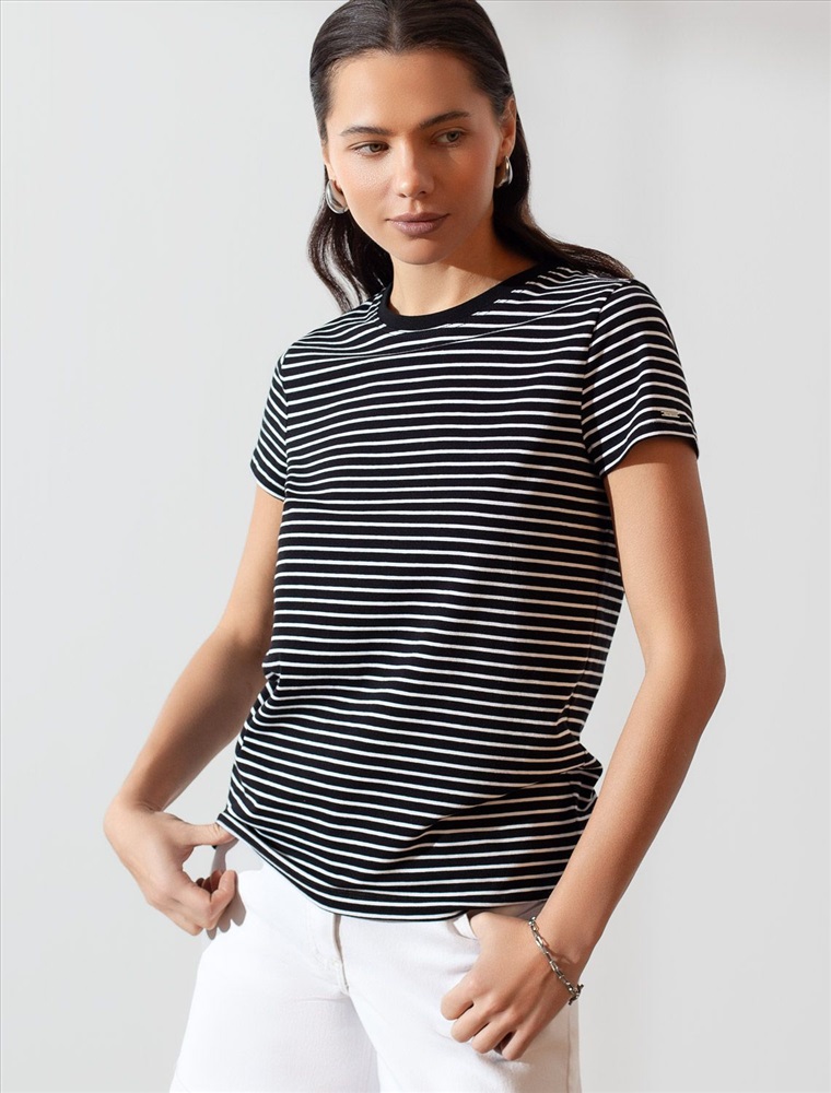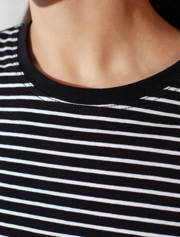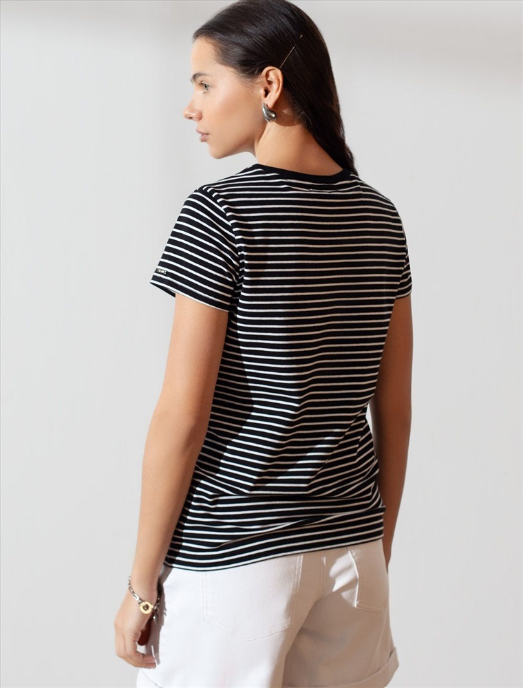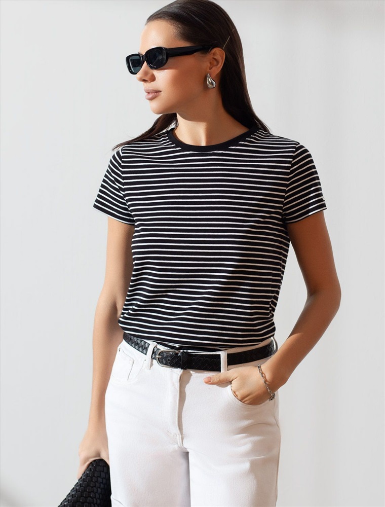 Стильная и модная женская футболка в тонкую черно-белую полоску станет отличным дополнением к вашему гардеробу. Футболка плотностью 170 Г/м2 изготовлена из премиального хлопка с добавлением эластана. Добавление эластана в состав изделия способствует формоустойчивости. Эта классическая футболка подходит для создания кэжуал образа на каждый день и идеально подойдет для работы. Модель не мнется, что делает ее практичным вариантом для активных женщин, которые ценят стиль и удобство. Благодаря современному принту полоска эта футболка легко комбинируется с различными элементами гардероба. Она станет универсальным решением для тех, кто предпочитает комфортный стиль casual. Повседневная футболка подчеркнет вашу индивидуальность и позволит вам выглядеть привлекательно в любой ситуации. Легкость в уходе и высокая износостойкость делают ее незаменимой вещью в вашем гардеробе. Одевайте эту модель как на работу, так и на встречу с друзьями — она всегда будет уместна! Стильная и практичная модель с простым кроем и лаконичным дизайном - идеальный вариант для тех, кто ценит качество, минимализм и классический стиль в одежде.