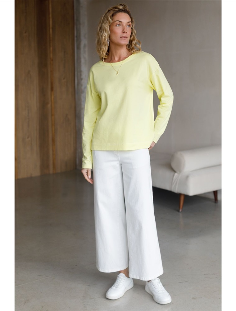 Свободный лонгслив лимонного цвета с длинным рукавом выполнен из премиального хлопка с добавлением эластана, что обеспечивает комфорт и приятные тактильные ощущения. Однотонная расцветка и круглый ворот создают стильный и универсальный образ, который подойдет для повседневного использования. Спущенная линия плеча придает лонгу современный и расслабленный силуэт. Такой лонгслив идеально подходит для весеннего и летнего сезона благодаря легкой и дышащей ткани. Большие размеры позволяют выбрать оптимальный вариант на любую фигуру, обеспечивая свободу движений и удобство на каждый день. Этот комфортный лонгслив станет отличной базой в гардеробе, сочетаясь с различными стилями одежды и создавая простой, но эффектный образ.