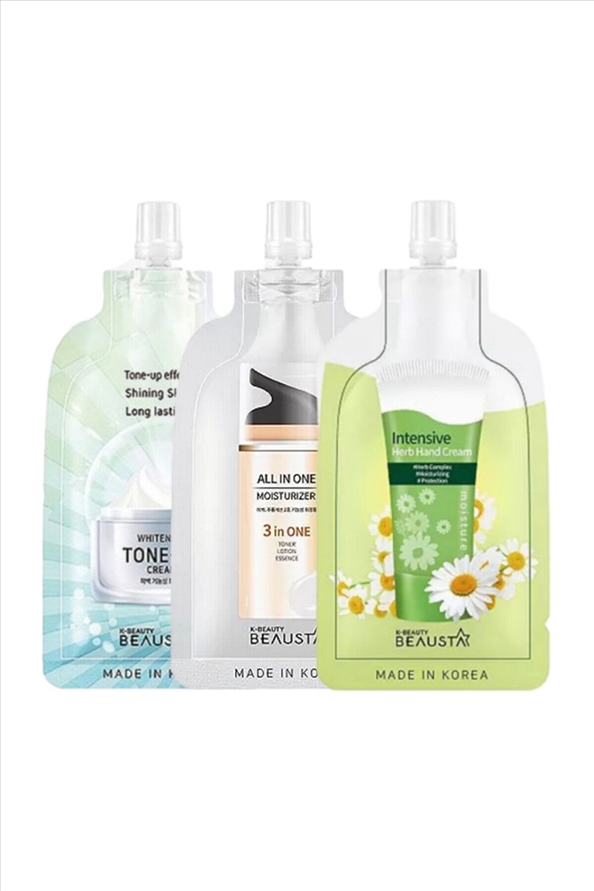 Beausta Набор средств в тревел-формате. Состав набора: Крем для лица увлажняющий 3 в 1 Beausta All In One Moisturizer, 15 мл; Крем для лица выравнивающий Beausta Whitening Tone-Up Cream, 15 мл; Крем для рук с экстрактами трав Beausta Intensive Herb Hand Cream, 20 мл. Увлажняющий многофункциональный крем Beausta All In One Moisturizer для лица сочетает в себе тонер, эссенцию и лосьон, что позволяет обеспечить коже комплексный уход с помощью одного единственного средства. Крем имеет мягкую приятную консистенцию, благодаря которой он ровно ложится на кожу, хорошо распределяется и быстро впитывается. Он не образует липкой плёнки, не создаёт жирности и не вызывает дискомфорта. Крем Beausta Whitening Tone-Up Cream помогает осветлить кожу и создать сияющий финиш. Он уменьшает проявление пигментаций, покраснений, веснушек и других несовершенств, выравнивает тон кожи и делает цвет лица ярким и насыщенным. Крем интенсивно обогащает клетки влагой, насыщает их витаминами, оптимизирует жирность кожи, регулирует работу сальных желез и нормализует гидробаланс. Крем обладает лёгкой гелевой текстурой, благодаря которой, он хорошо распределяется по коже, быстро впитывается, не создаёт ощущения липкости, жирности и дискомфорта. Крем не забивает поры, поэтому отлично подойдёт для жарких летних дней. Увлажняющий крем для рук Beausta Intensive Herb Hand Cream с целебными травами интенсивно смягчает и успокаивает кожу, снимает усталость и напряжение, устраняет чувство стянутости и дискомфорта, придаёт рукам ухоженный и здоровый вид. Способ применения: Крем: Извлеките немного крема и равномерно распределите по заранее очищенной коже лица. Дайте средству хорошо впитаться. Используйте по мере необходимости. Средство подходит для ежедневного использования. Крем для рук: Извлеките немного крема и равномерно распределите по заранее очищенной коже рук. Дайте средству хорошо впитаться. Используйте по мере необходимости. Средство подходит для ежедневного использования. Состав: Beausta All In One Moisturizer:Water, Butylene Glycol, Dimethicone, Dipropylene Glycol, Niacinamide, Cetyl EthylHexanoate, Caprylic/Capric Triglyceride, Cetearyl Alcohol, Hydrogenated Polydecene, Beeswax, Glyceryl Stearate, Polysorbate 60, Betaine, 1,2-Hexanediol, Polyacrylate-13, Polyisobutene, Pelargonium Graveolens Flower Oil, PEG-100 Stearate, Hydroxyacetophenone, Caprylyl Glycol, Carbomer, Sodium Hyaluronate, Ethylhexylglycerin, Xanthan Gum, Tromethamine, Sorbitan Isostearate, Polysorbate 20, Adenosine, Tocopheryl Acetate, Disodium EDTA, Fragrance, Citrus Aurantium Bergamia (Bergamot) Fruit Oil, Tripropylene Glycol, Pinus Sylvestris Leaf Oil, Helianthus Annuus (Sunflower) Seed Oil, Allantoin, Centella Asiatica Extract, Propylene Glycol. Beausta Whitening Tone-Up Cream:Water, Glycerin, Dipropylene Glycol, Cyclopentasiloxane, PEG/PPG-17/6 Copolymer, Titanium Dioxide, Bis-PEG-18 Methyl Ether Dimethyl Silane, Niacinamide, Cyclohexasiloxane, Sodium Acrylate/Sodium Acryloyldimethyl Taurate