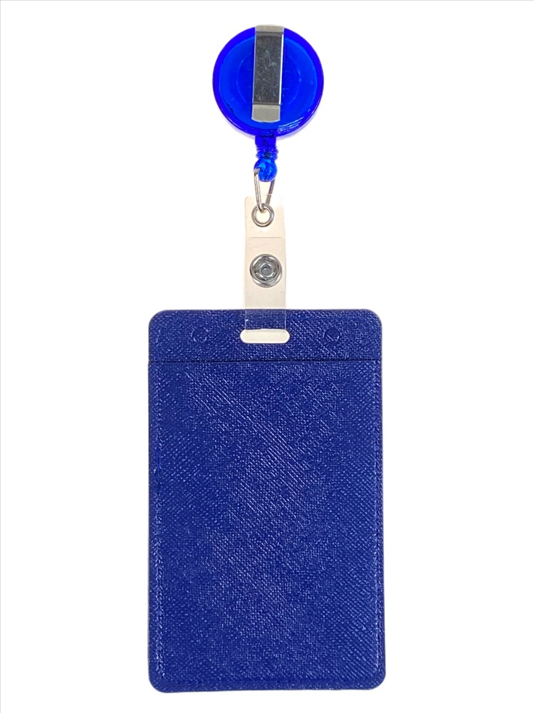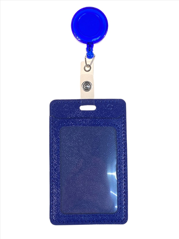 Бейдж с лентой на рулетке вертикальный, цвет синий