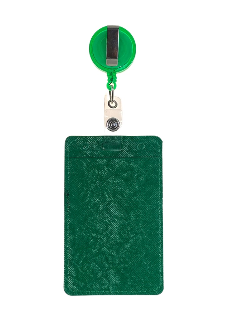 Бейдж с лентой на рулетке вертикальный, цвет зеленый