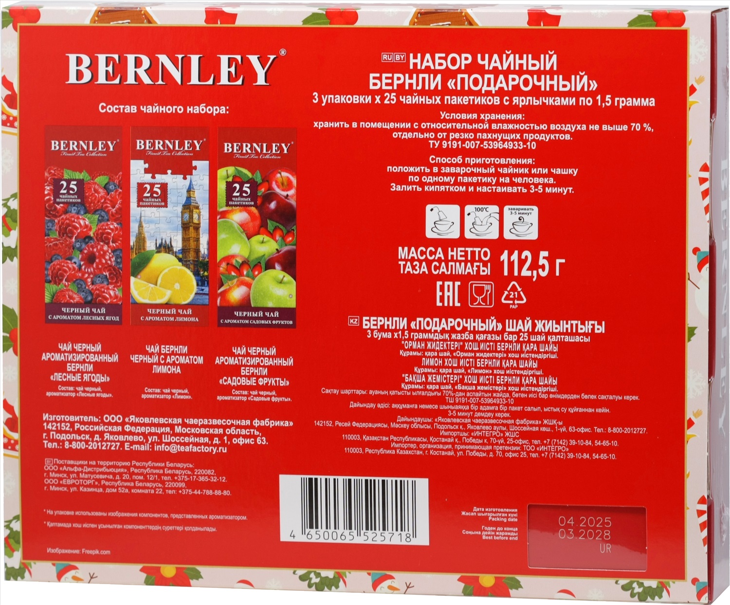 Набор ассорти черного чая с натуральными ароматами фруктов и ягод.В коробочке вы найдете три упаковки вкуснейшего чая (в каждой по 25 пакетиков):1. Лесные ягоды: чай черный, натуральный ароматизатор «Лесные ягоды»2. Лимон: чай черный, натуральный ароматизатор «Лимон»3. Садовые фрукты: чай черный, натуральный ароматизатор «Садовые фрукты»Яркая упаковка станет отличным подарком к любому празднику!