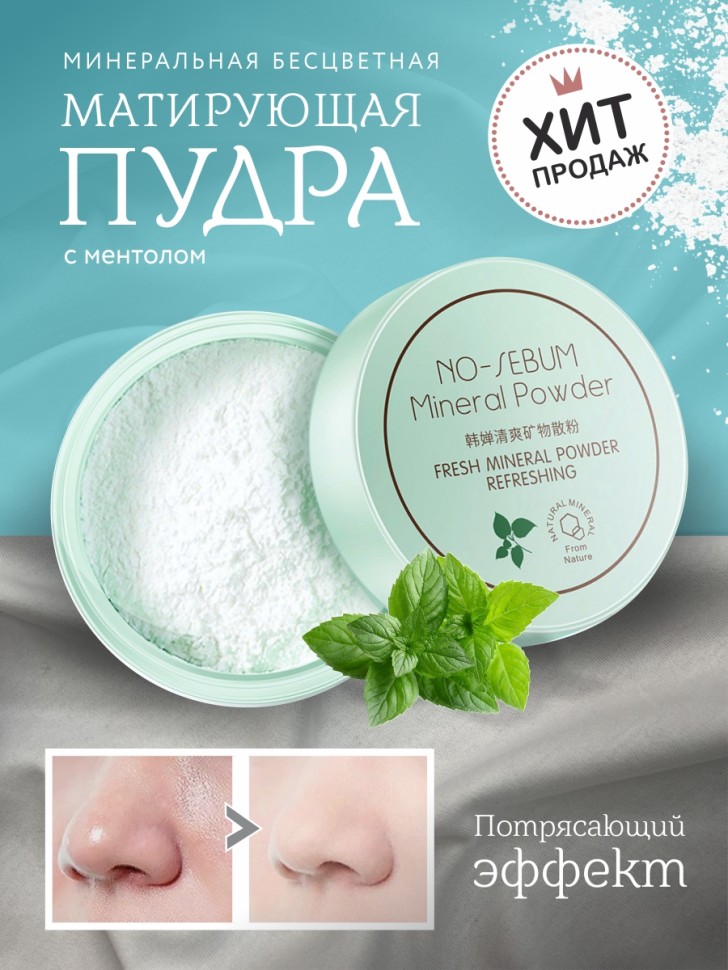 Состав: Минеральная пудра с мятой – лицо будет матовым, красивого цвета, а освежающий аромат и экстракт подарит легкий холодок. Результат: После применения макияж держится дольше, кожа матовая и гладкая, имеет ровный тон и бархатистую текстуру. Способ применения: Можно использовать как самостоятельно, так и на макияж, для придания матовости финишу. Равномерно нанесите пудру спонжиком или кистью на лицо, растушуйте до равномерного покрытия. Комментарии к товару