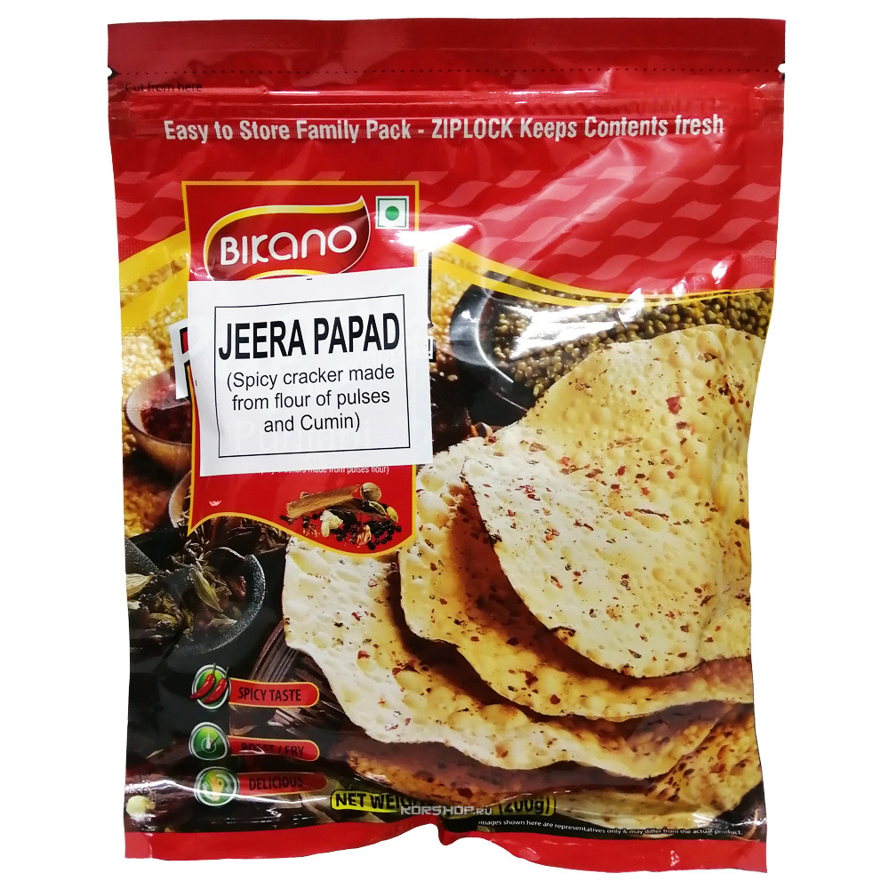 Brand: Bikano Вес/Объем/ колч: 200 Материал упаковки: OTHER7 Мл/уп/г: г Продается как: шт. Упаковка: Пакет 200г «Папад острый с зирой (кумином) Bikano» — хрустящая восточная лепёшка из муки бобовых. Обладает лёгким острым вкусом и ярко выраженным восточным ароматом. Комментарии к товару