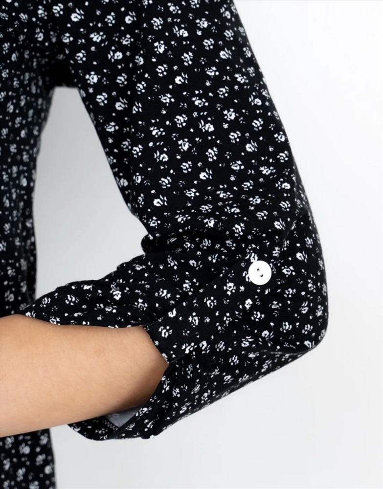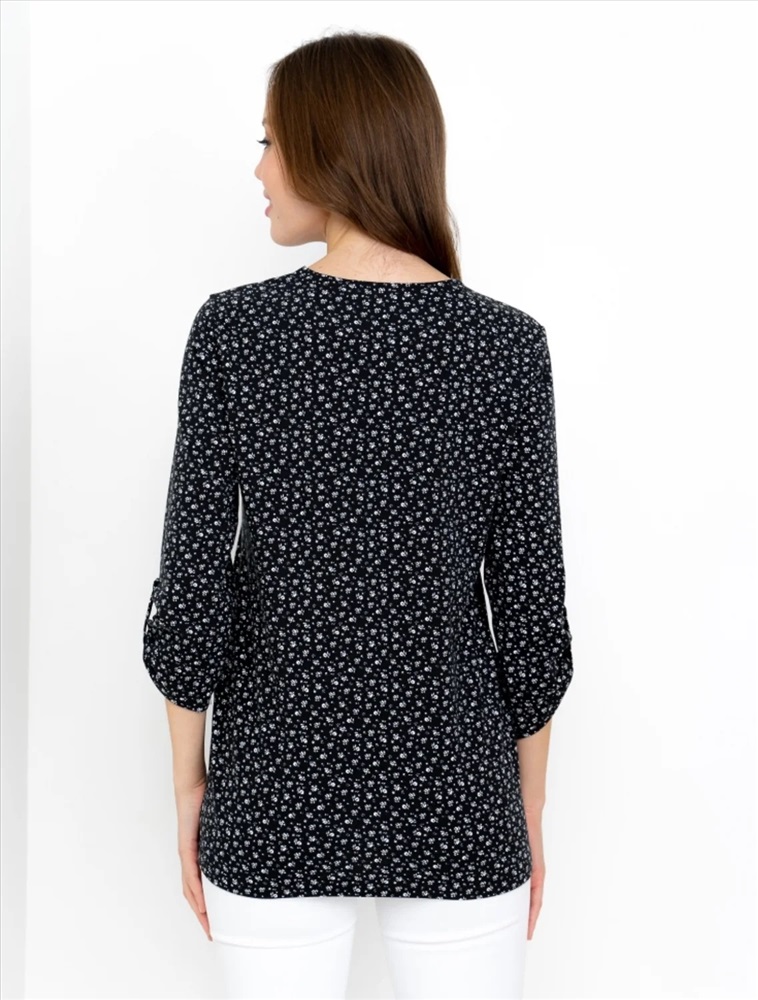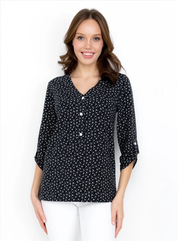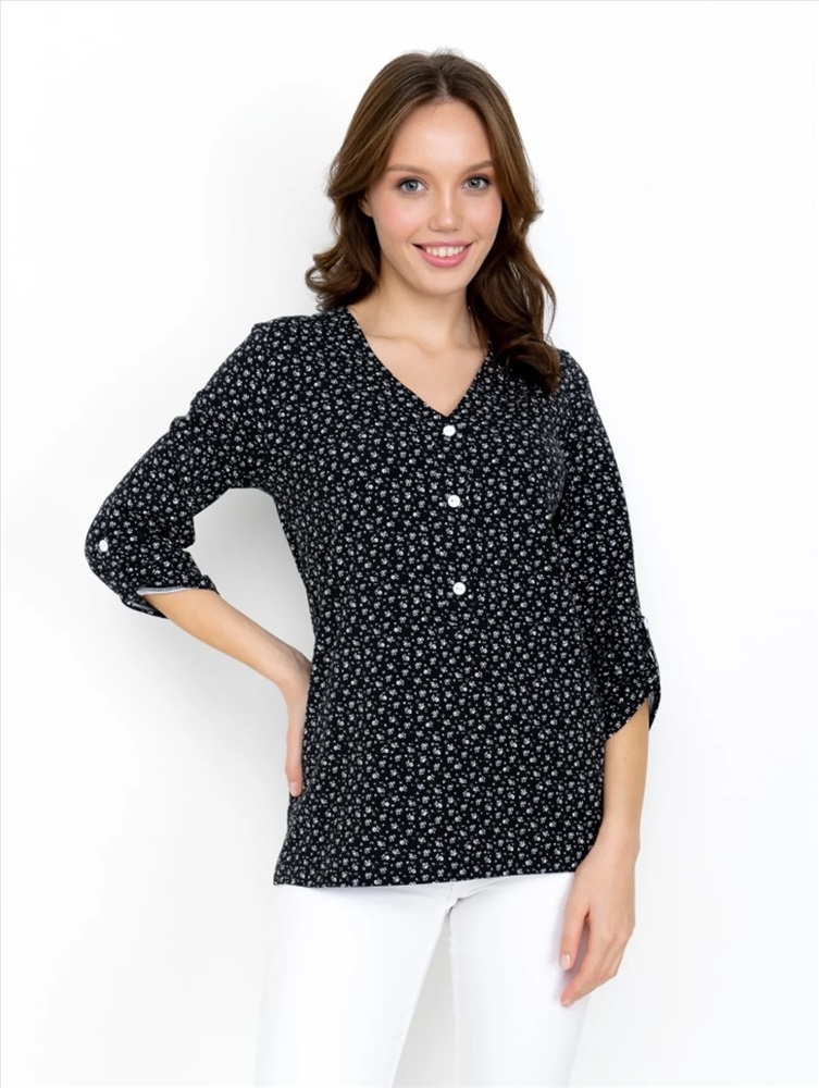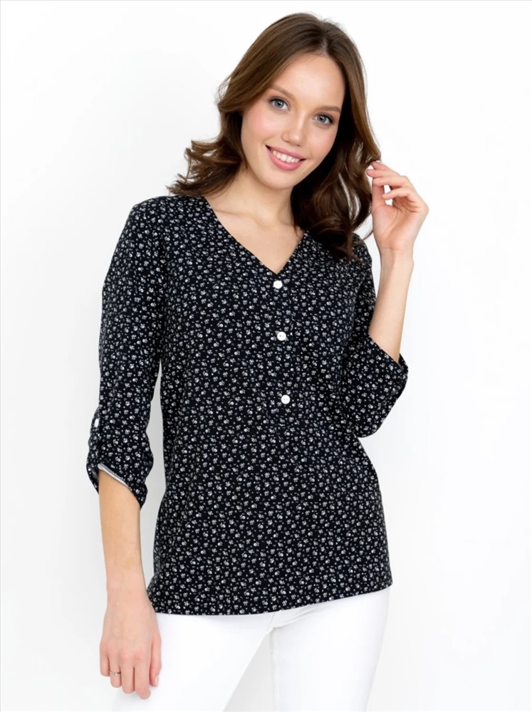 Женский джемпер полуприлегающего силуэта. V- образная горловина переходит в короткую планку на пуговицах. Рукава 3/4, с патами.
