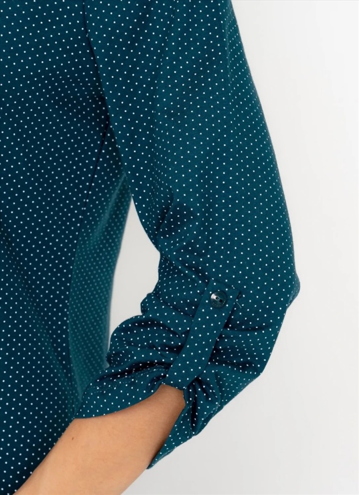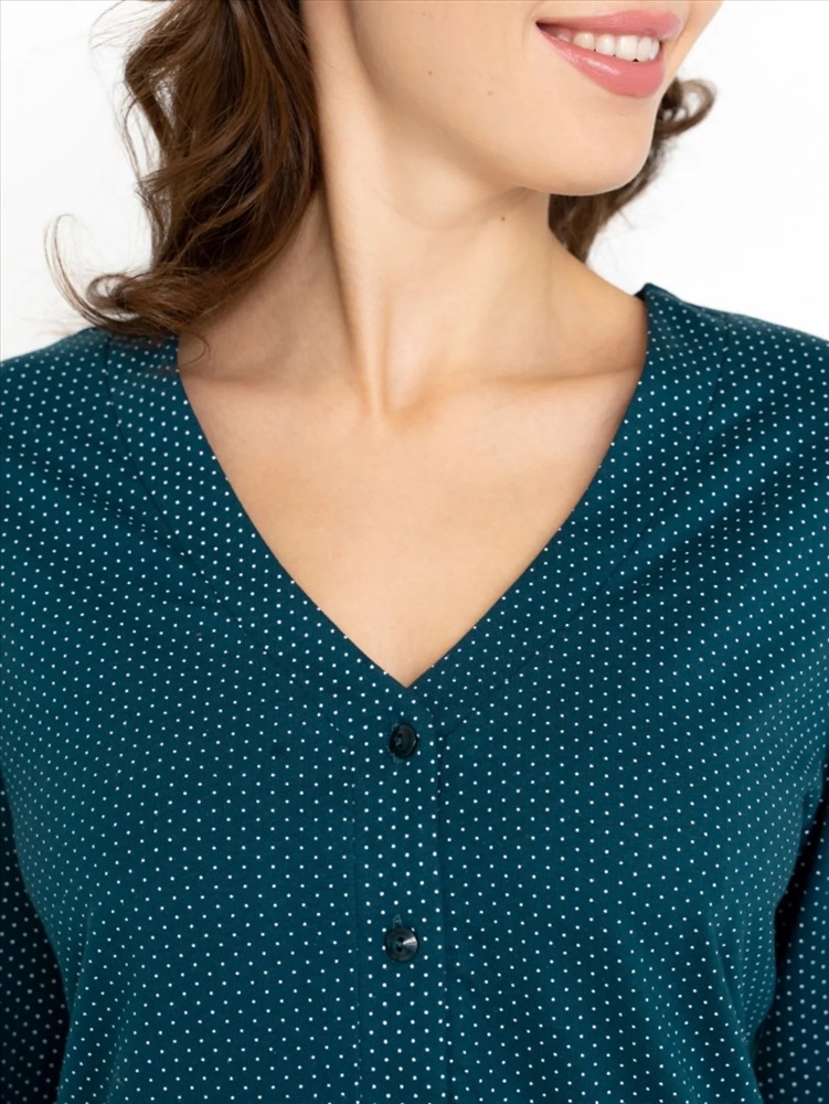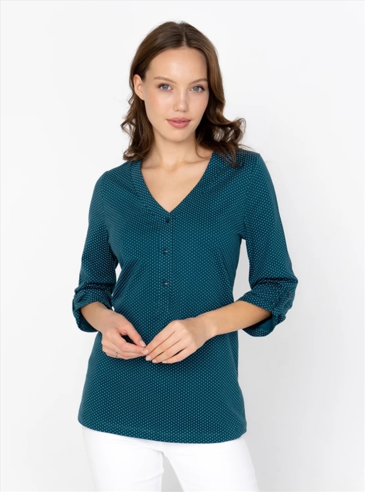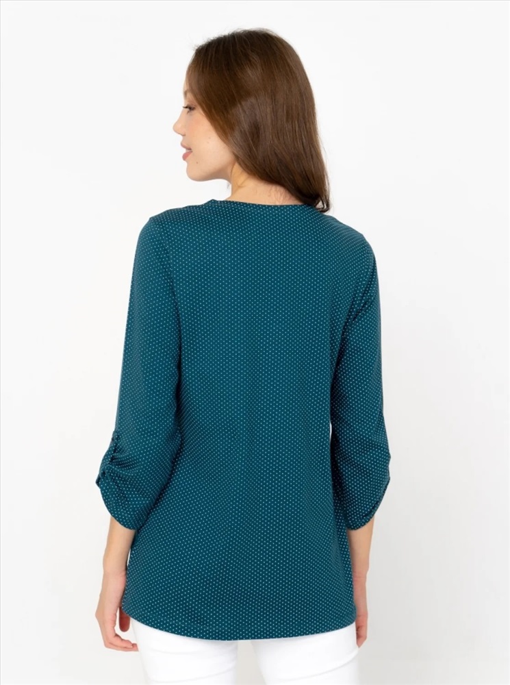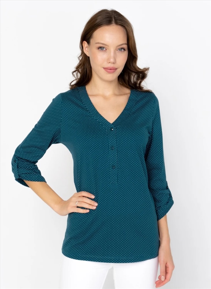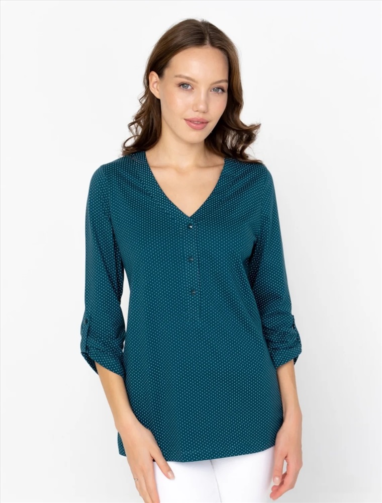 Женский джемпер полуприлегающего силуэта. V- образная горловина переходит в короткую планку на пуговицах. Рукава 3/4, с патами.