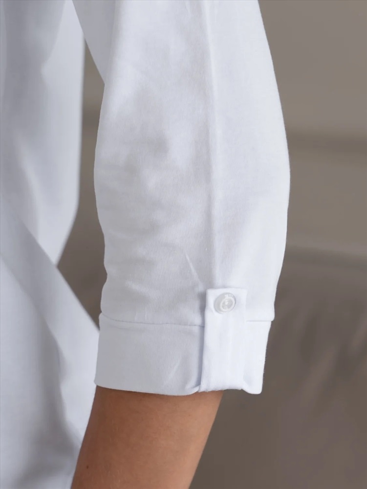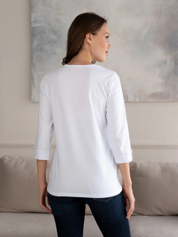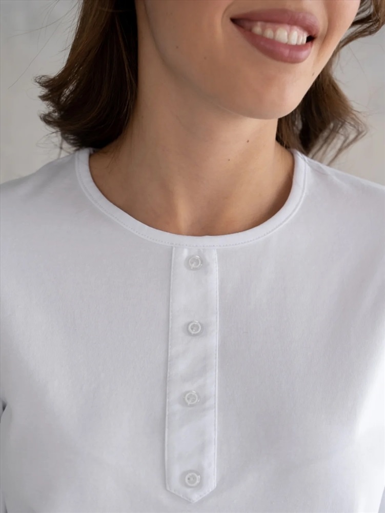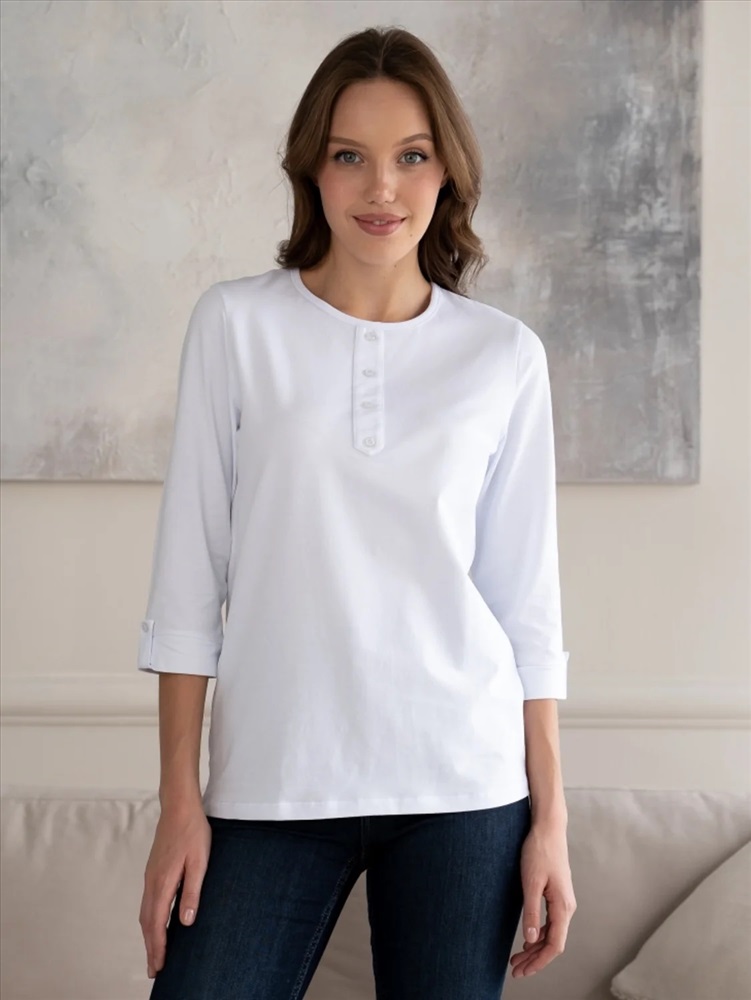 Женский трикотажный джемпер прилегающего силуэта с круглой горловиной и декоративной планкой с пуговицами. Втачные рукава ¾ на манжетах украшены патами.
