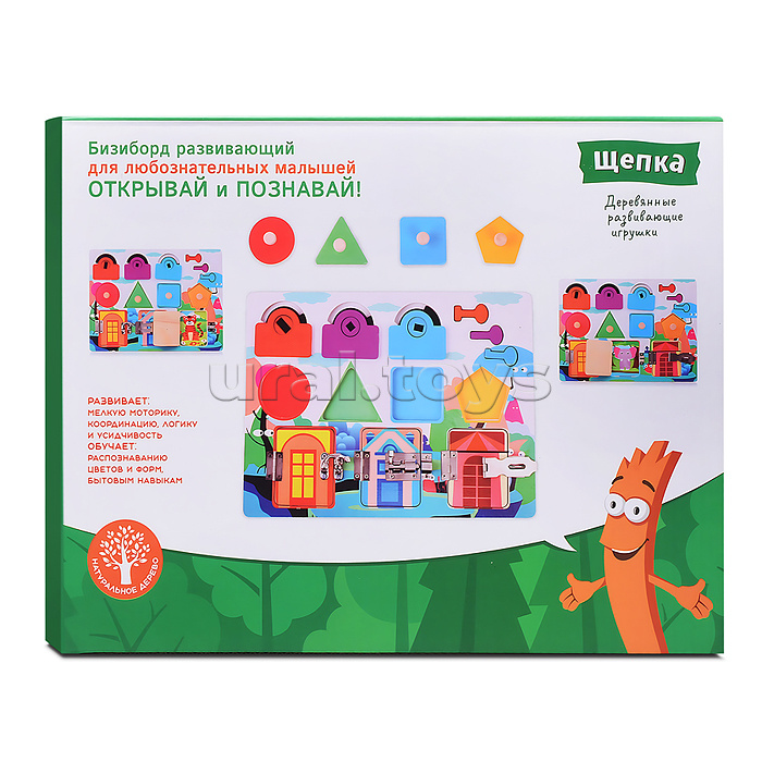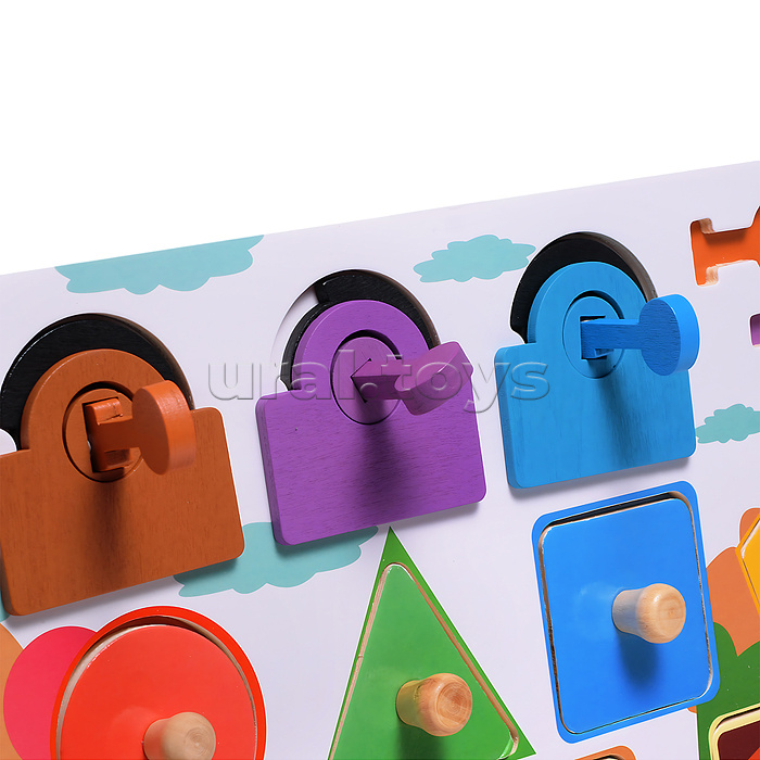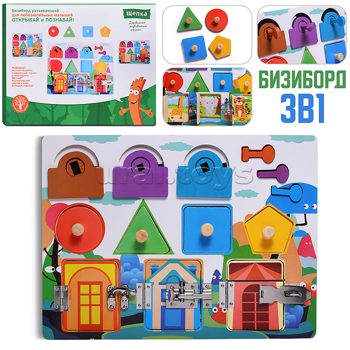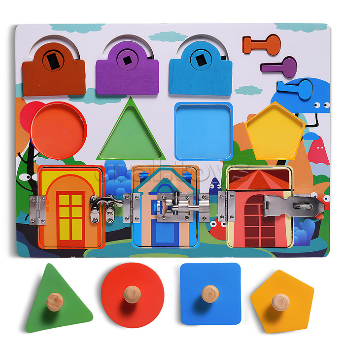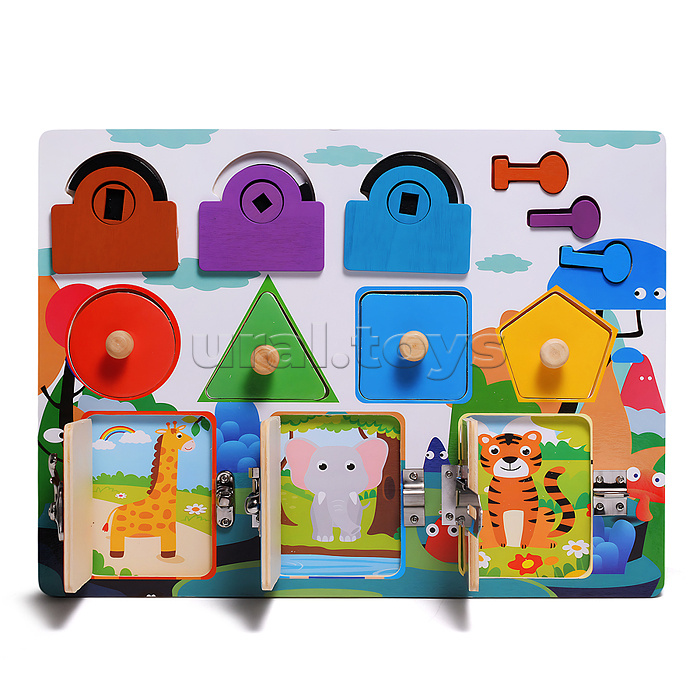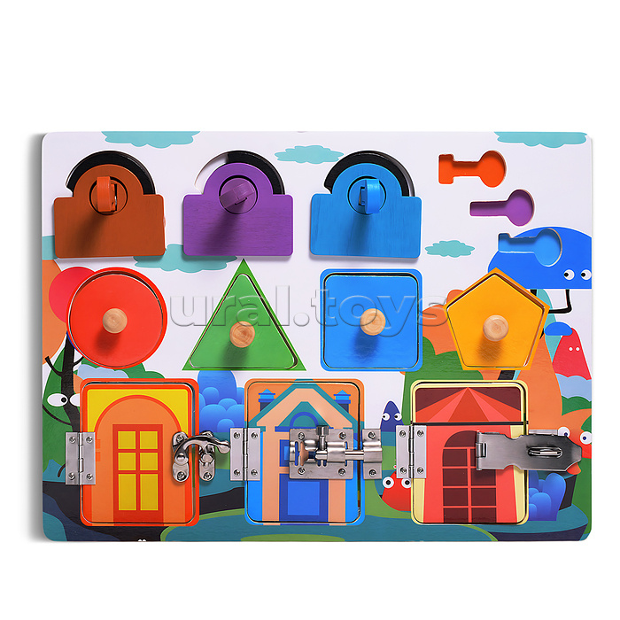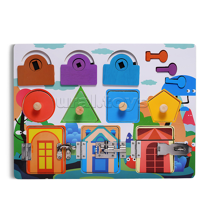 • Размеры игрушки: 30х22.5 см. • 3 замка отпрывающиеся разными ключами. • 4 вкладыша разной формы. • 3 дверцы с металлическими замками. • Материалы: дерево, металл. • Соответствует требованиям безопасности продукции. • Для детей от 3-х лет.