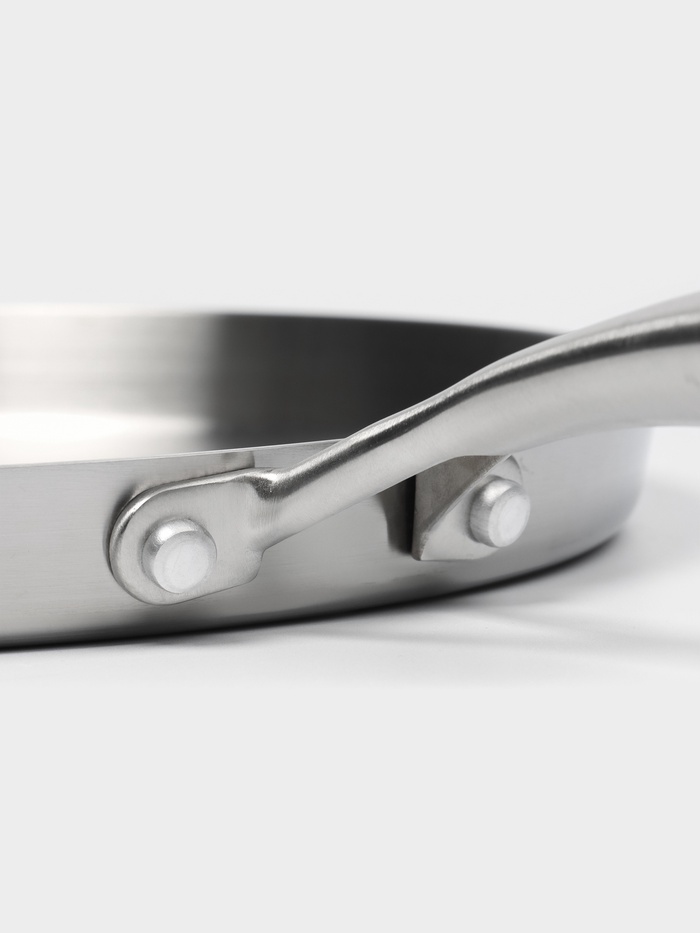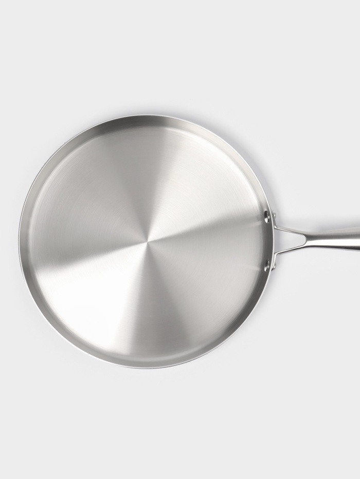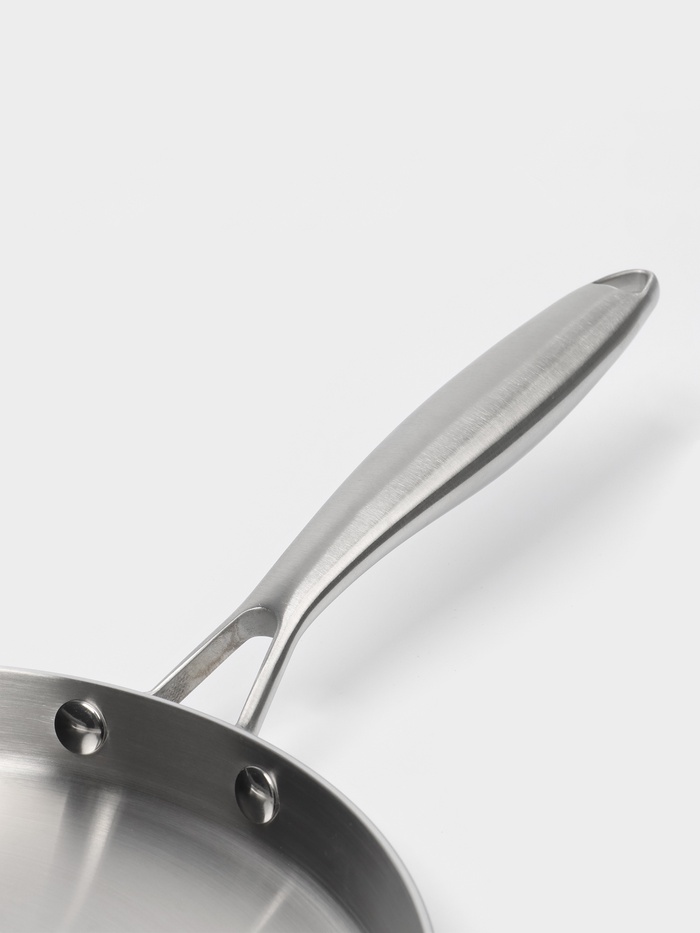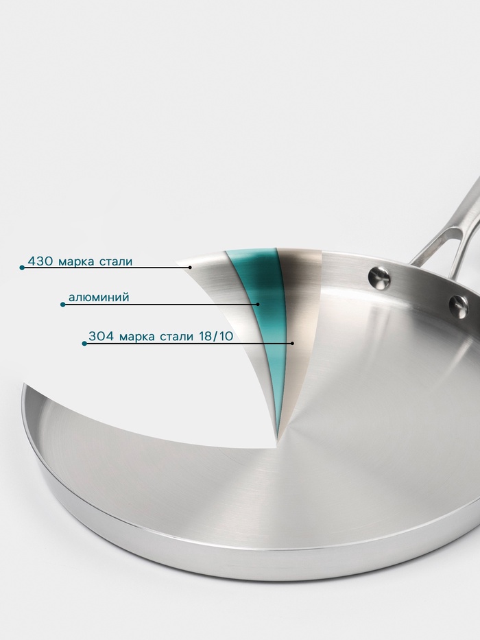 Благодаря технологи 3PLY 3 цельных листа металла объединяются в единую монолитную форму, состоящую из внутреннего слоя нержавеющей стали марки AISI 304, центрального слоя алюминия, и внешенего слоя 430 AISI, что позволяет сковороде работать на любом типе плит, включая индукционные, а также обеспечивает равномерный нагрев и хорошую теплопроводимость, что делает её универсальным инструментом для любой кухни.