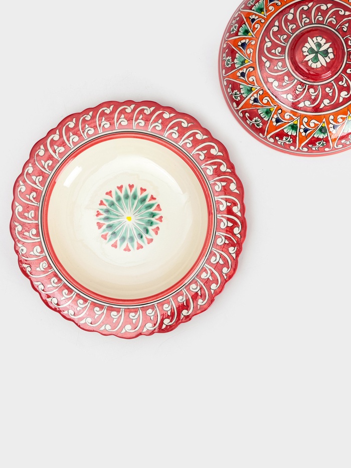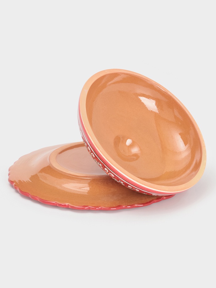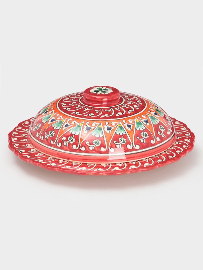 Риштанская блинница «Красные цветы», 24 см: керамика ручной работы, создающая атмосферу тепла и уюта. Прекрасно подходит для подачи блинов, пирогов или закусок. Красный цвет и цветочные узоры привнесут яркие краски на ваш стол.