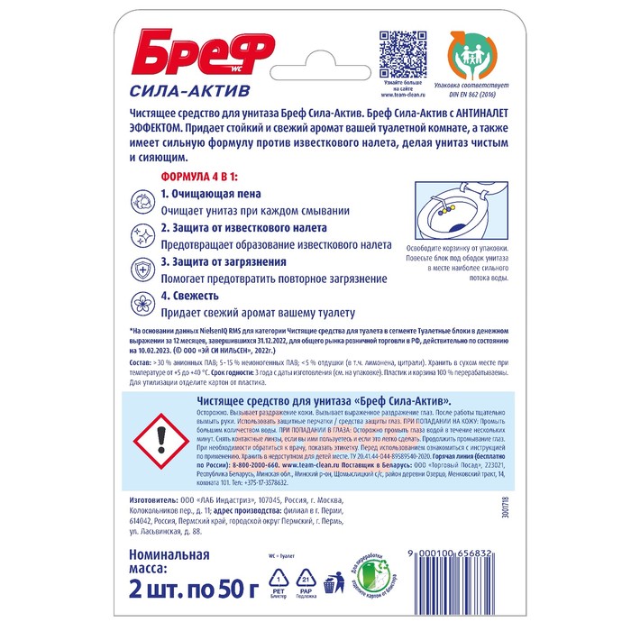 Габариты: 13 x 19 x 4 Страна: Россия В боксе: 10 набор В наборе: 2 набор Состав: См. на упаковке Материалы: см. на упаковке Фасовка: по 1 набор Индивидуальная упаковка: Без упаковки Габариты товара: 3,5 см × 12,5 см × 19 см Сертификат: Не подлежит сертификации Вес, г/Объём, мл: 100 Аромат: Лимон Назначение: Для туалета Вид средства: Сменный блок Бреф Сила-Актив с АНТИНАЛЕТ ЭФФЕКТ – подвесной туалетный блок с формулой против известкового налета. Активная формула с антиналет эффектом действует в 4 направлениях:
