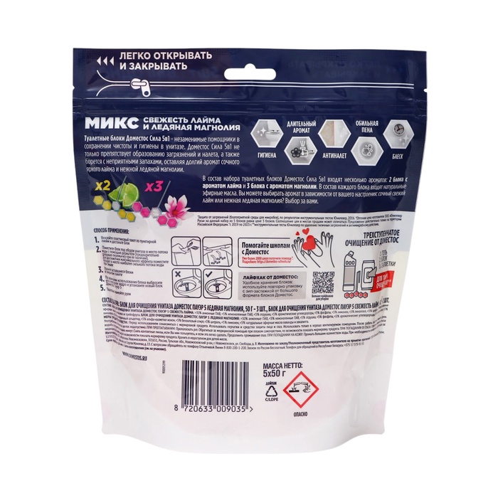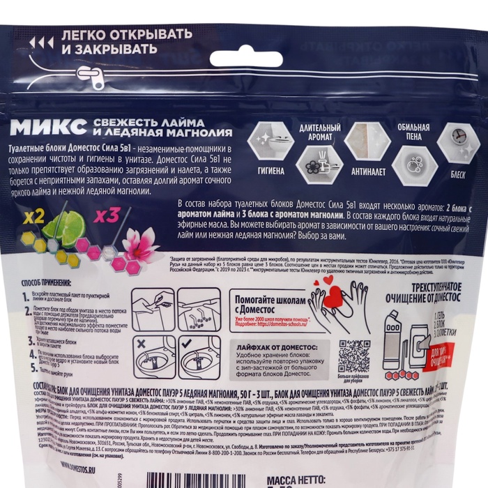 Габариты: 21 x 8 x 18 Страна: Россия В боксе: 5 шт Состав: См. на упаковке Материалы: см. на упаковке Фасовка: по 1 шт Индивидуальная упаковка: Без упаковки Сертификат: Не подлежит сертификации Аромат: Лайм, Магнолия Вид средства: Сменный блок Попробуйте блоки для очищения туалета Domestos Свежесть лайма или Ледяная магнолия против известкового налета и неприятного запаха. Выбирайте аромат блоков Domestos Power 5 в зависимости от вашего настроения: сочный свежий лайм или нежная ледяная магнолия. Блок для очищения унитаза Доместос содержит активное вещество, которое смывает бактерии и борется с появлением известкового налета. Средство наполняет комнату ярким ароматом, который помогает предотвращать неприятные запахи и остается в течение длительного времени после смывания — до 4 часов. Вскройте пластиковый пакет по пунктирной линии и достаньте блок Свежесть лайма или Ледяная магнолия. Поместите его под ободок унитаза в место наиболее сильного потока воды с помощью держателя. По окончании использования блока Domestos Power 5 выбросите его в мусорное ведро и установите новый блок из упаковки. Храните оставшиеся блоки в закрытом пакете – так они дольше сохранят свои ароматы! Комментарии к товару