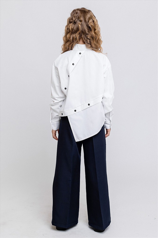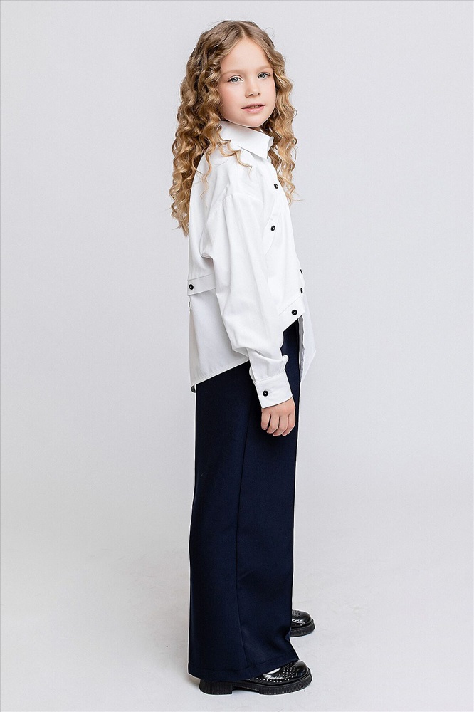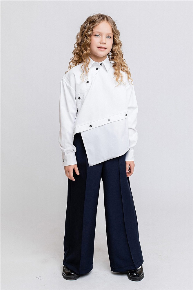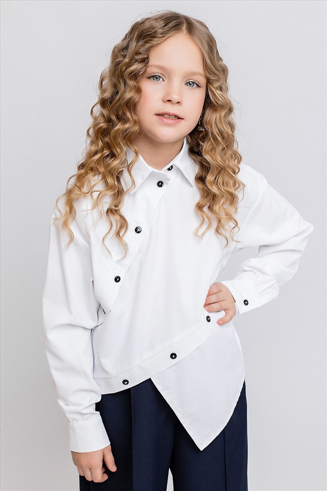 Блузка для девочки белая оверсайз с длинными рукавами. Ассиметричная застежка на пуговки. Элегантная блузка для школы выполнена из сорочечной ткани, смотрится стильно и оригинально.