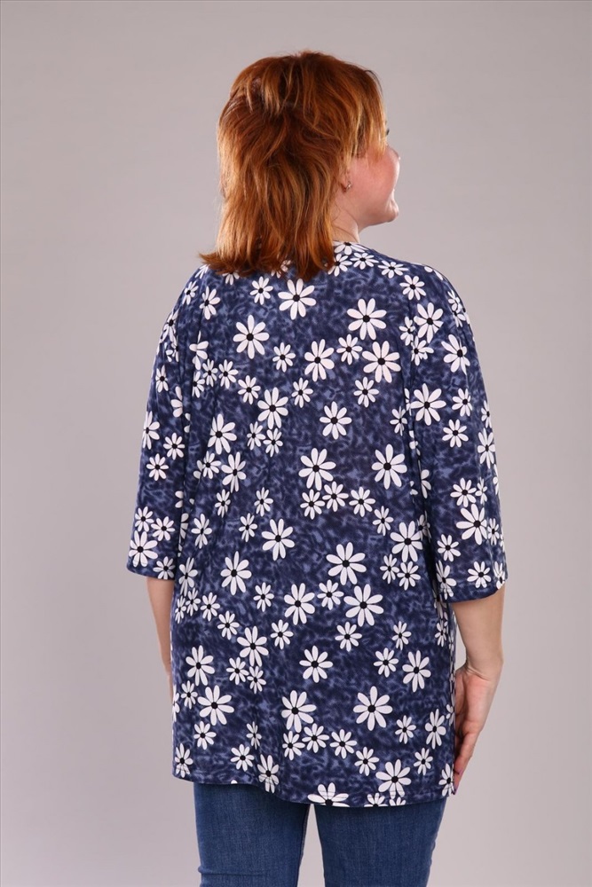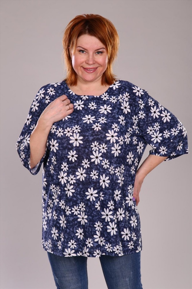 Легкая блузка свободного кроя, без воротника с рукавами 3/4. Эффектная модель, которая подчёркивает достоинства фигуры. Хорошо сочетается с классическими брюками, джинсами, юбками и жакетами. Материал изделия хорошо держит форму и приятен к телу.
