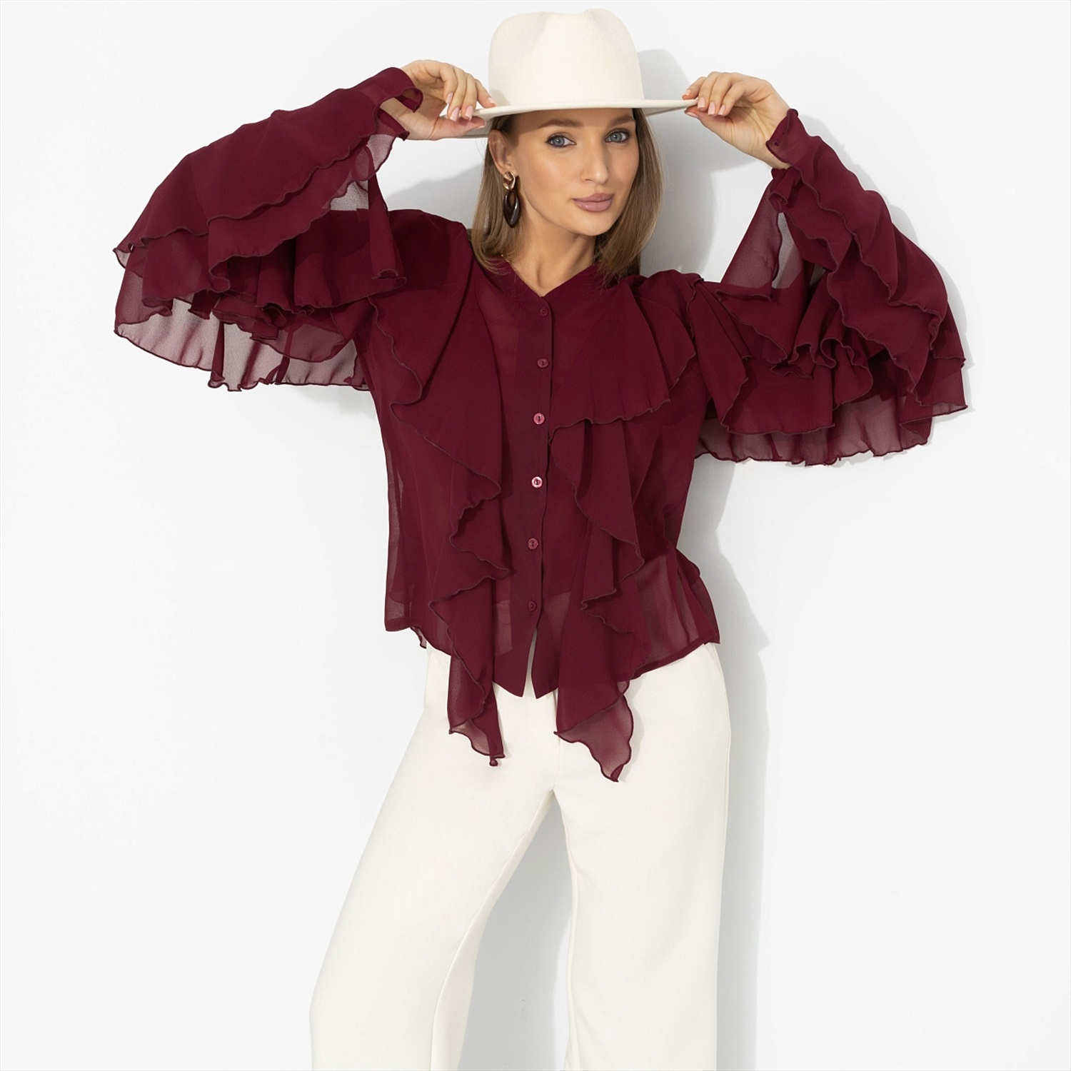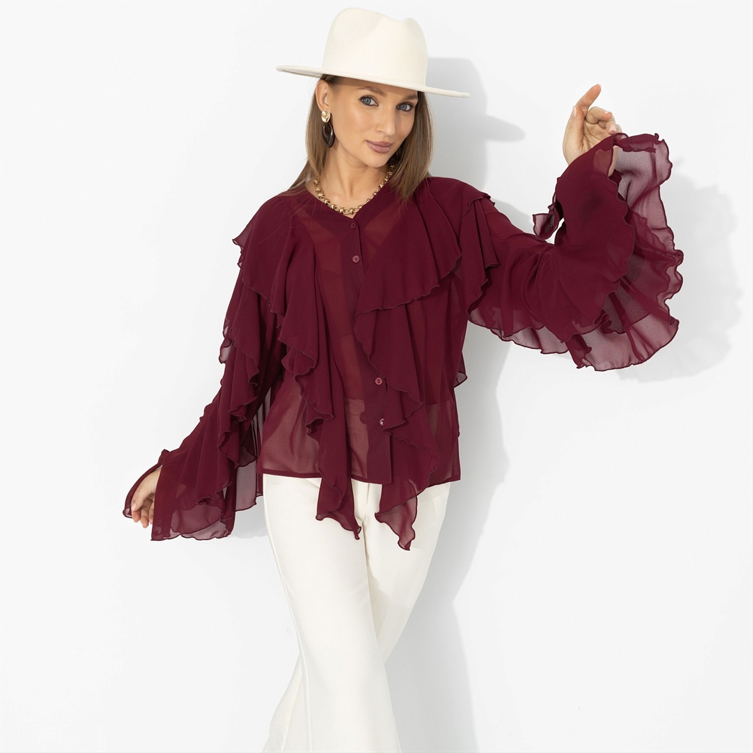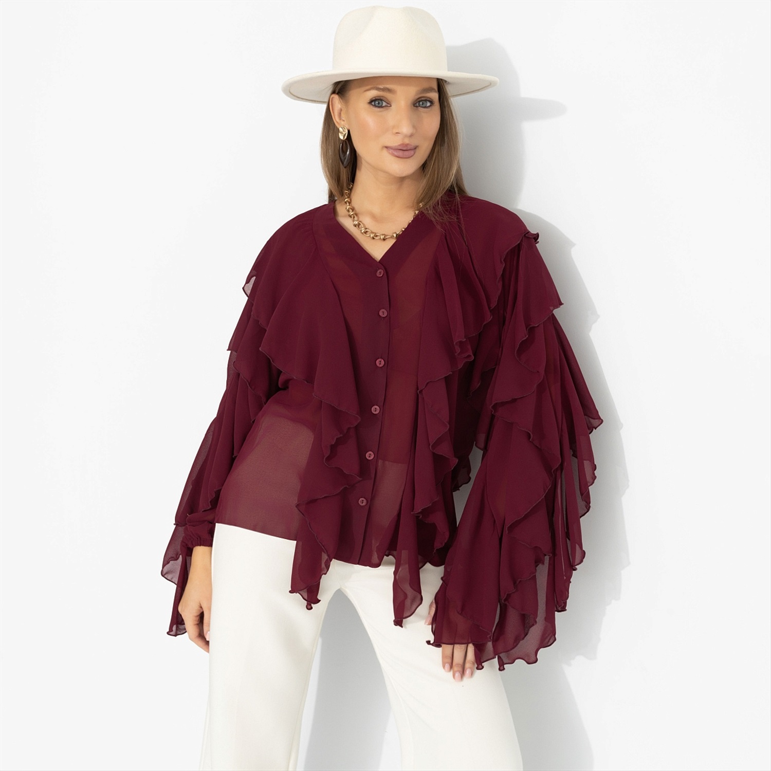 Представь: ты выходишь из особняка на берегу Босфора – и ветер играет рукавами твоей блузы, как в лучших сценах турецких сериалов. Глубокий винный оттенок звучит страстно, шифон струится и создаёт воздушный эффект, многослойные воланы двигаются в такт каждому шагу. Это не просто образ – а момент, когда в одном кадре роскошь и стиль. Комментарии к товару