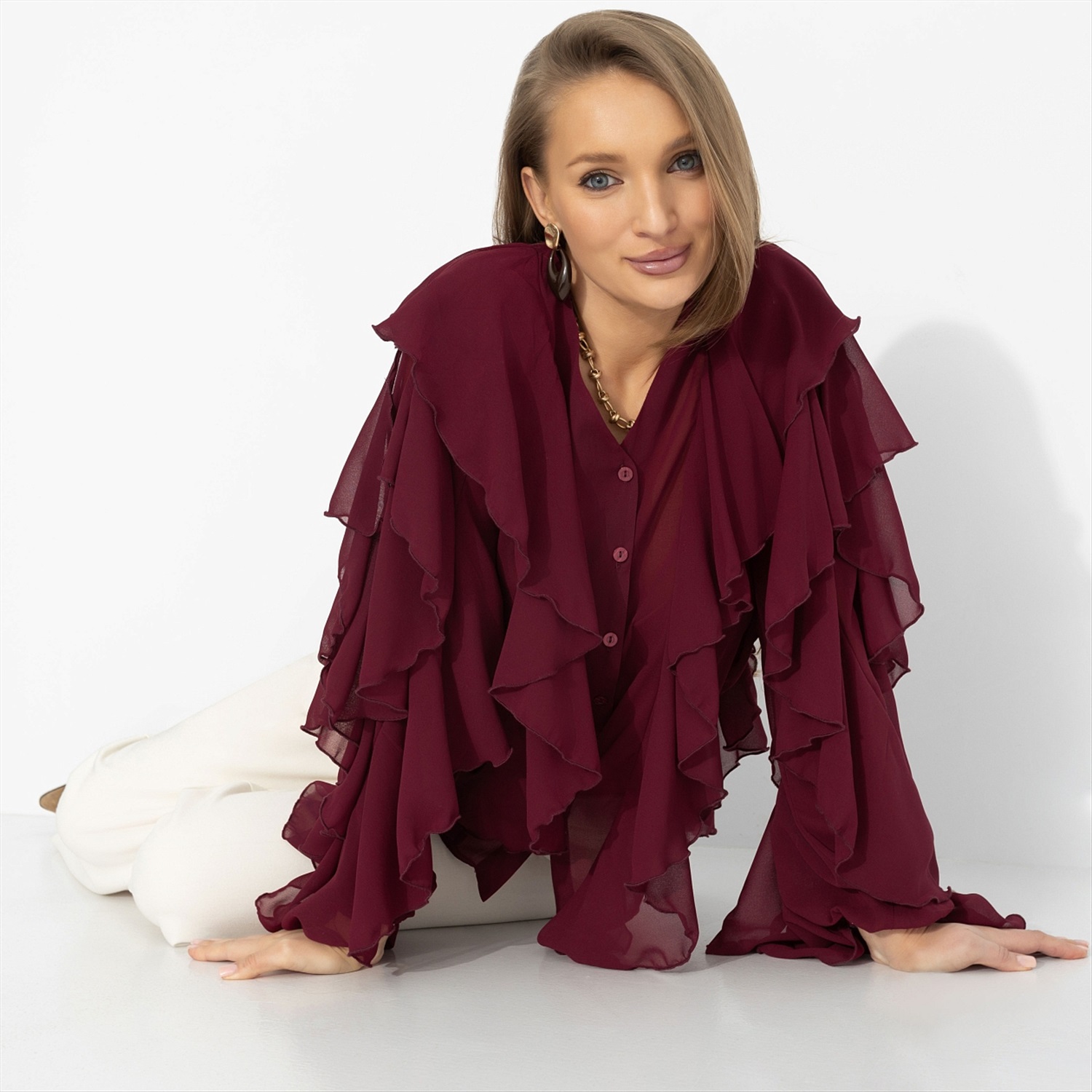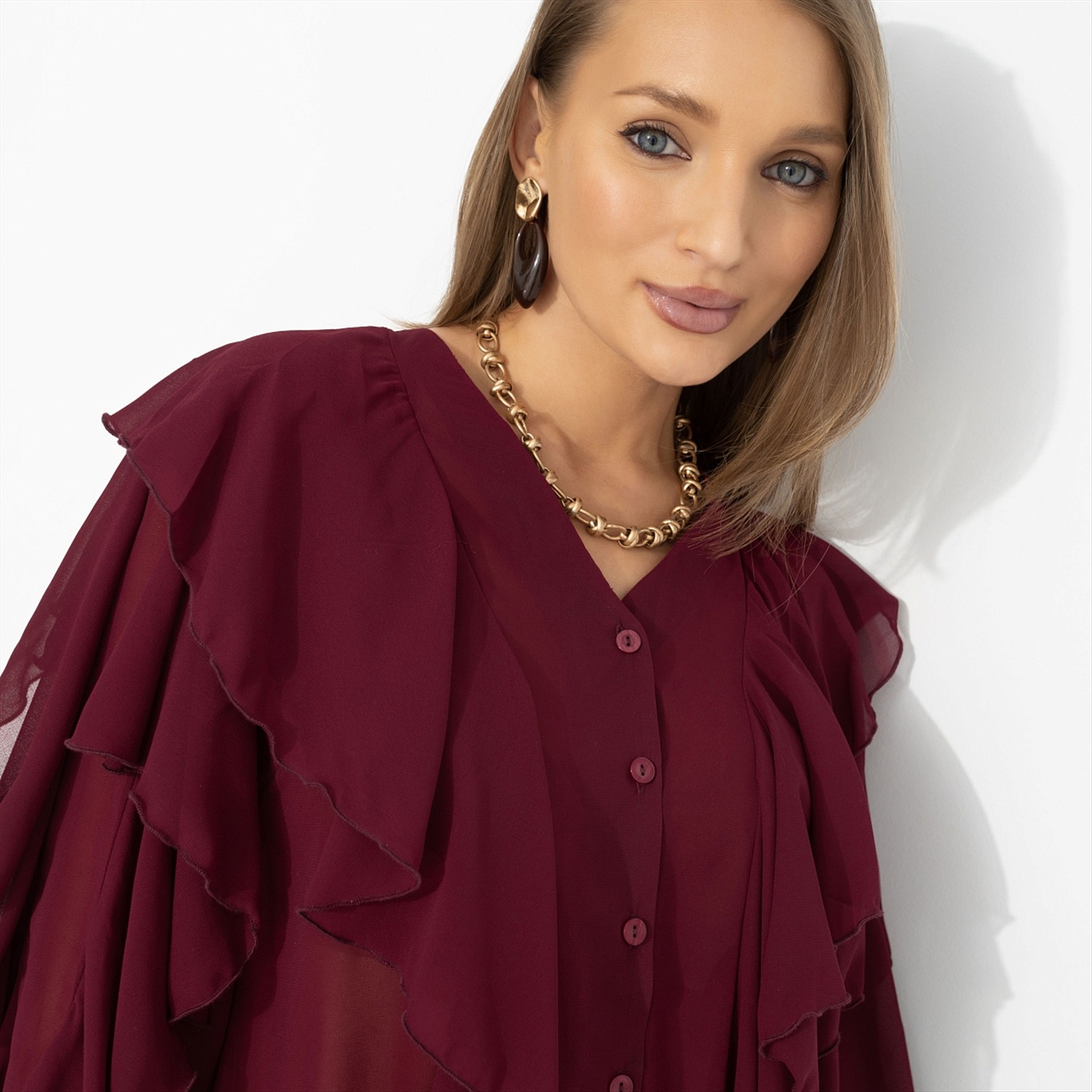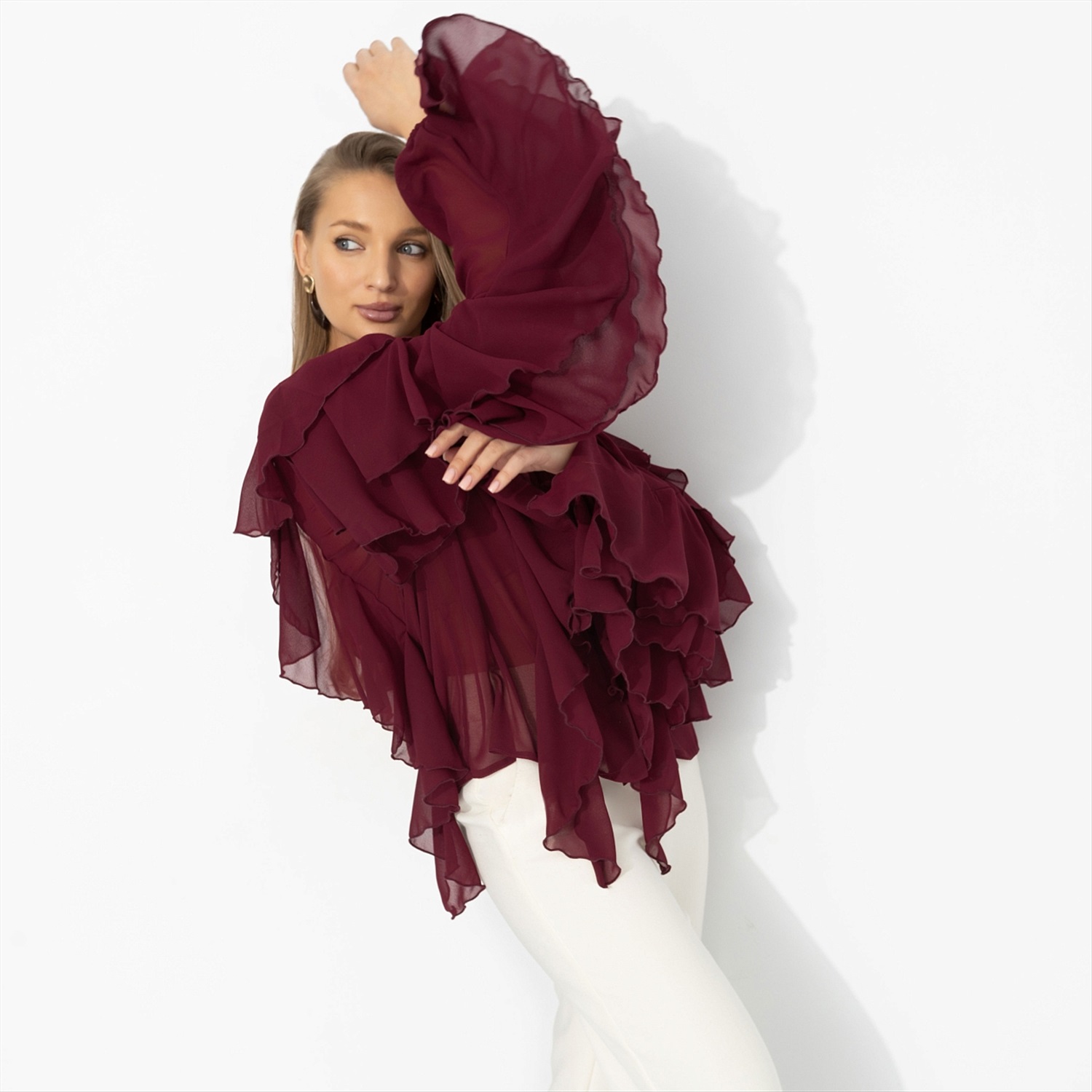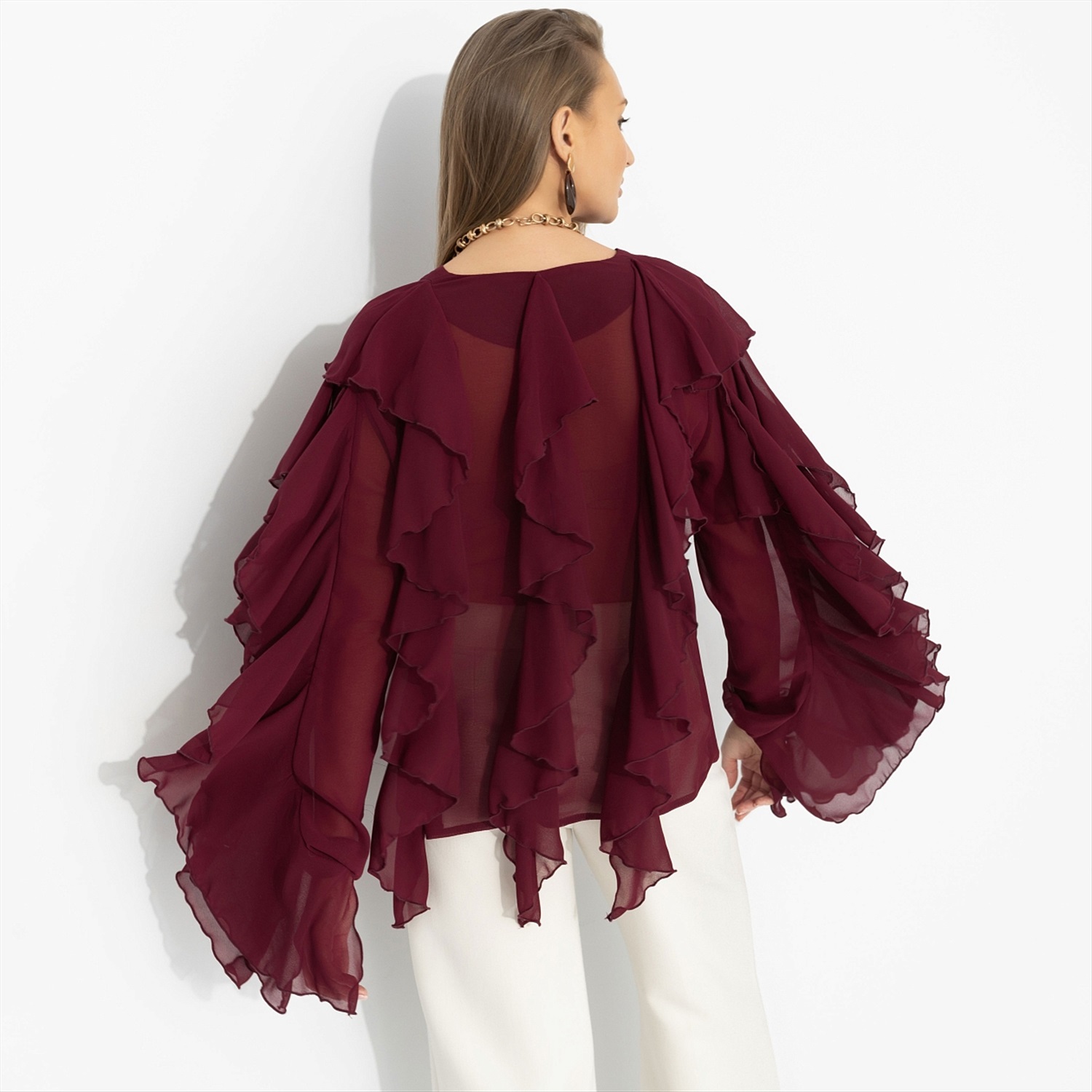 Представь: ты выходишь из особняка на берегу Босфора – и ветер играет рукавами твоей блузы, как в лучших сценах турецких сериалов. Глубокий винный оттенок звучит страстно, шифон струится и создаёт воздушный эффект, многослойные воланы двигаются в такт каждому шагу. Это не просто образ – а момент, когда в одном кадре роскошь и стиль. Комментарии к товару