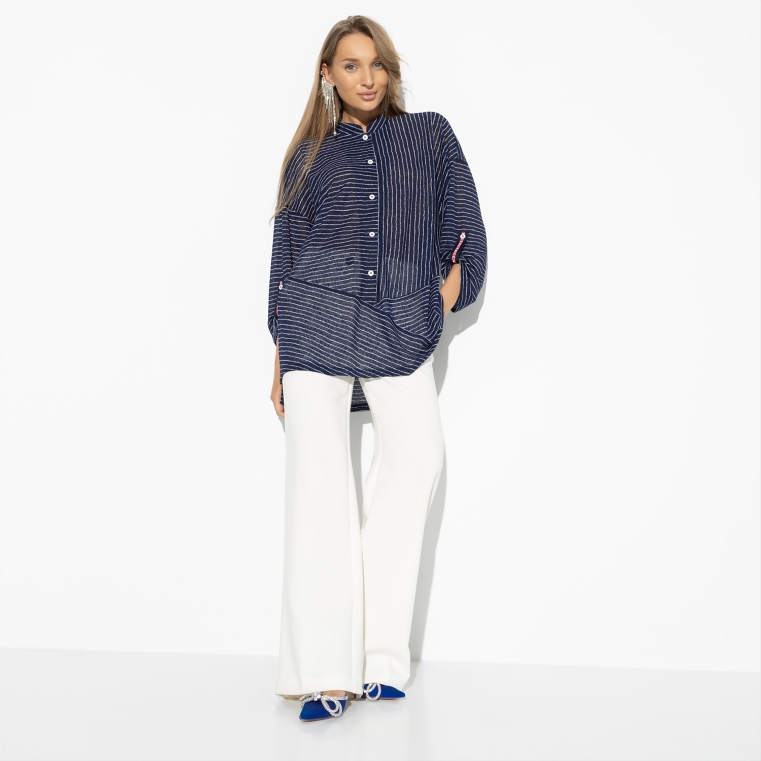Состав: Трикотаж «дорис» (95% п/э, 5% спандекс) Плотность ткани: Тонкая Тип ткани: Трикотаж Вид застежки: Пуговица/-ы Дополнительный цвет ткани: Белый Карманы: Нет Основной цвет ткани: Синий Отрезная талия: Нет Подклад: Нет Резинка по талии: Нет Рисунок/раппорт: Каждое изделие уникально из-за расположения рисунка на ткани Сезон: Круглогодичный Силуэт: Свободный Стиль: Повседневный Параметры модели на фото: