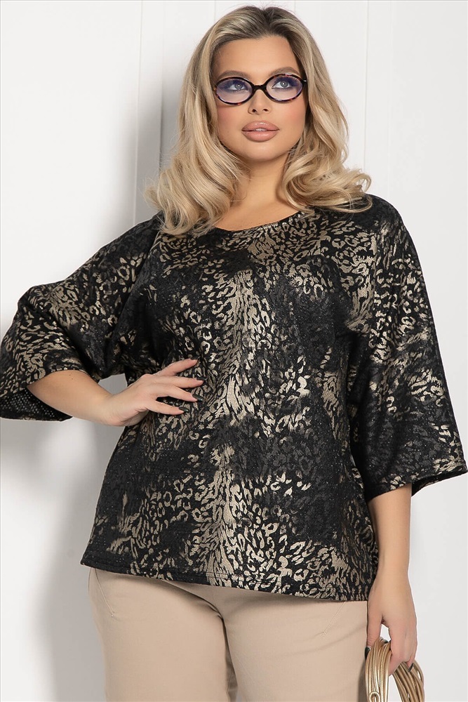ID товара: 1084947 Состав: 65% Вискоза, 30% Полиэстер, 5% Эластан Сезон: Демисезон Длина: Средняя Фасон: Свободный Рукав: 3/4 Вырез горловины: Округлый Рисунок: Анималистичный Декоративные элементы: Принт Основная ткань: Вискоза Стиль: классический Страна бренда: Россия Страна производства: Россия Артикул: Б12535-27. Тип ткани: смесовая. Состав: 65% вискоза, 30% полиэстер, 5% эластан. Материал: трикотаж. Цвет: черно-золотой. Принт: отсутствует. Вид застежки: без застёжки. Силуэт: оверсайз. Карманы: отсутствуют. Подкладка: отсутствует. Декоративные элементы: отсутствуют. Длина по спинке от верхней точки плеча: 46/ 69 см, 48-50/ 70 см, 52-54/ 71 см, 56/ 72 см. Размер изделия на модели: 52 Рост модели: 170 см. Внесите неповторимый штрих в свой гардероб с помощью этой уникальной блузкой! Он станет ярким акцентом, который украсит любой образ, будь то для повседневной носки или для особых случаев. Блуза свободного кроя с рукавами три четверти обеспечивает комфорт и свободу движений. Уход за изделием: ручная стирка до 30 градусов; нельзя отбеливать; отжим запрещён; гладить при t не более 110 С; гладить с изнанки. Внимание! Рекомендуем ориентироваться на размерную сетку и выбирать свой привычный размер, согласно размерной таблице. *Допуск отклонения длины при массовом производстве 1-3 см является нормой. Комментарии к товару