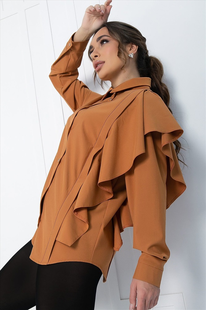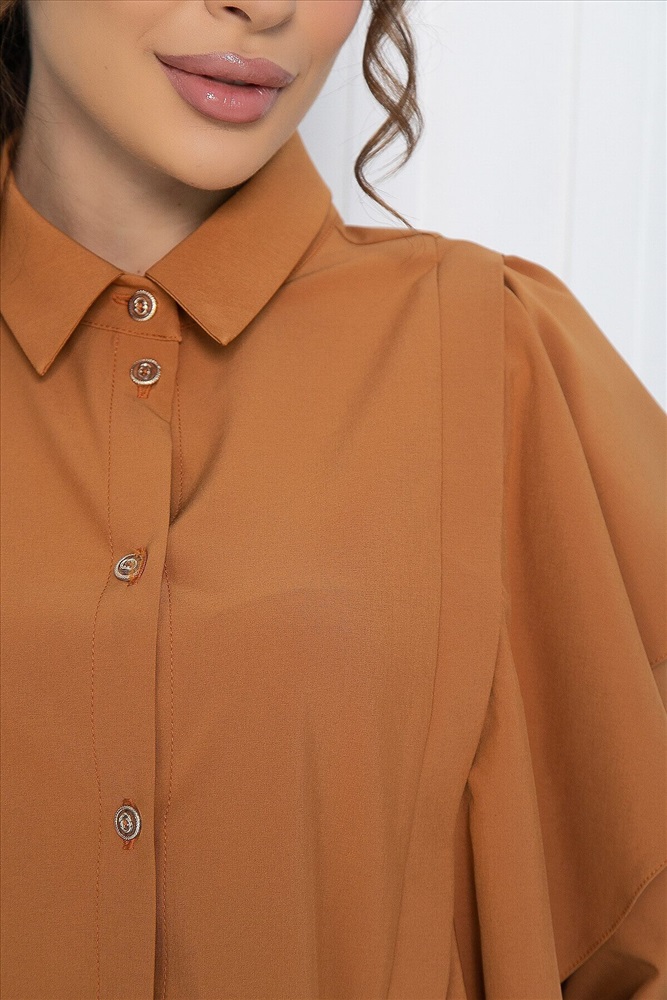 ID товара: 1085470 Состав: 65% Полиэстер, 30% Вискоза, 5% Эластан Сезон: Демисезон Длина: Средняя Фасон: Свободный Рукав: длинные Вид застежки: Пуговицы Вырез горловины: Отложной воротничок Декоративные элементы: Волан Основная ткань: Полиэстер Стиль: классический Страна бренда: Россия Страна производства: Россия Артикул: Б12030. Тип ткани: смесовая. Состав: 65% полиэстер, 30% вискоза, 5% эластан. Материал: блузочный. Цвет: горчицы. Принт: отсутствует. Вид застежки: пуговицы. Силуэт: свободный. Карманы: отсутствуют. Подкладка: отсутствует. Декоративные элементы: волан по левому плечу (съёмный). Длина по спинке от верхней точки плеча: 44/ 71 см, 46/ 73 см, 48-54/ 74 см. Размер изделия на модели: 44 Рост модели: 167 см. Элегантная рубашка в насыщенном горчичном оттенке станет заметным акцентом в вашем образе. Особенность этой модели — аккуратный волан, который крепится на пуговицы с левой стороны. Благодаря этому элементу рубашка выглядит более непринуждённо и романтично, что делает её подходящей как для вечерних мероприятий, так и для романтических свиданий. Втачные рукава с манжетами на пуговице обеспечивают комфорт, а отложной воротник с стойкой придаёт образу элегантность. Уход за изделием: ручная стирка до 30 градусов; нельзя отбеливать; отжим запрещён; гладить при t не более 110 С; гладить с изнанки. Внимание! Рекомендуем ориентироваться на размерную сетку и выбирать свой привычный размер, согласно размерной таблице. *Допуск отклонения длины при массовом производстве 1-3 см является нормой. Комментарии к товару