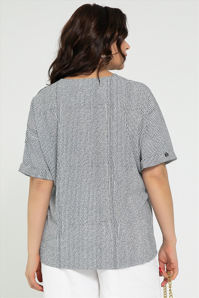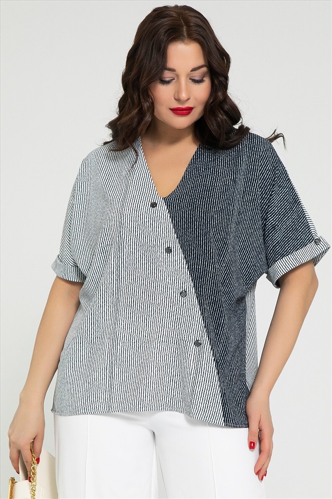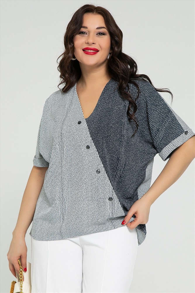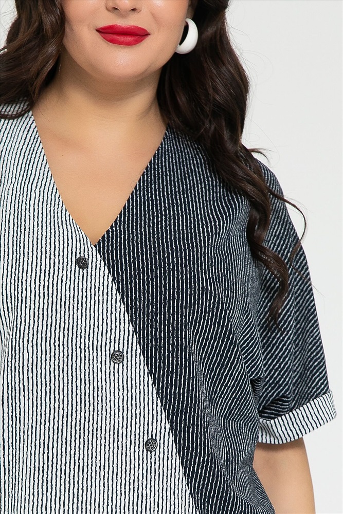 ID товара: 1090809 Состав: 98% Полиэстер, 2% Эластан Сезон: Демисезон Длина: Средняя Фасон: Свободный Рукав: короткие Вырез горловины: V-образный Рисунок: Полоски Декоративные элементы: Пуговицы Основная ткань: Полиэстер Стиль: повседневный Страна бренда: Россия Страна производства: Россия Артикул: Б12846-27М. Тип ткани: синтетический. Состав: 98% полиэстер, 2% эластан. Материал: блузочный. Цвет: белый. Принт: полоска. Вид застежки: без застёжки. Силуэт: оверсайз. Карманы: отсутствуют. Подкладка: отсутствует. Декоративные элементы: в виде пуговиц. Длина по спинке от верхней точки плеча: 54/ 68 см, 56/ 69 см, 58/ 70 см, 60/ 71 см, 62/ 72 см. Размер изделия на модели: 50 Рост модели: 170 см. Блузка отснята с брюками арт. Б12685-13 Откройте для себя идеальную комбинированную блузку из ткани двух расцветок, которая станет вашим любимым элементом гардероба. Блуза, оригинально декорированная пуговицами станет отличным выбором для тех, кто ценит комфорт и стиль в одном. Прекрасно смотрится в сочетании с другими элементами гардероба. Уход за изделием: ручная стирка до 30 градусов; нельзя отбеливать; отжим запрещён; гладить при t не более 110 С; гладить с изнанки. Внимание! Рекомендуем ориентироваться на размерную сетку и выбирать свой привычный размер, согласно размерной таблице. *Допуск отклонения длины при массовом производстве 1-3 см является нормой. Комментарии к товару