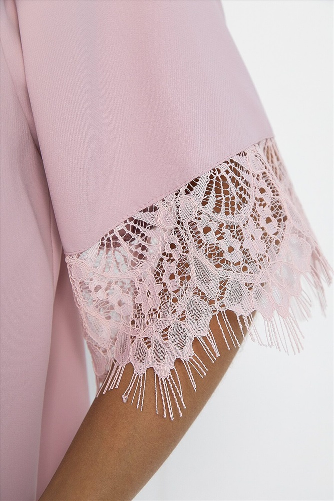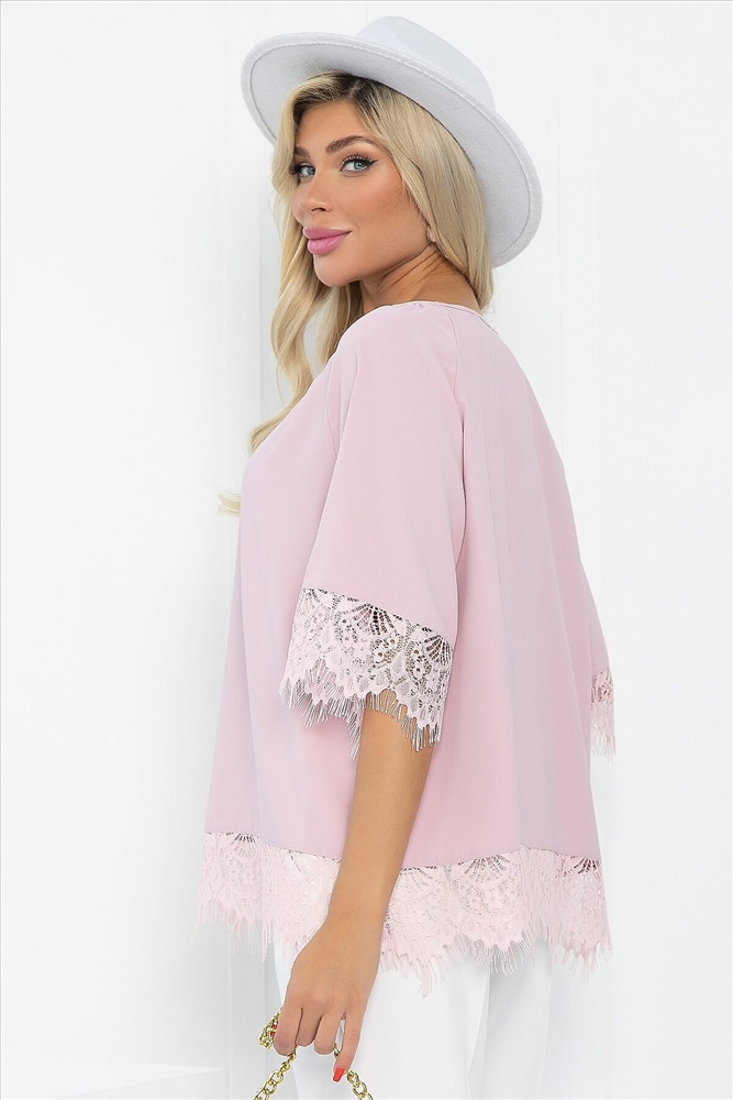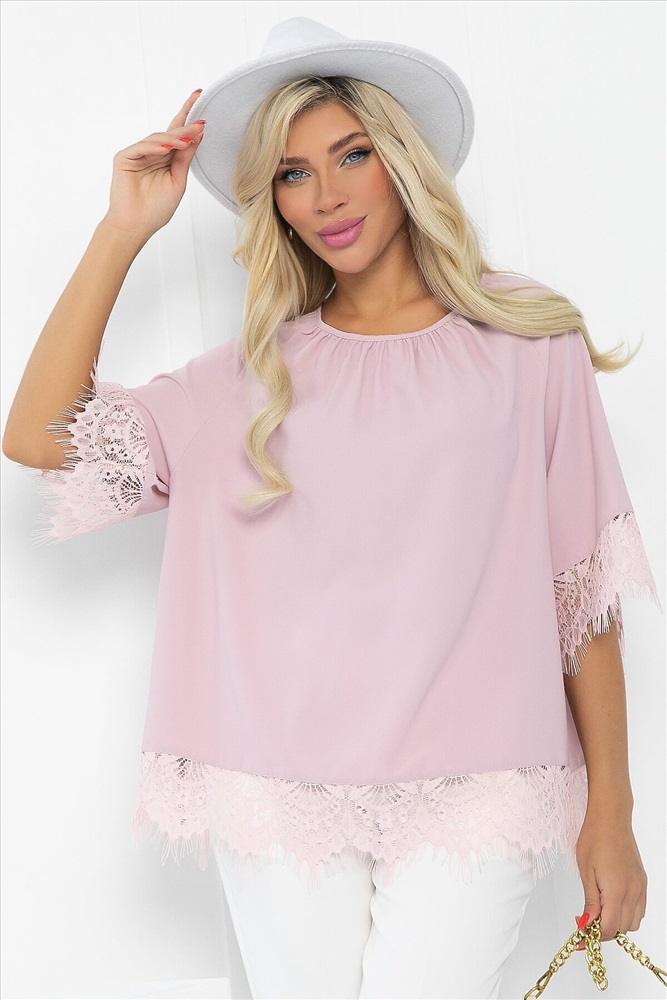 Артикул: Б13006-30М. Тип ткани: синтетический. Состав: 98% полиэстер, 2% эластан. Материал: блузочный. Цвет: розовый. Принт: отсутствует. Вид застежки: без застёжки. Силуэт: А-силуэт. Карманы: отсутствуют. Подкладка: отсутствует. Декоративные элементы: кружево. Длина по спинке от верхней точки плеча: 48-52/ 63 см, 54-56/ 64 см. Размер изделия на модели: 44