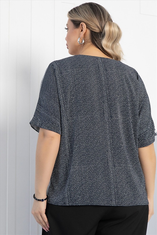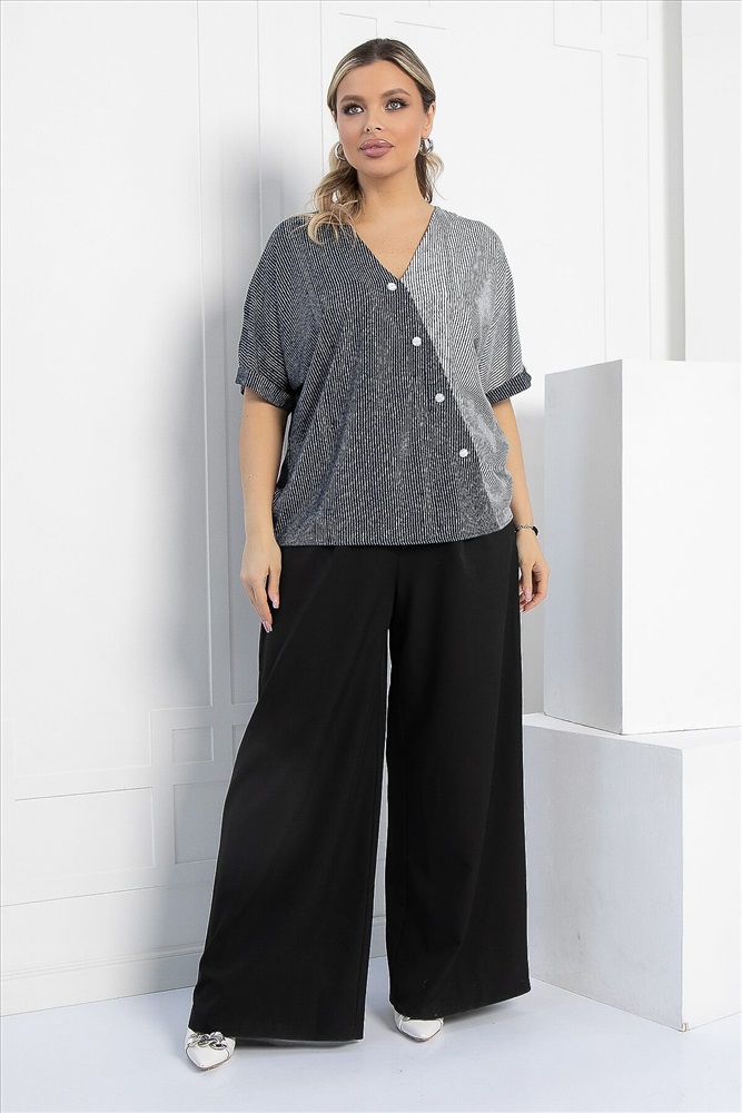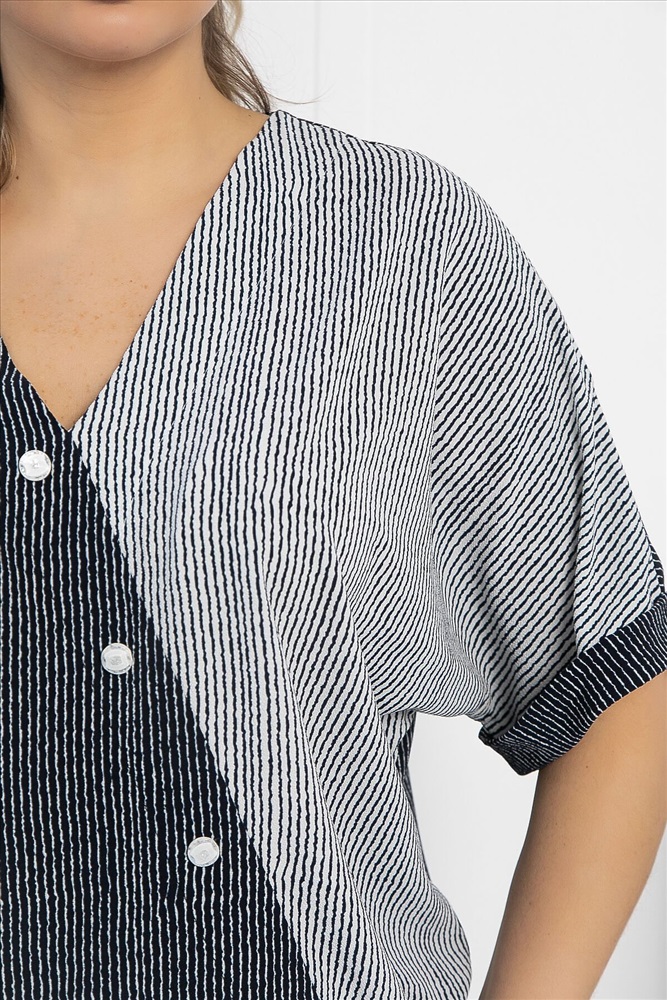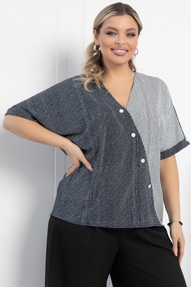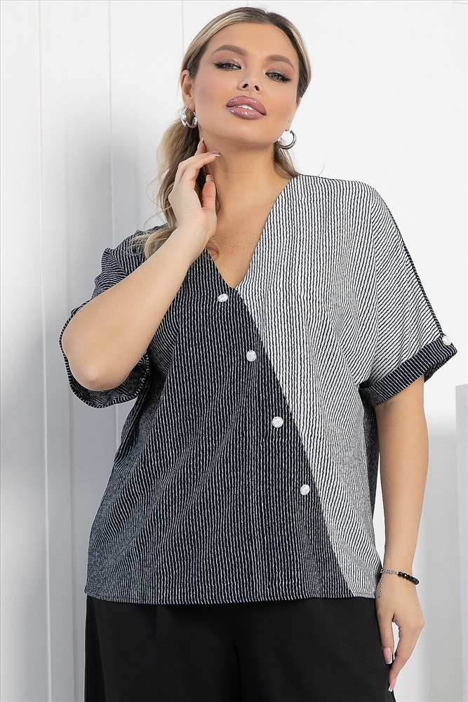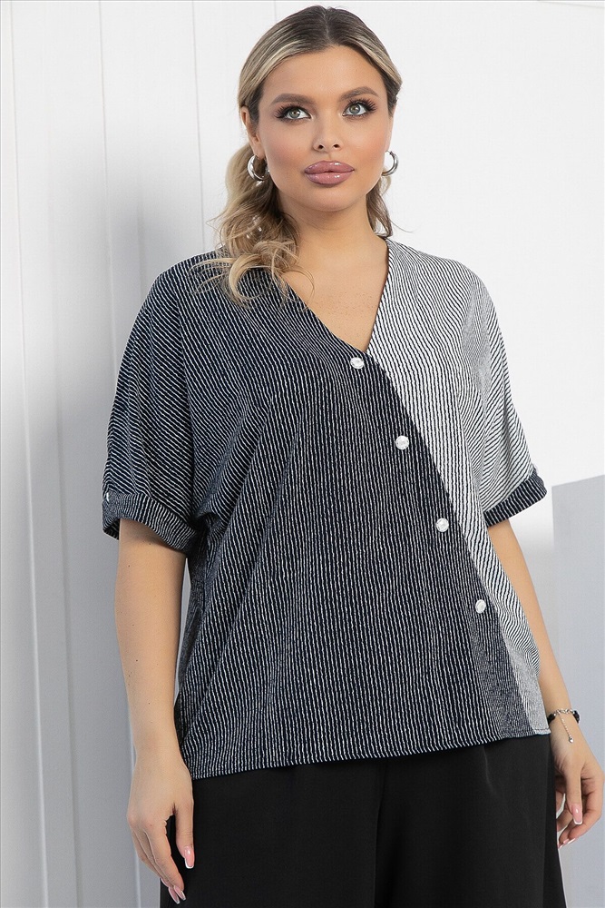 Откройте для себя идеальную комбинированную блузку из ткани двух расцветок, которая станет вашим любимым элементом гардероба. Декорирована пуговицами, станет отличным выбором для тех, кто ценит комфорт и стиль в одном. Прекрасно смотрится в сочетании с другими элементами гардероба. На манжете на рукавах также пуговица.