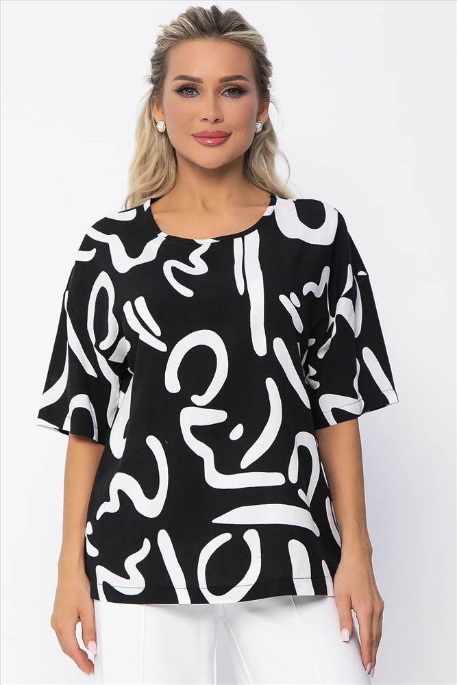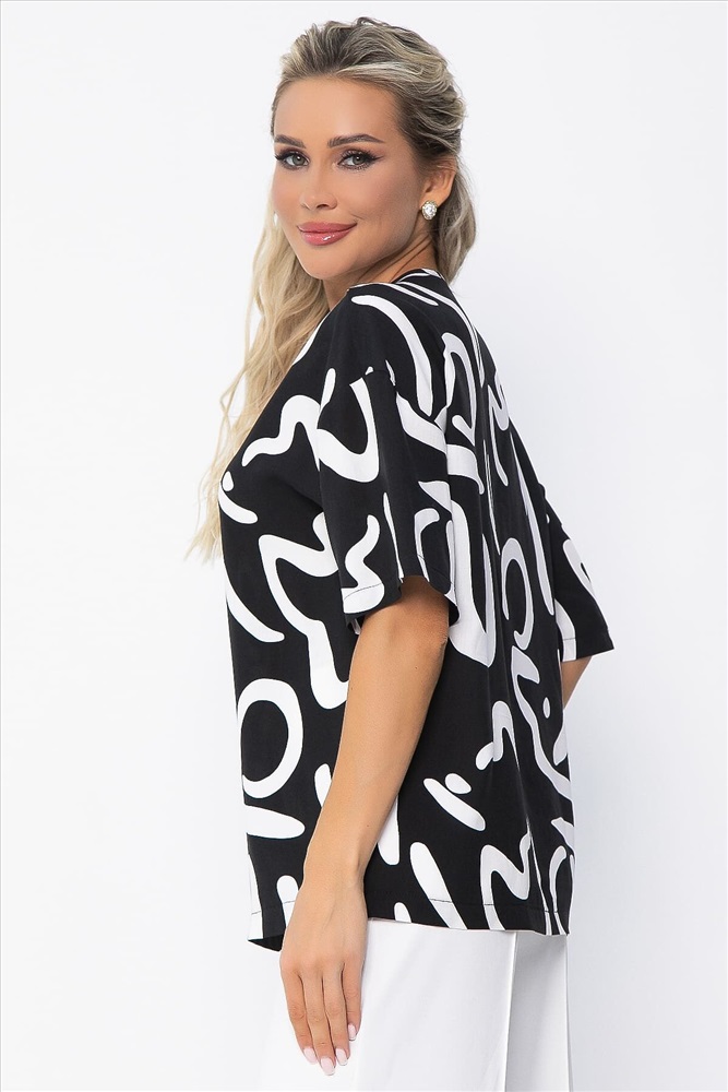 Состав: 50% хлопок, 50% вискоза. Материал: штапель. Цвет: чёрный. Принт: белые разводы. Силуэт: свободный. Карманы: отсутствуют. Подкладка: отсутствует. Вид застежки: без застёжки. Декоративные элементы: отсутствуют. Длина: 44/ 62 см, 46/ 64 см, 48/ 66 см, 50/ 67 см.