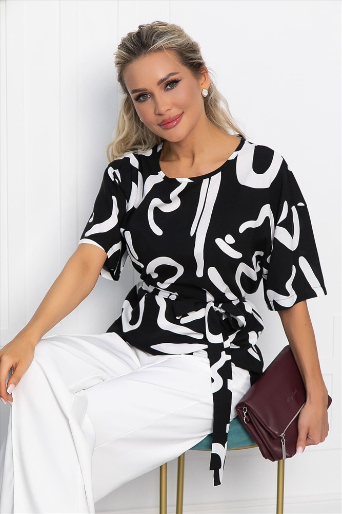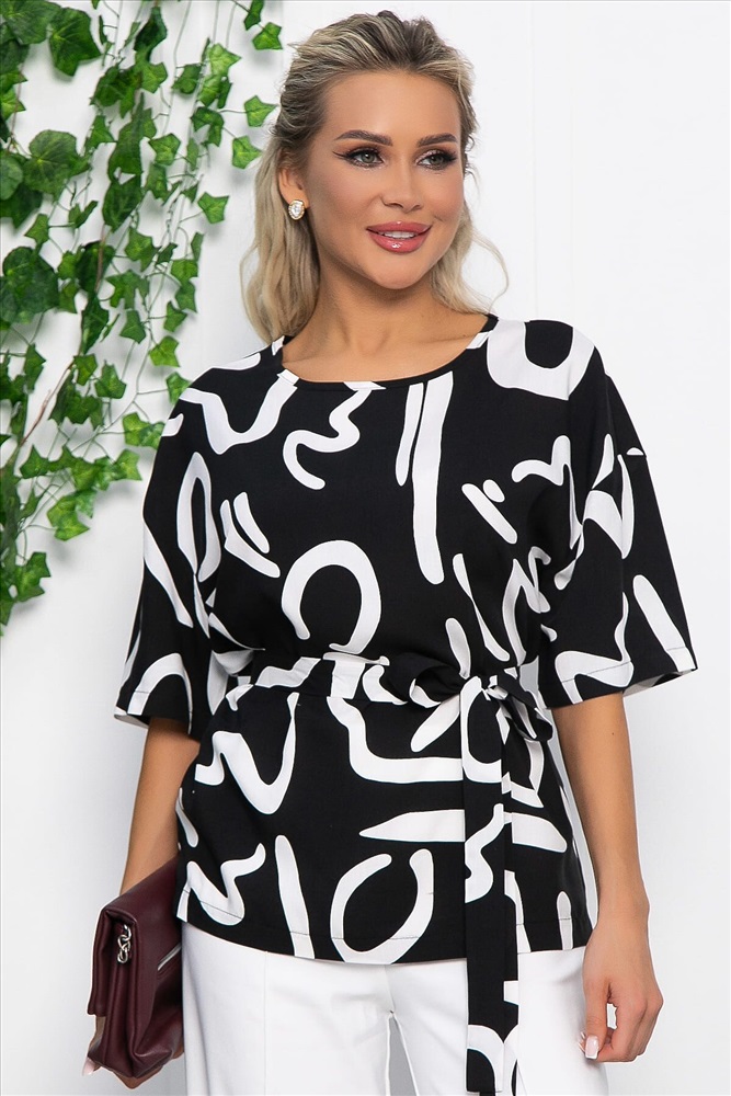 Блузка с абстрактным принтом — идеальное дополнение к вашему гардеробу. Свободный короткий рукав и округлый вырез горловины придают ей современный и элегантный вид. В комплекте идет тканевый пояс, который подчеркивает талию и создает стильный силуэт. Эта блузка прекрасно подходит как для деловых встреч, так и для повседневной носки, легко сочетаясь с различными элементами гардероба. Создавайте яркие образы и будьте в центре внимания с этой блузкой!