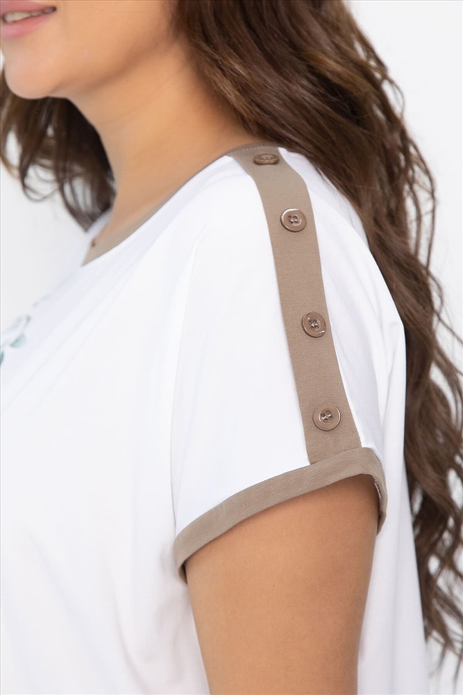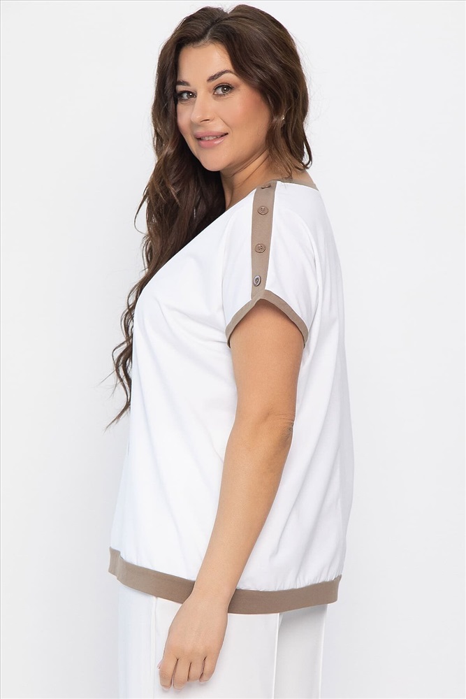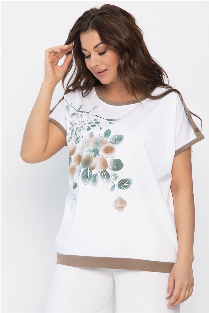 ID товара: 1128115 Состав: 95% Хлопок, 5% Спандекс Сезон: Весна/Лето Длина: Средняя Фасон: Полуприлегающий Рукав: Короткие Вырез горловины: Округлый Рисунок: цветочный Декоративные элементы: Принт Основная ткань: Хлопок Стиль: Повседневный Страна бренда: Россия Страна производства: Россия Состав : 95% хлопок, 5% спандекс Материал : хлопок Цвет : Белый Принт : листья, цветы Силуэт : полуприлегающий Карманы : Отсутствуют Подкладка : Отсутствует Вид застежки : без застёжки Декоративные элементы : пуговицы на плечах Длина : 50-65 см, 52-68 см, 54-70 см Отснято с брюками Б12685-13 [ https://nsk.ltcollection.ru/catalog/bryuki/161858/ ] Летняя блуза из хлопка в бело-коричневом цвете — идеальный выбор для комфортного и стильного образа в жаркую погоду! Простой, но элегантный дизайн позволяет легко сочетать блузу с различными элементами гардероба, будь то шорты, юбки или джинсы. Внимание! Рекомендуем ориентироваться на размерную сетку и выбирать свой привычный размер, согласно размерной таблице. *Допуск отклонения длины при массовом производстве 1-3 см является нормой. Уход за изделием: Ручная стирка или стирка в машине при температуре до 30 °C, деликатный режим. Не использовать отбеливатели. Разрешена глажка при температуре до 110 °C. При глажке использовать специальную насадку на подошве утюга, гладить с паром. Не замачивать и не выжимать. Стирать изделие наизнанку, отдельно от других вещей. Комментарии к товару