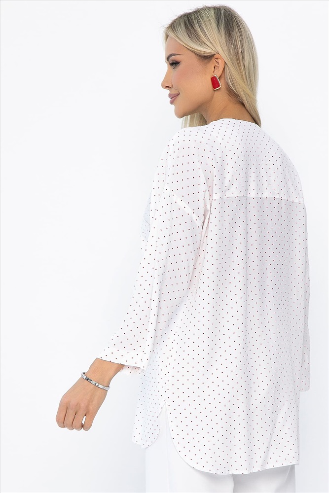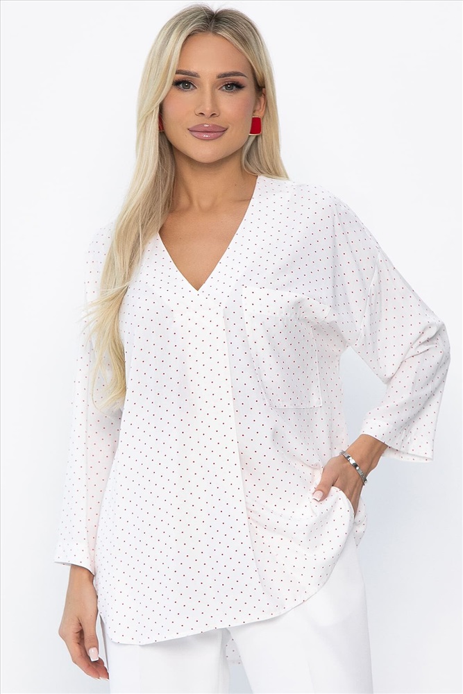 ID товара: 1129582 Состав: 100% Вискоза Сезон: Весна/Лето Длина: Средняя Фасон: Свободный Рукав: 7/8 Вырез горловины: V-образный Рисунок: Горох Тип карманов: накладной Декоративные элементы: Принт Основная ткань: Вискоза Стиль: классический Страна бренда: Россия Страна производства: Россия Состав : 100% вискоза Материал : штапель Цвет : Молочный Принт : горох Силуэт : асимметричный Карманы : Есть Подкладка : Отсутствует Вид застежки : без застёжки Декоративные элементы : отсутствуют Длина : 44-69 см, 46-69 см, 48-70 см, 50-70 см, 52-71 см, 54-71 см, 56-72 см Длина по переду (ассиметричный крой) : 44-66 см, 46-66 см, 48-67 см, 50-67 см, 52-68 см, 54-68 см, 56-69 см Отснято с белыми брюками Б12685-13 [ https://nsk.ltcollection.ru/catalog/bryuki/161858/ ] и с черными Б13952-7М Удобная и практичная блузка идеально подходит для ежедневного ношения в теплое время года. Она выполнена в минималистичном стиле, который подчеркивает ваш естественный шарм и придает вашему облику особый шик. Разрезы по бокам обеспечивают свободу движения и дополнительный комфорт. Внимание! Рекомендуем ориентироваться на размерную сетку и выбирать свой привычный размер, согласно размерной таблице. *Допуск отклонения длины при массовом производстве 1-3 см является нормой. Уход за изделием: Ручная стирка или стирка в машине при температуре до 30 °C, деликатный режим. Не использовать отбеливатели. Разрешена глажка при температуре до 110 °C. При глажке использовать специальную насадку на подошве утюга, гладить с паром. Не замачивать и не выжимать. Стирать изделие наизнанку, отдельно от других вещей. Комментарии к товару