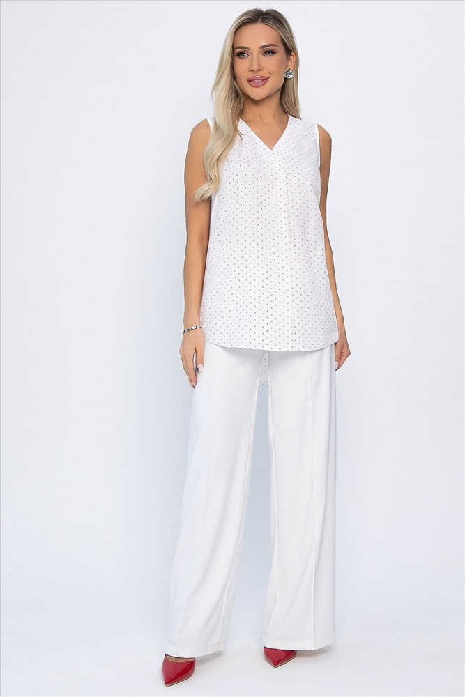 ID товара: 1129583 Состав: 100% Вискоза Сезон: Весна/Лето Длина: Средняя Фасон: А-силуэт Рукав: Без рукавов Вырез горловины: V-образный Рисунок: Горох Декоративные элементы: Принт Основная ткань: Вискоза Стиль: классический Страна бренда: Россия Страна производства: Россия Состав : 100% вискоза Материал : штапель Цвет : Молочный Принт : горох Силуэт : А-силуэт Карманы : Отсутствуют Подкладка : Отсутствует Вид застежки : без застёжки Декоративные элементы : отсутствуют Длина : 44-69 см, 46-69 см, 48-70 см, 50-70 см, 52-71 см, 54-71 см, 56-72 см Длина по переду (ассиметричный крой) : 44-64 см, 46-64 см, 48-65 см, 50-65 см, 52-66 см, 54-66 см, 56-67см Отснято с пиджаком Б13239-7М [ https://nsk.ltcollection.ru/catalog/zhakety/167925/ ] , с черными брюками Б13952-7М и с белыми Б12685-13 [ https://nsk.ltcollection.ru/catalog/bryuki/161858/ ] Летняя блуза в горох — стильный и яркий элемент вашего гардероба! Изготовленная из легкой и дышащей ткани, она идеально подходит для теплых дней. Элегантный принт в горох добавляет игривости и свежести вашему образу Внимание! Рекомендуем ориентироваться на размерную сетку и выбирать свой привычный размер, согласно размерной таблице. *Допуск отклонения длины при массовом производстве 1-3 см является нормой. Уход за изделием: Ручная стирка или стирка в машине при температуре до 30 °C, деликатный режим. Не использовать отбеливатели. Разрешена глажка при температуре до 110 °C. При глажке использовать специальную насадку на подошве утюга, гладить с паром. Не замачивать и не выжимать. Стирать изделие наизнанку, отдельно от других вещей. Комментарии к товару