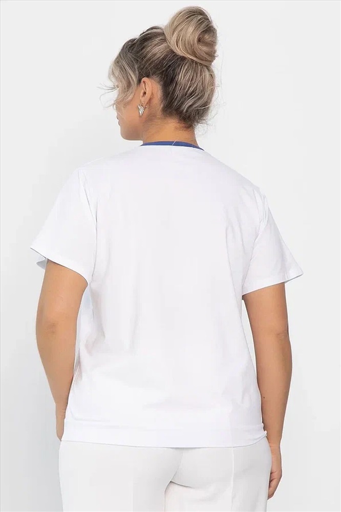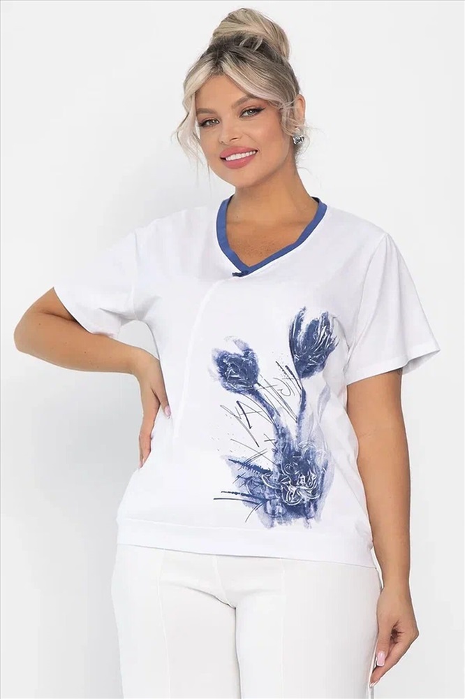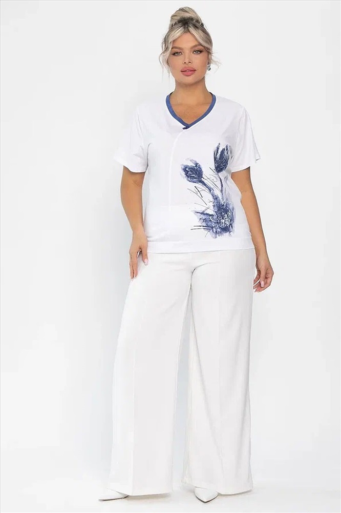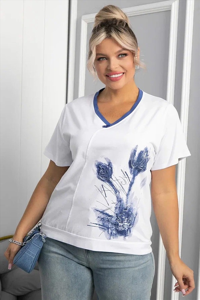ID товара: 1131105 Состав: 95% Хлопок, 5% Спандекс Сезон: Весна/Лето Длина: Средняя Фасон: Полуприлегающий Рукав: короткие Вырез горловины: V-образный Рисунок: цветочный Декоративные элементы: Принт Основная ткань: Хлопок Стиль: классический Страна бренда: Россия Страна производства: Россия Состав : 95% хлопок, 5% спандекс Материал : хлопок Цвет : Белый Принт : рисунок и надписи Силуэт : полуприлегающий Карманы : Отсутствуют Подкладка : Отсутствует Вид застежки : без застёжки Декоративные элементы : имитация пуговиц Длина : 50-62 см, 52-64 см, 54-66 см Отснято с джинсами Б13806-4М [ https://ltcollection.ru/catalog/bryuki/192912/ ] и с брюками Б12685-13 [ https://ltcollection.ru/catalog/bryuki/161858/ ] Футболка с принтом в бело-синем цвете — это универсальная вещь, которая станет отличным дополнением к вашему гардеробу. Она подойдёт как для уютного домашнего отдыха, так и для активных прогулок по городу. Комбинируйте её с джинсами, шортами или юбками — и вы всегда будете выглядеть стильно и привлекательно. Внимание! Рекомендуем ориентироваться на размерную сетку и выбирать свой привычный размер, согласно размерной таблице. *Допуск отклонения длины при массовом производстве 1-3 см является нормой. Уход за изделием: Ручная стирка или стирка в машине при температуре до 30 °C, деликатный режим. Не использовать отбеливатели. Разрешена глажка при температуре до 110 °C. При глажке использовать специальную насадку на подошве утюга, гладить с паром. Не замачивать и не выжимать. Стирать изделие наизнанку, отдельно от других вещей. Комментарии к товару