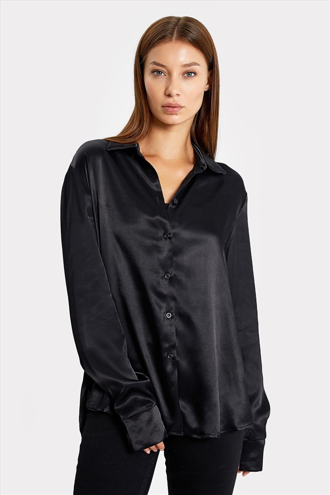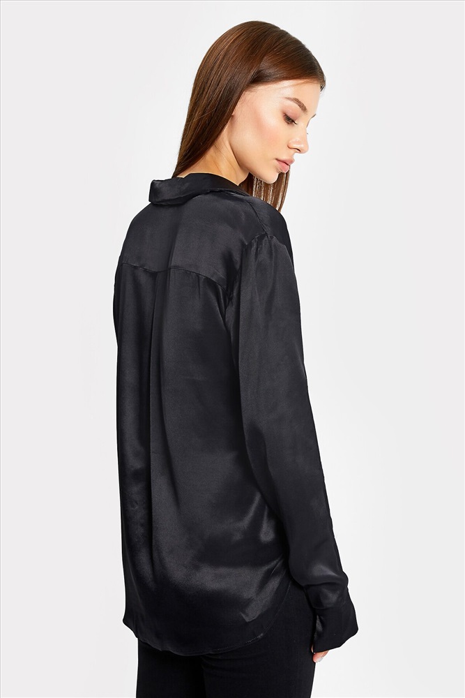 Наименование изделия: блузка женская Блузка женская прямого силуэта из сатиновой ткани. Горловина круглой формы, в горловину втачан стояче-отложной воротник. Центральная застежка на пуговицы. Плечо слегка спущено, рукав втачной, длинный. По низу манжета отрезная, широкая, с разрезом. Спинка цельнокроеная. Блузка удлиненная, с фигурным низом.