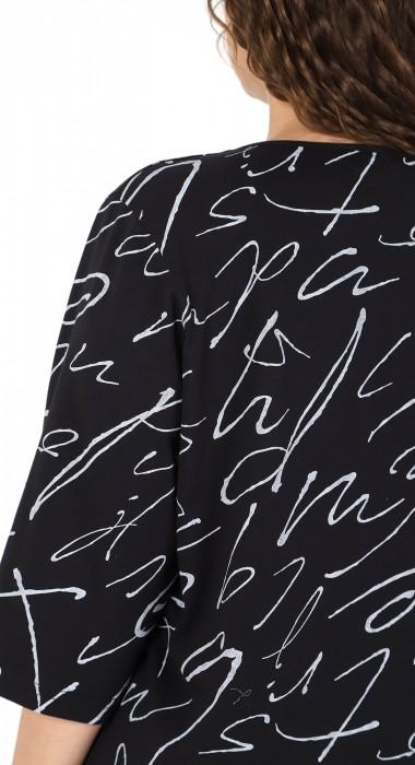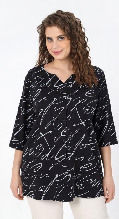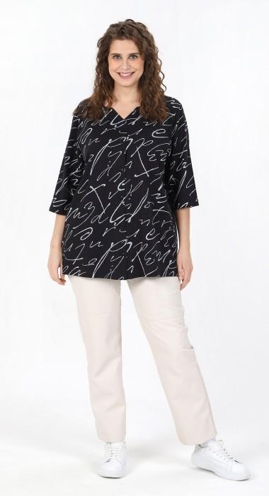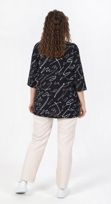 Блуза женская свободного покроя, из трикотажного полотна «кулирка», с рукавами ¾ длины, центральной бортовой застежкой на петли и пуговицы. V-образная горловина переда обработана обтачками, спинки – окантована.