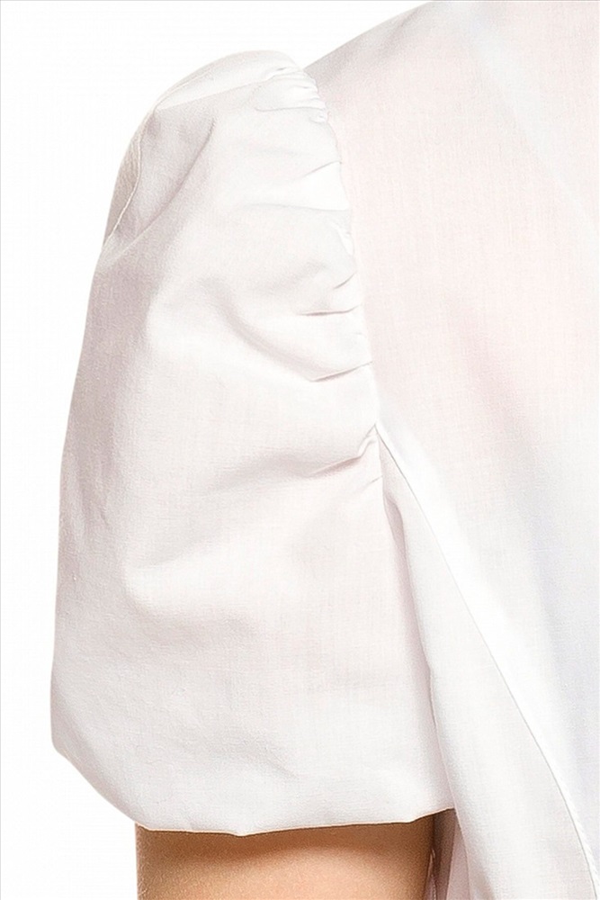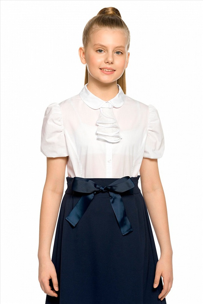 Блузка для девочек полуприлегающего силуэта с рельефами по переду и спинке. Рукав фонарик. Низ рукава мягкий, слегка присборенный на эластик, внутри подхвачен подкладом из сетки для большего объема. Декор в виде съёмного жабо из кружева, которое обработано атласным кантом. Жабо закреплено бантиком из репсовой ленты.