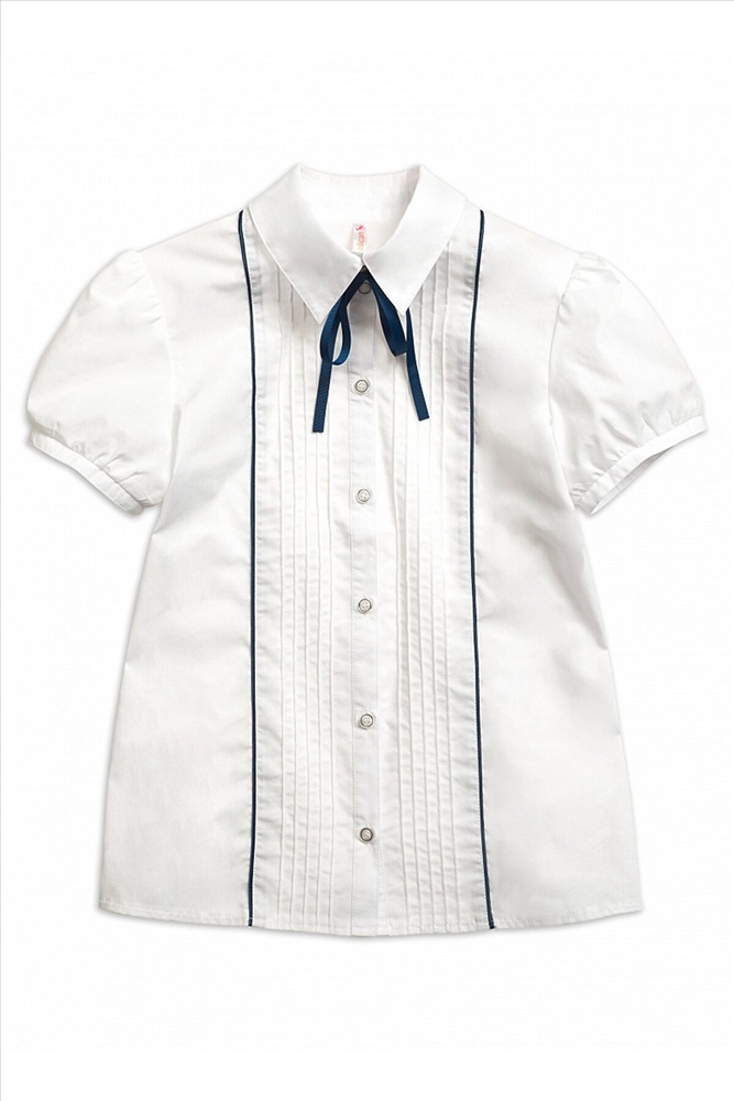 Блузка для девочек полуприлегающего силуэта с рельефами по спинке. По переду декоративная вставка с узкими вертикальными складками и контрастным сатиновым кантом. Рукав фонарик на узкой манжете с застежкой на пуговицу. Воротник на стойке с увеличенным отлетом актуальной формы. По центру стойки воротника настрочена узкая тесьма, которая завязывается на бант спереди.