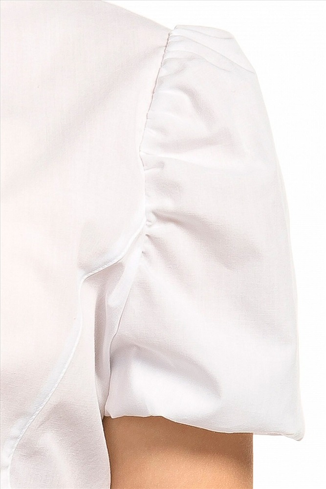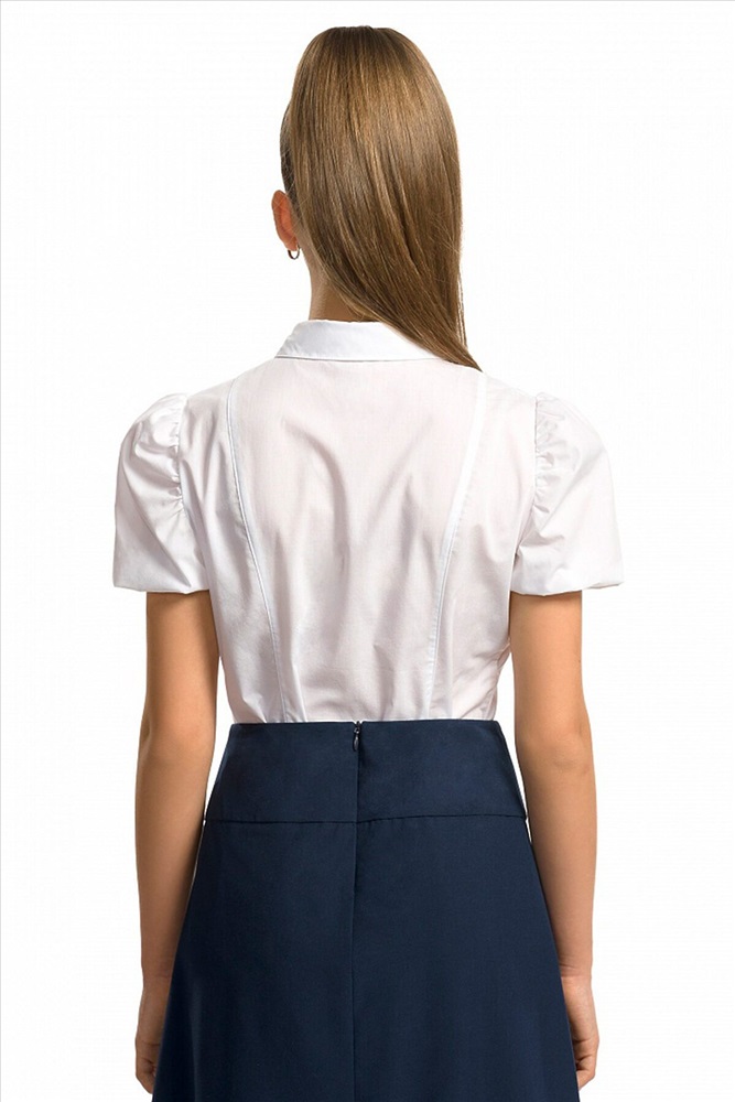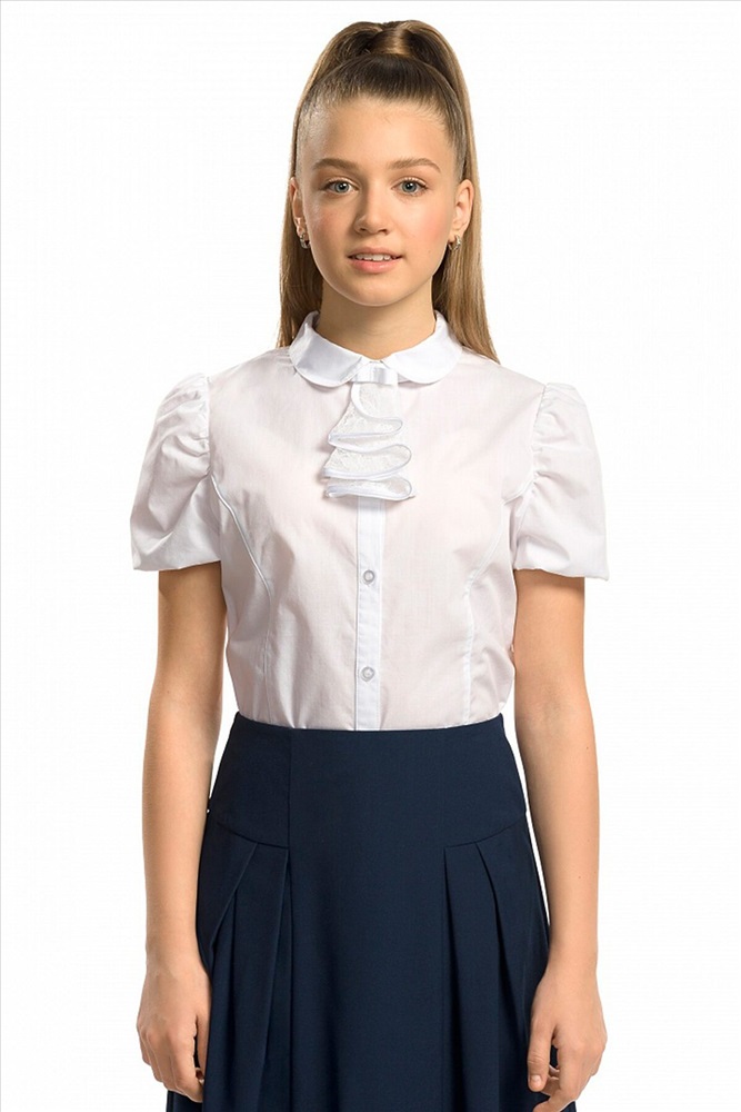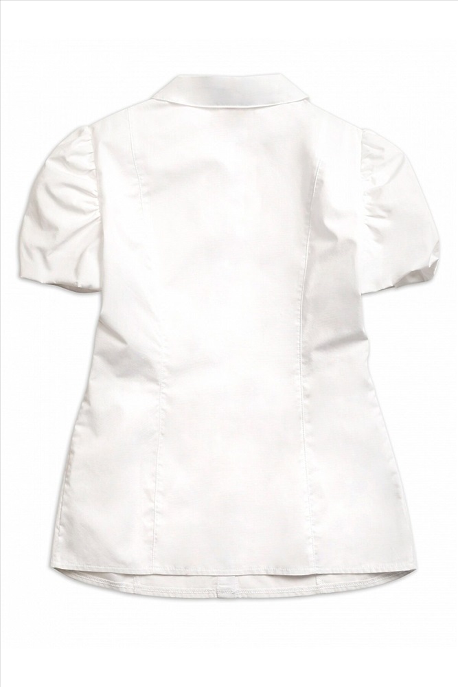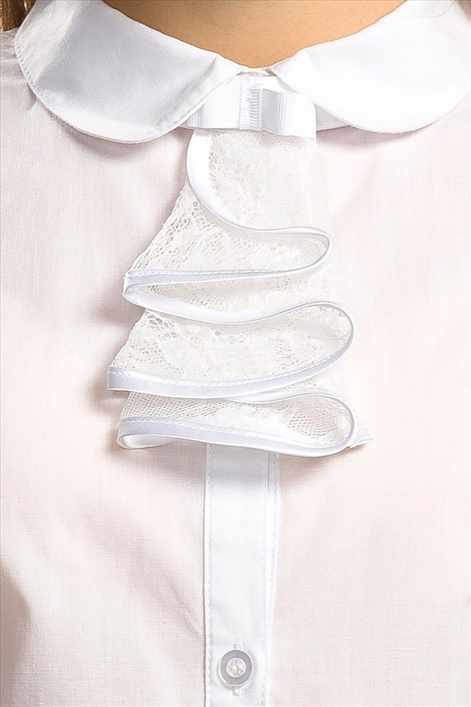 Блузка для девочек полуприлегающего силуэта с рельефами по переду и спинке. Рукав фонарик. Низ рукава мягкий, слегка присборенный на эластик, внутри подхвачен подкладом из сетки для большего объема. Декор в виде съёмного жабо из кружева, которое обработано атласным кантом. Жабо закреплено бантиком из репсовой ленты.