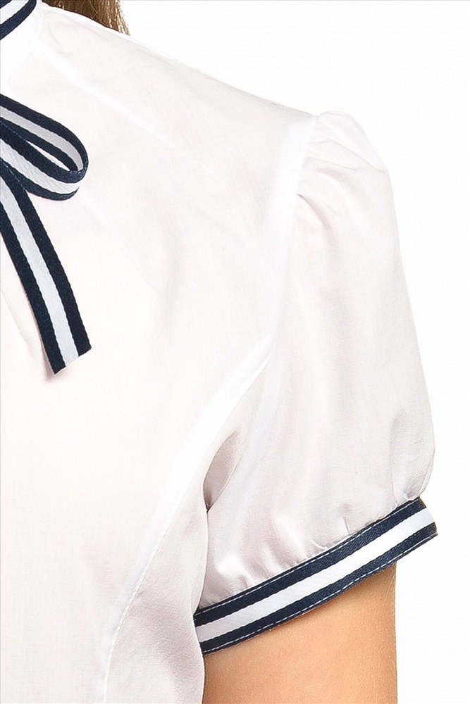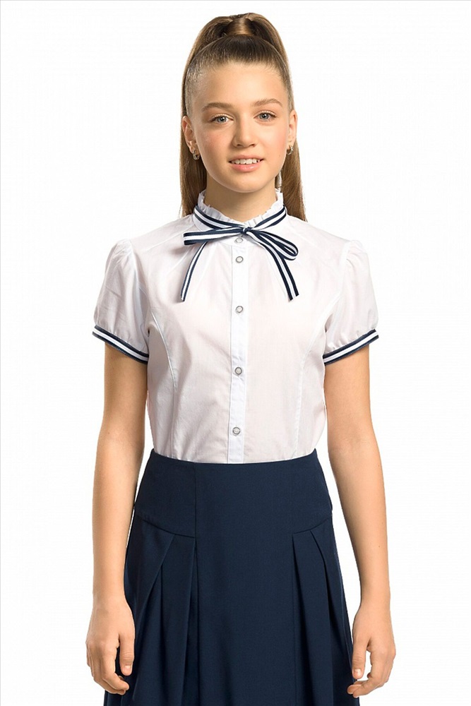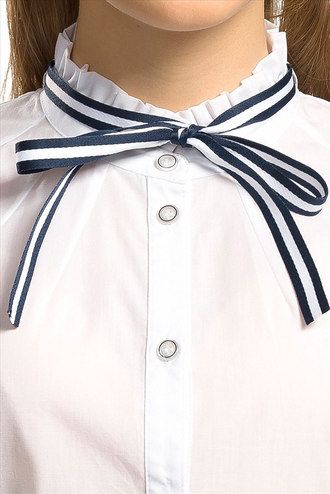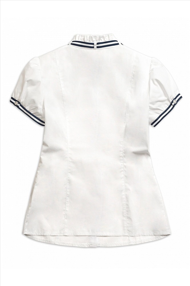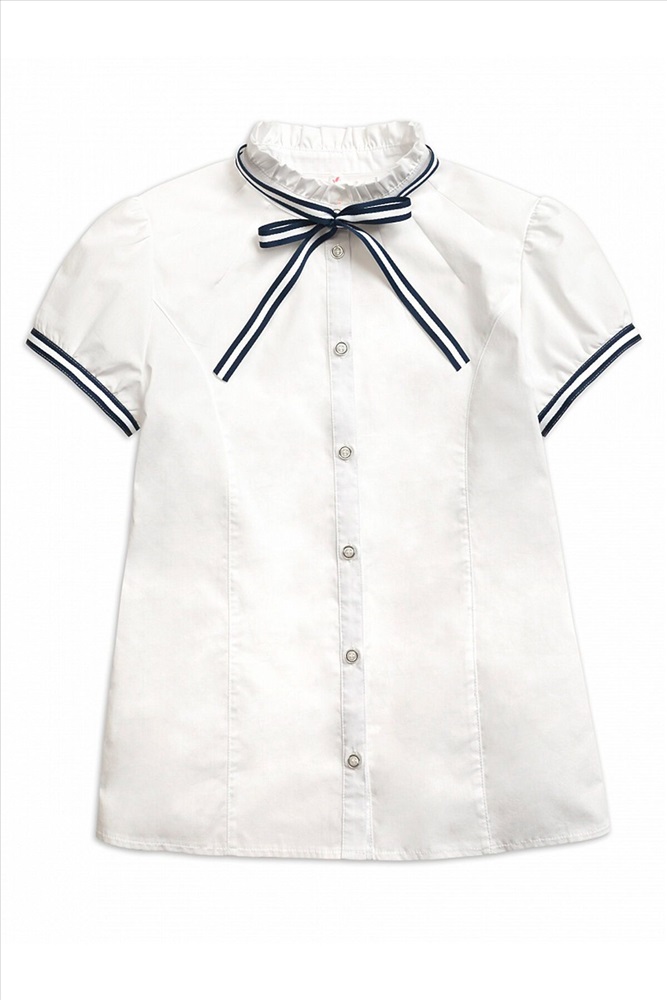 ID товара: 308657 Состав: Хлопок 60%, Полиэстер 40% Сезон: Демисезон Длина: Средняя Фасон: Прямой Рукав: Короткий Вид застежки: Пуговицы Вырез горловины: Стоечка Рисунок: нет Тип карманов: Без карманов Декоративные элементы: Бант Основная ткань: Хлопок Стиль: классический Страна бренда: Россия Страна производства: Китай Блузка для девочек полуприлегающего силуэта с рельефами по спинке и переду. Рукав фонарик по низу фиксируется узкой манжетой из декоративной тесьмы. Воротник стойка с рюшей по верхнему краю декорирован съёмной сатиновой тесьмой, которая продета в шлёвки по спинке воротника. Спереди от стойки расходятся декоративные лучи вытачки. Комментарии к товару