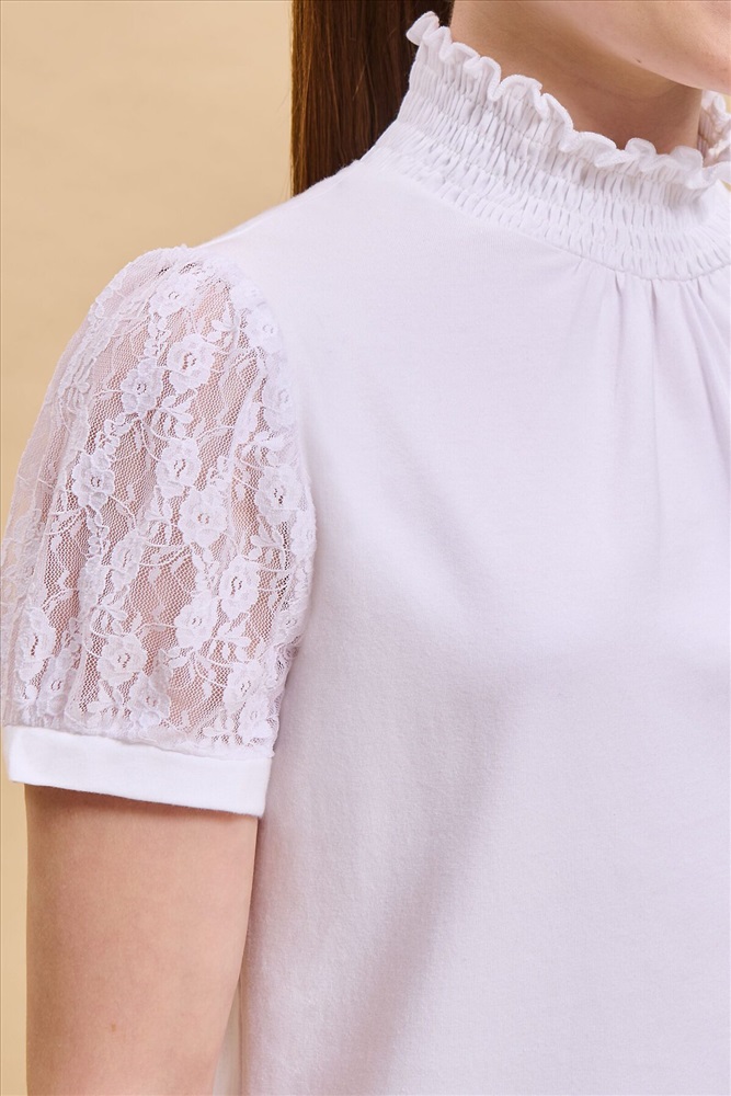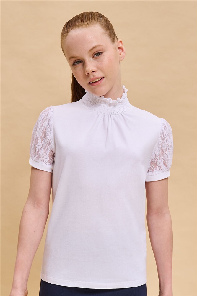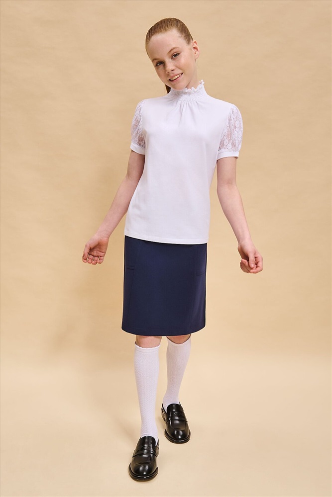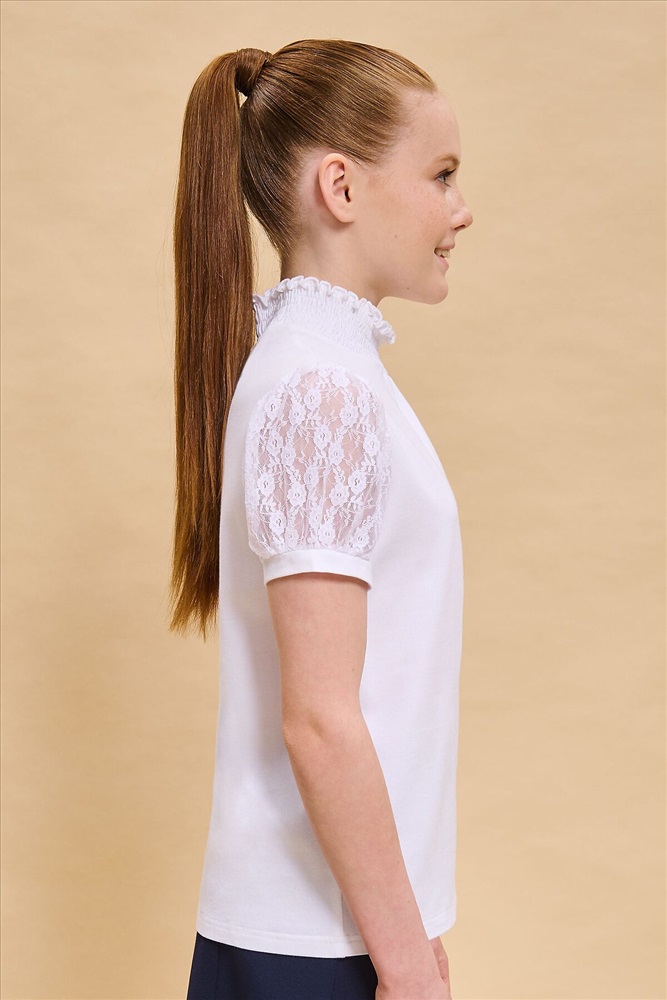 Школьная блузка с кружевными рукавами для девочки. Комфортная и мягкая трикотажная блузка умеренного объёма хорошо садится на девочек с разной фигурой и не сковывает движений ребёнка. Рукава выполнены из оригинального кружевного эластичного полотна с нежным девичьим узором. По низу рукавов узкие манжеты из основного материала. Блузка дополнена воротником-стойкой с эластичной сборкой — удобно надевать и при этом элегантно смотрится. По переду модель декорирована небольшой деликатной сборкой. В составе ткани преобладает качественный хлопок — ребёнку не жарко, кожа дышит. Благодаря полиамиду блузка в школу для девочки хорошо сохраняет форму и первозданный внешний вид. Модель однотонная, без принта. В ассортименте представлены блузки для девочек школьные универсальных цветов. Они легко сочетаются с различными брюками, юбками, сарафанами. Блузка детская подходит как для повседневной носки в школу, так и для более торжественного случая — в зависимости от того, с чем её надеть. Отличный выбор школьной формы для вашей девочки. Помните о правильном уходе за изделием: рекомендуется стирать при температуре не выше 30 °C, без предварительного замачивания, с изнанки. Это поможет сохранить качество и цвет блузки на долгое время. Не забывайте о выборе правильного размера. Используйте таблицу размеров на фотографии, чтобы выбрать подходящий вариант. Обратите внимание, что цвет товара на экране вашего устройства может отличаться от реального.