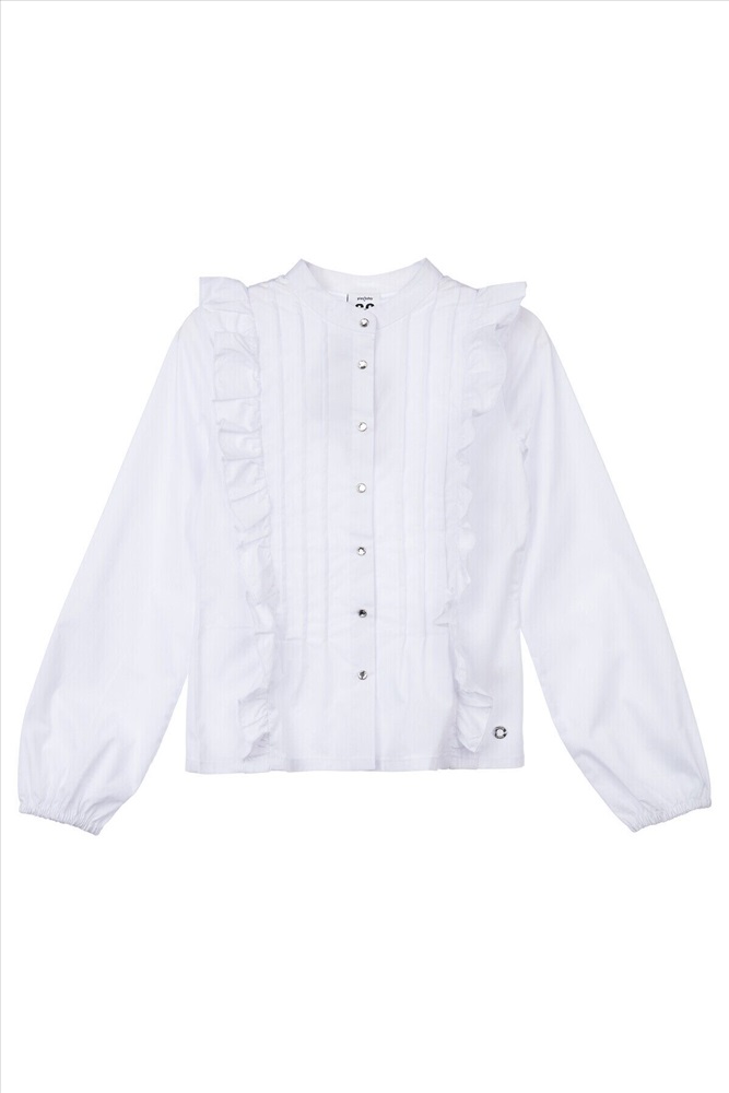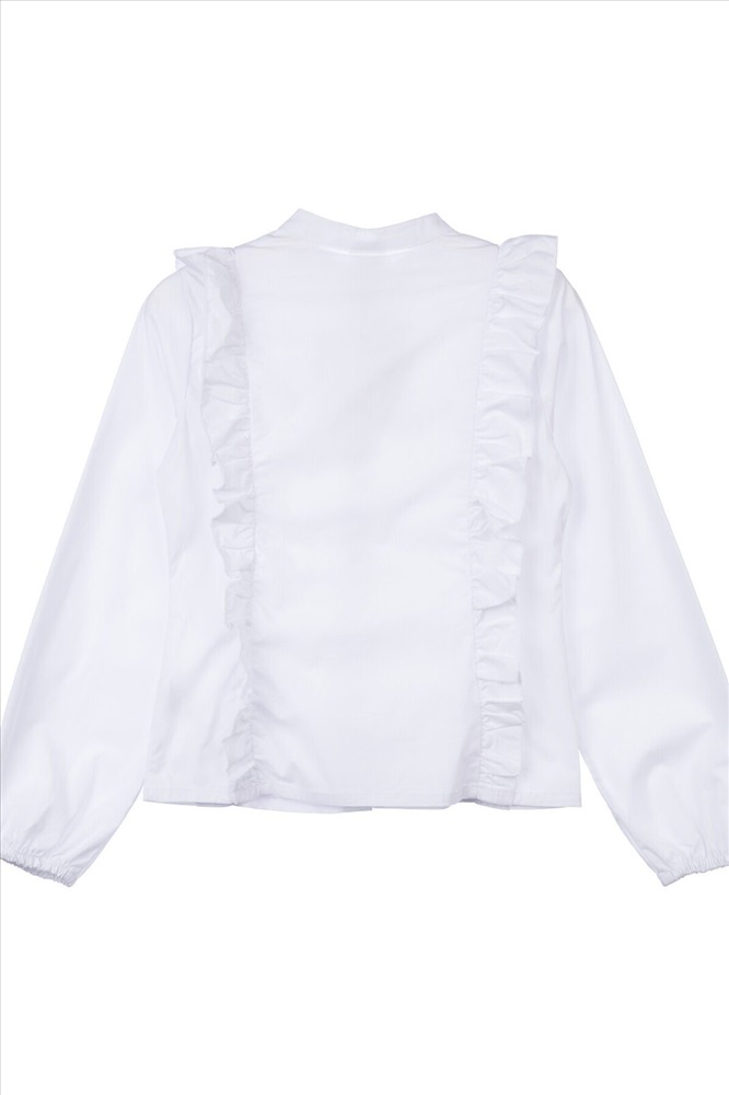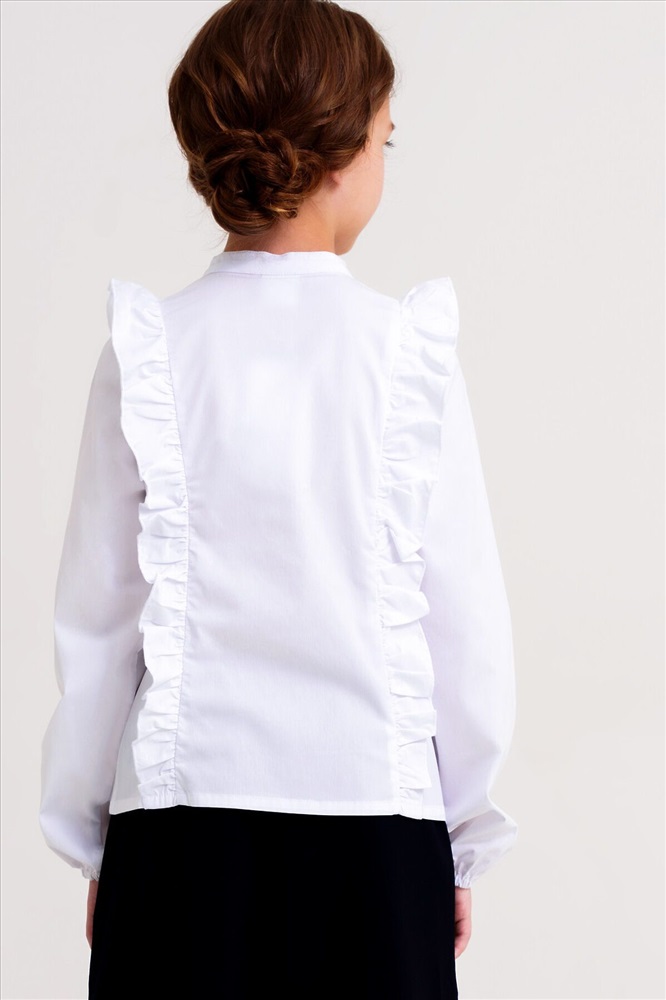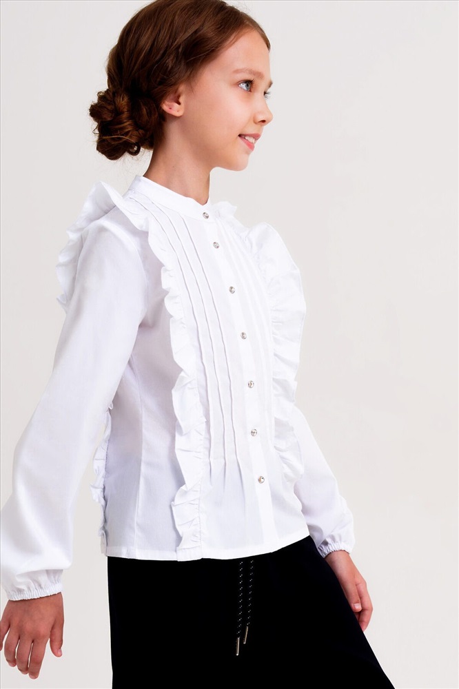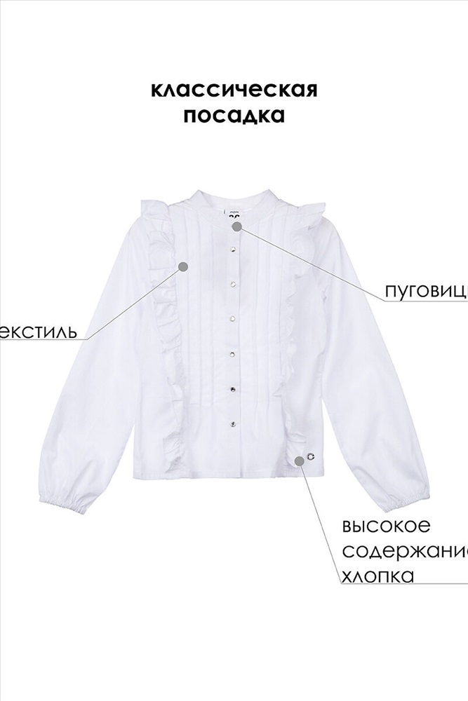Белая нарядная текстильная блузка прямого силуэта, приталенная для девочки подростка. Школьная блузка на кнопках хорошо держит форму, комфортна в носке и проста в уходе. Высокое содержание хлопка. Рубашка в школу с длинным рукавом и интересным дизайном разнообразит повседневные школьные образы.