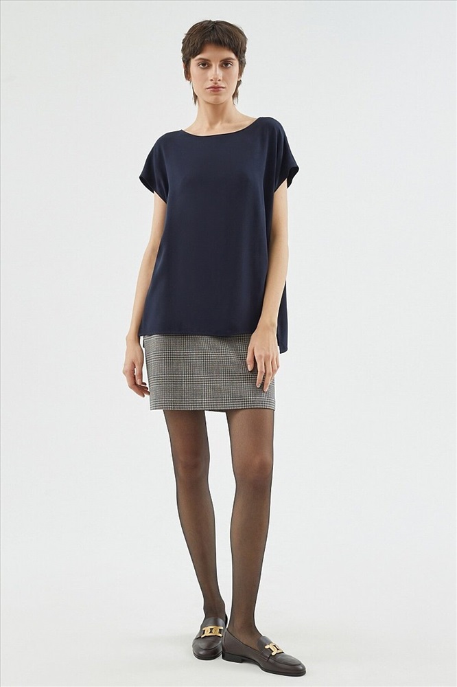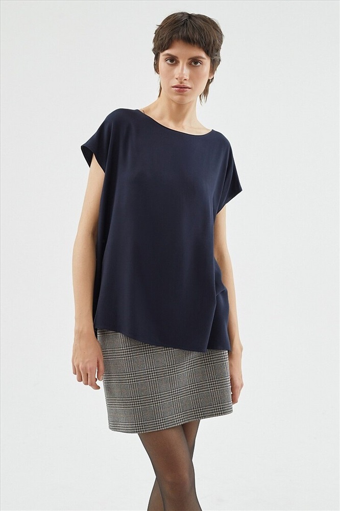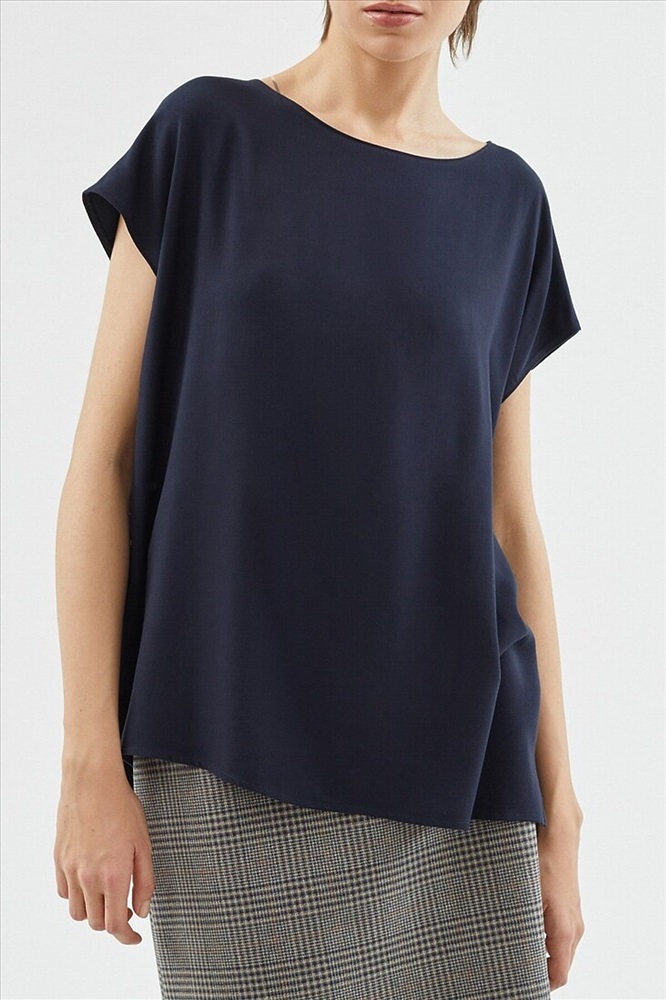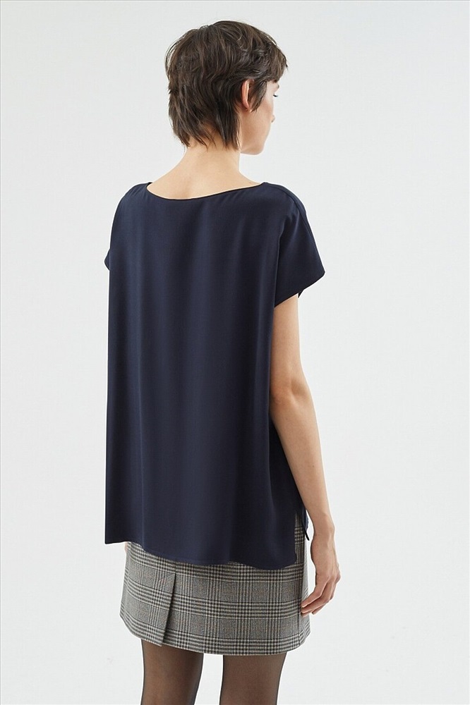 ID товара: 1094264 Состав: Вискоза 100% Сезон: Весна/Лето Длина: Средняя Фасон: Прямой Рукав: Короткие Вырез горловины: Округлый Рисунок: нет Основная ткань: Вискоза Стиль: Повседневный Страна бренда: Россия Страна производства: Россия Классическая прямая блуза из вискозной ткани в темно-синем цвете с горловиной лодочкой и небольшими разрезами по боковым швам. Комментарии к товару