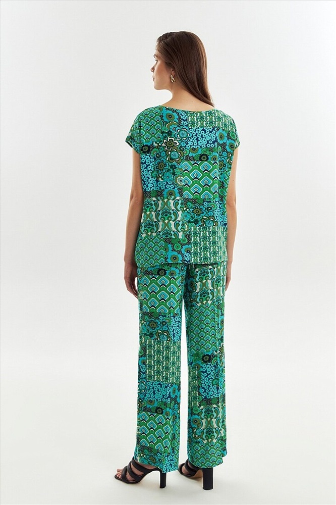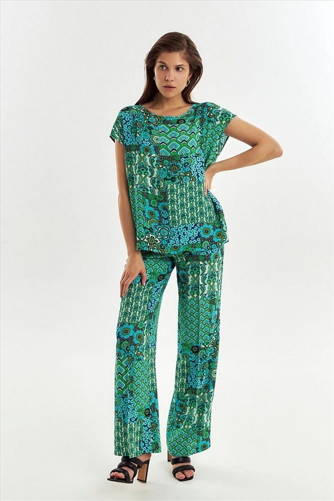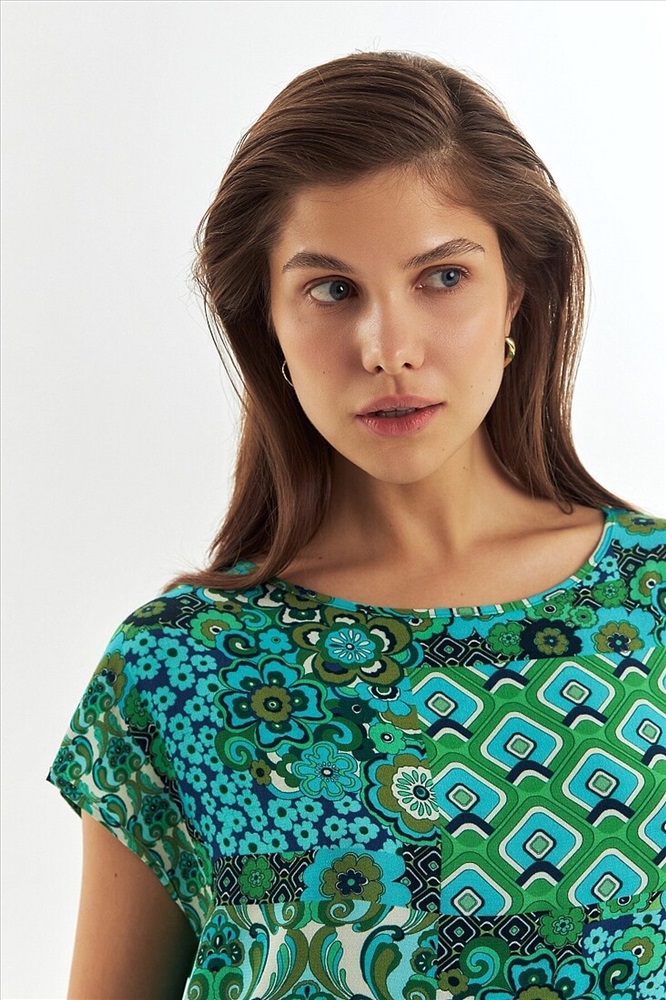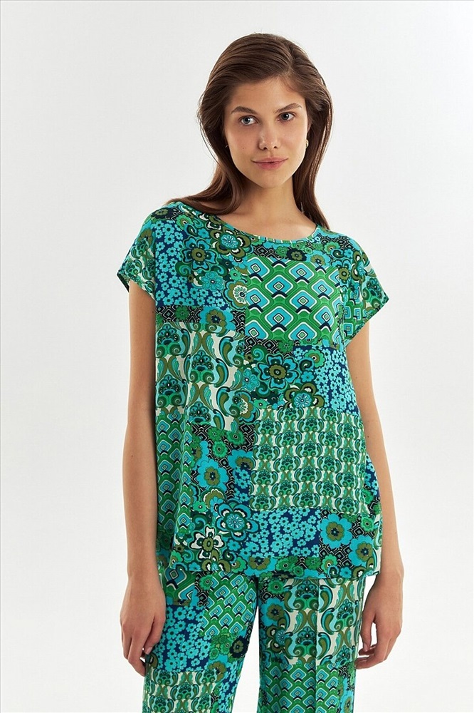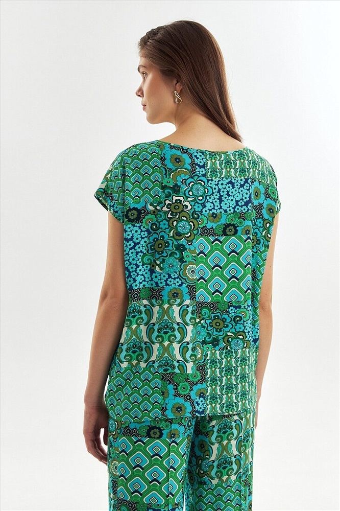 Страна производства: Россия Классическая прямая блуза из вискозной ткани в ярком принте с горловиной лодочкой.