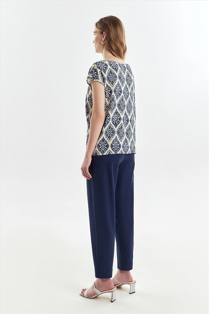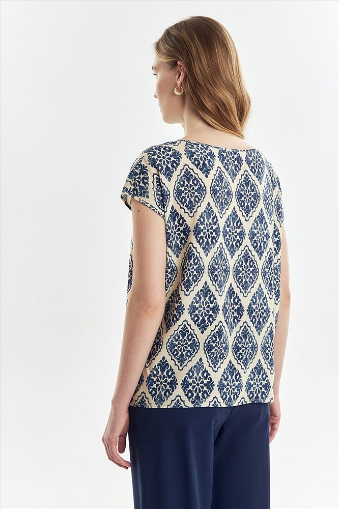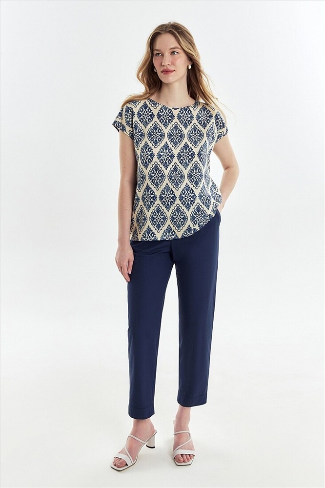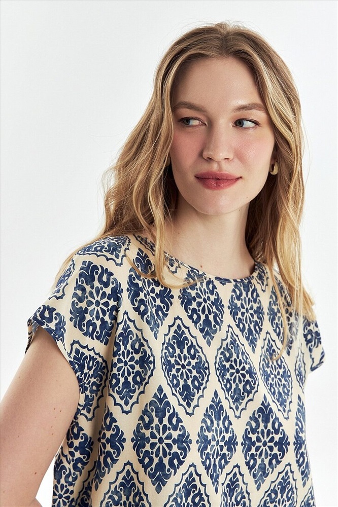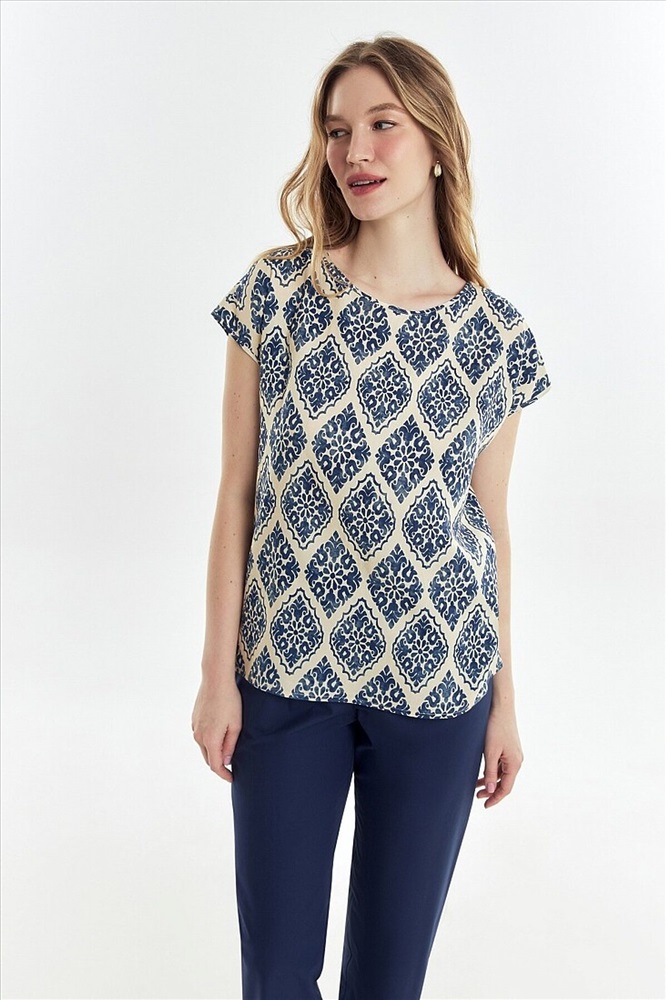 ID товара: 1094734 Состав: Вискоза 100% Сезон: Весна/Лето Длина: Средняя Фасон: Свободный крой Рукав: Короткие Вырез горловины: Круглый Рисунок: Узор Основная ткань: Вискоза Стиль: Повседневный Страна бренда: Россия Страна производства: Россия Классическая прямая блуза из вискозной ткани с восточном принтом, горловиной лодочкой и разрезами по боковым швам. Комментарии к товару