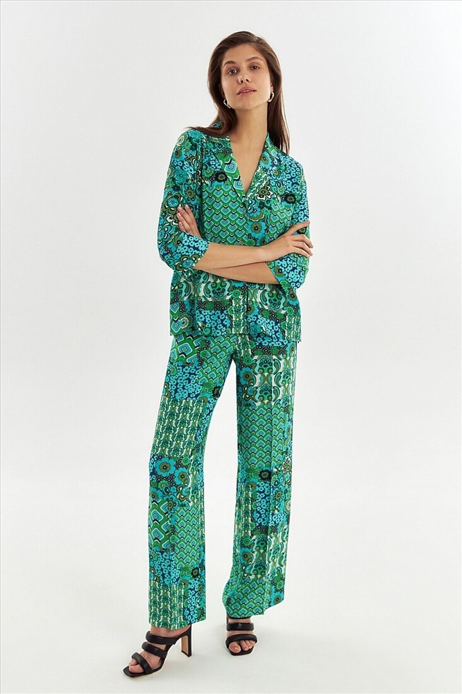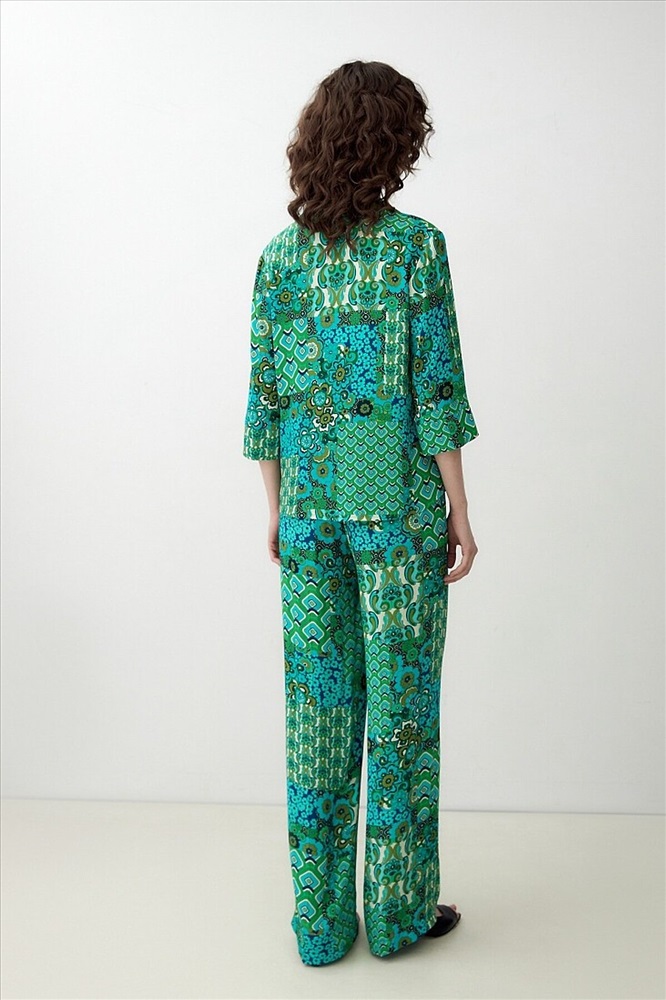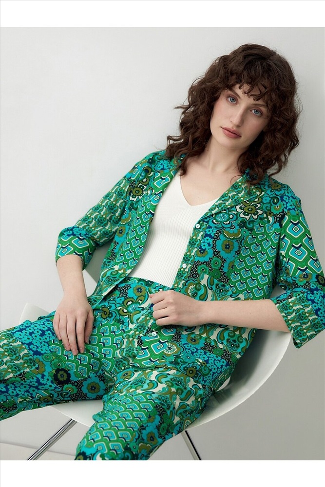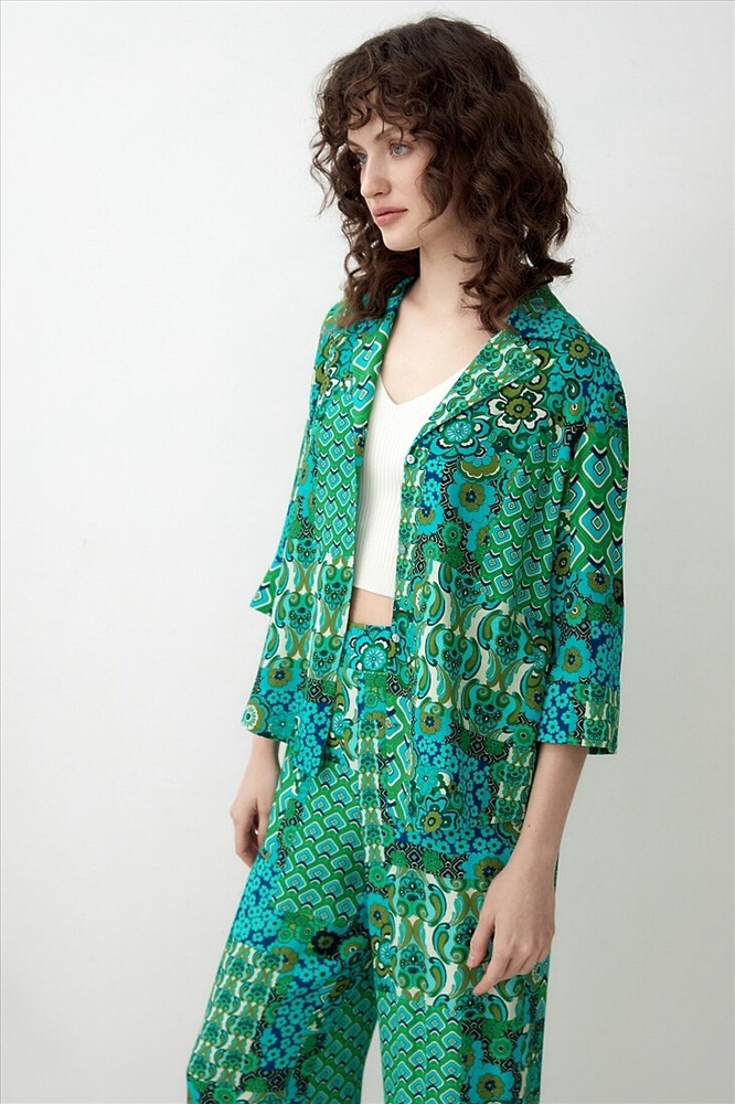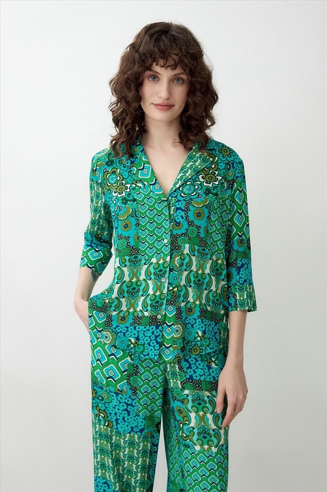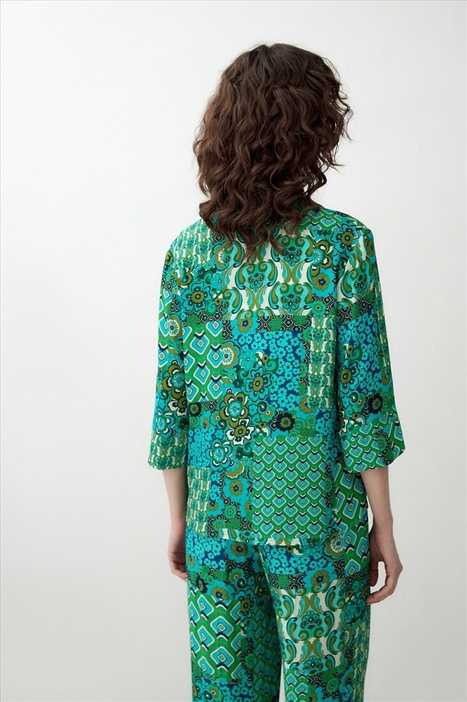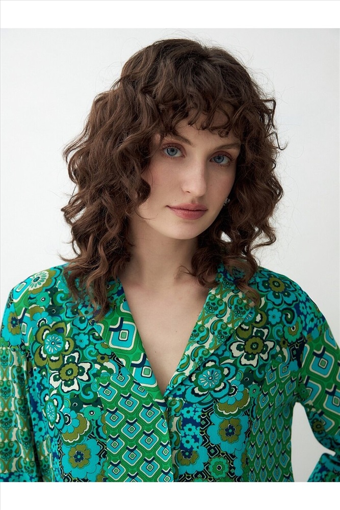 Страна производства: Россия Прямая блуза с английским воротником на пуговицах, со спущенной линией плеча, рукава 3/4 на широком манжете без пуговиц. Блуза выполнена из вискозной ткани в ярком принте.