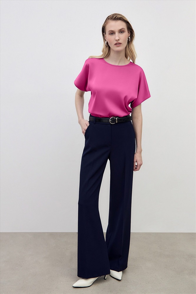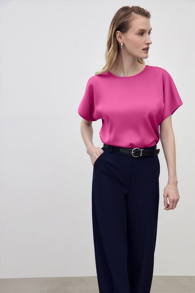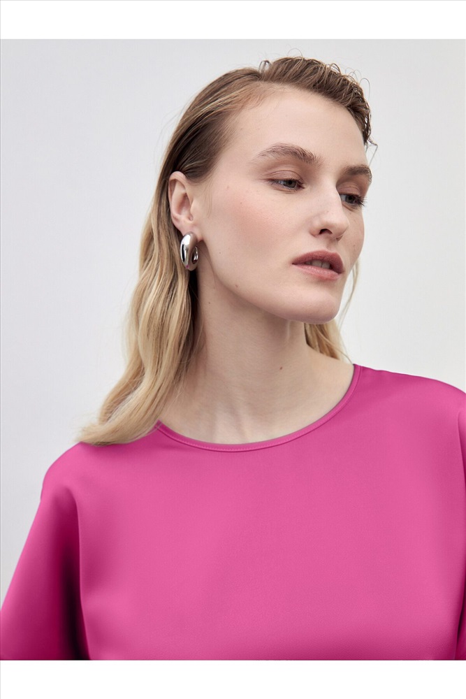 Классическая прямая блуза из атласной ткани в цвете маджента с круглой горловиной.