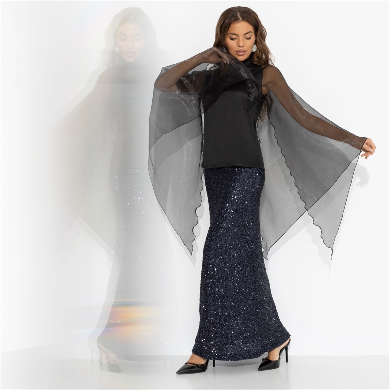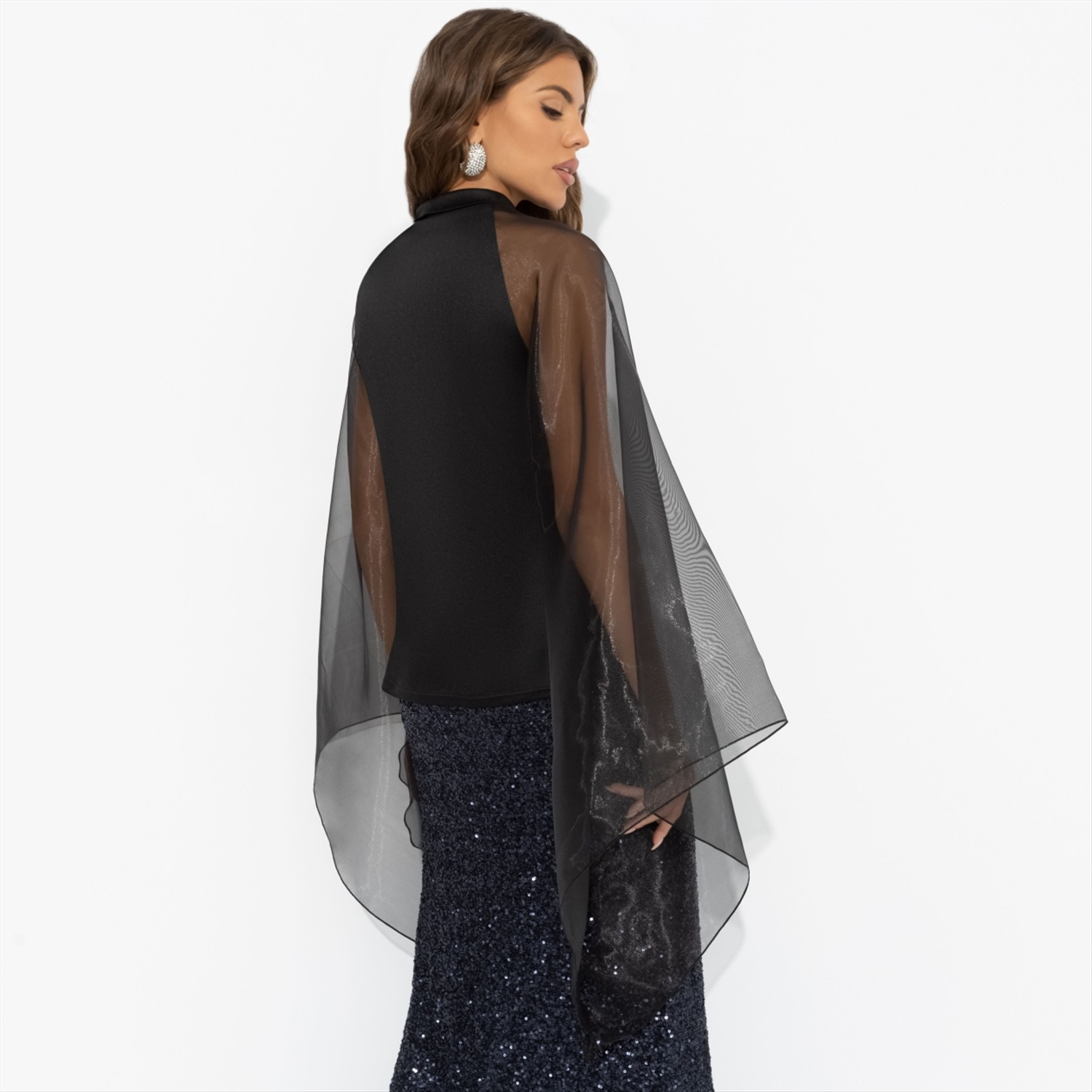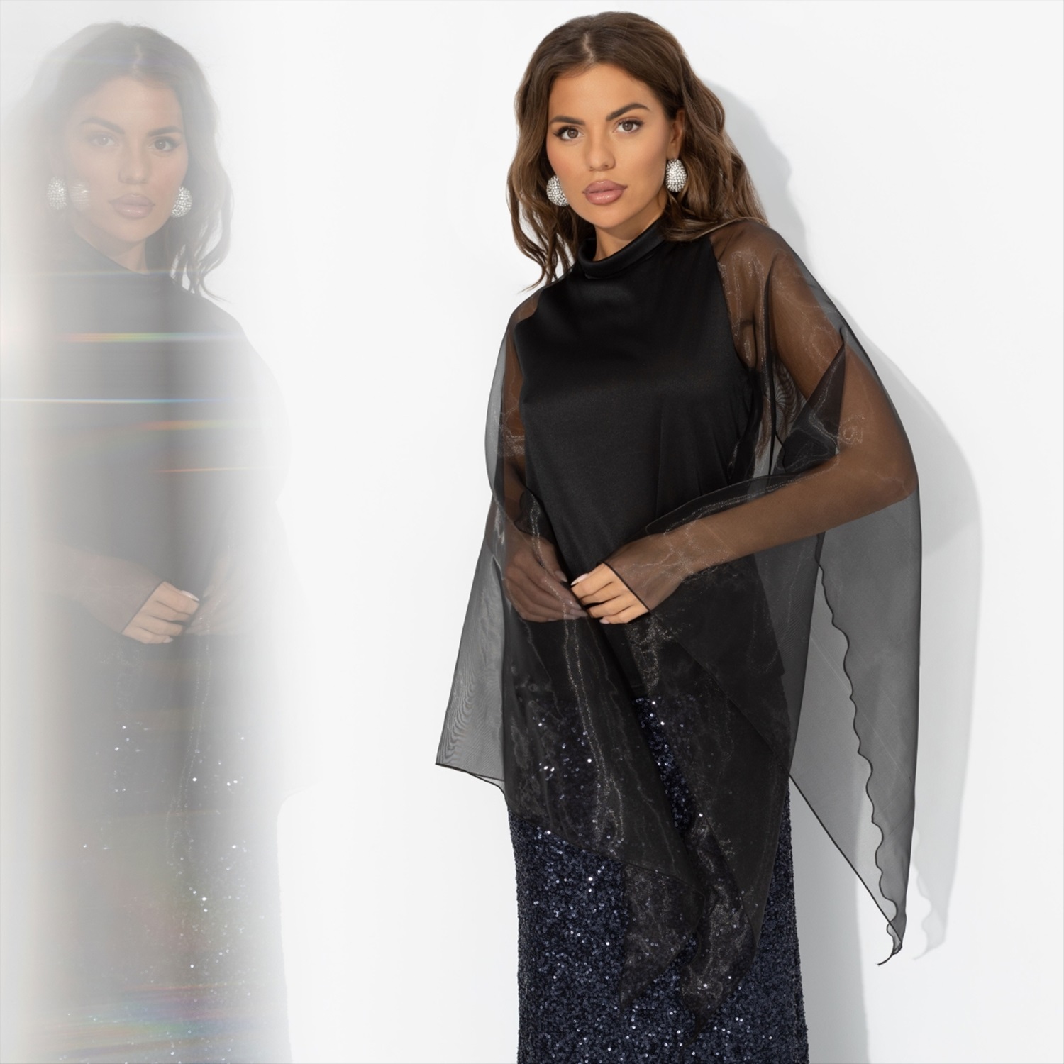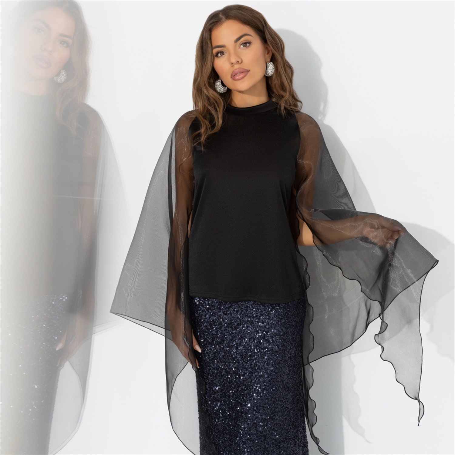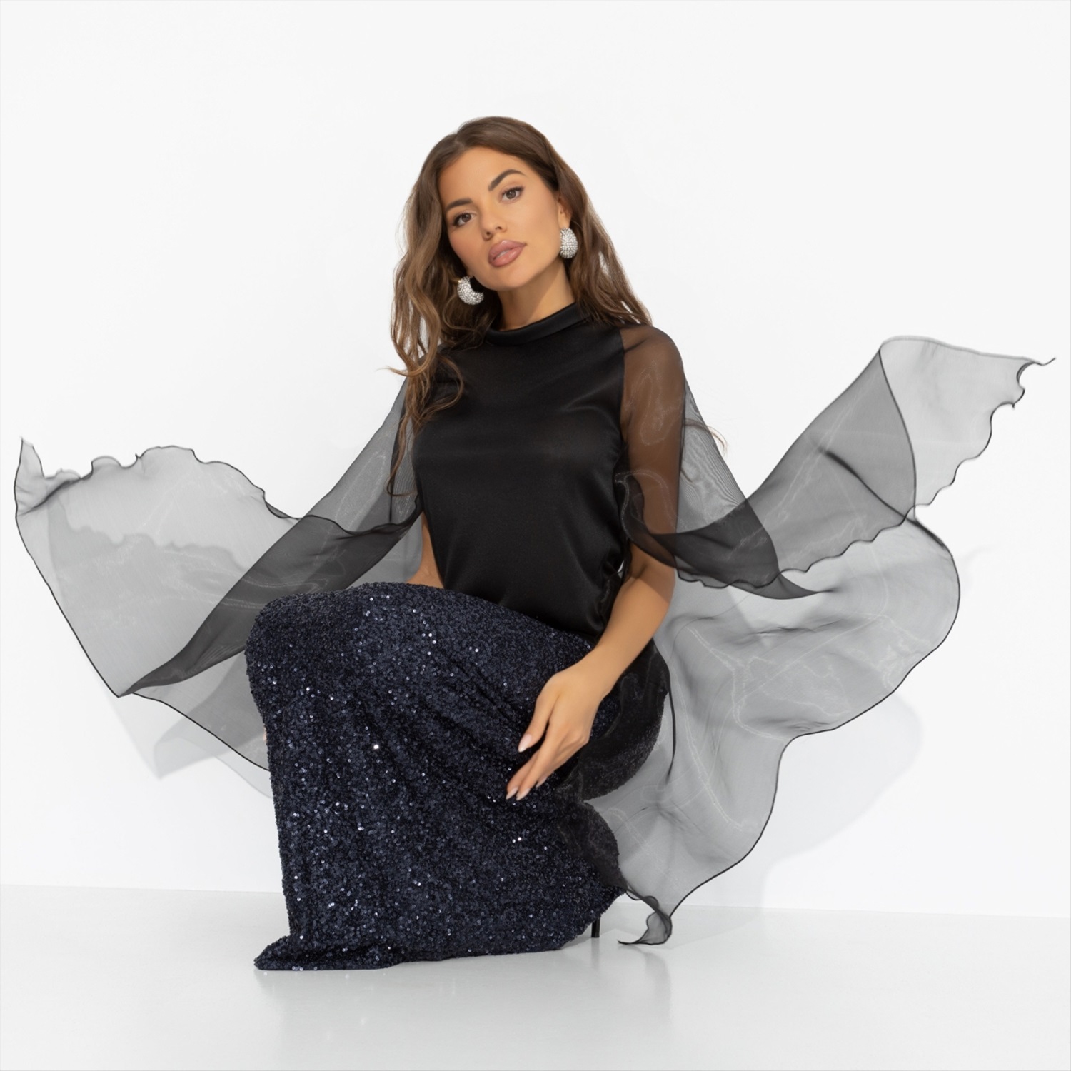 Состав: Трикотаж «скуба», органза (95% п/э, 5% эластан) Плотность ткани: Средняя Тип ткани: Трикотаж Вид застежки: Нет Карманы: Нет Основной цвет ткани: Черный Отрезная талия: Есть Подклад: Нет Резинка по талии: Есть Рисунок/раппорт: Нет, все изделия идентичны Сезон: Круглогодичный Силуэт: Прилегающий Одной рукой поведет‒ очарует, другой ‒ заманит в свои невидимые сети. Полупрозрачные рукава-крылья этой блузы превратят тебя в загадочную незнакомку: одно движение ‒ и магия в деле. Блуза из трикотажа с акцентными рукавами идеально подходит для нарядного образа. Ее легко комбинировать как с классическими брюками, так и с акцентной юбкой, расшитой пайетками. Для вашего идеального образа на Новый год. Комментарии к товару