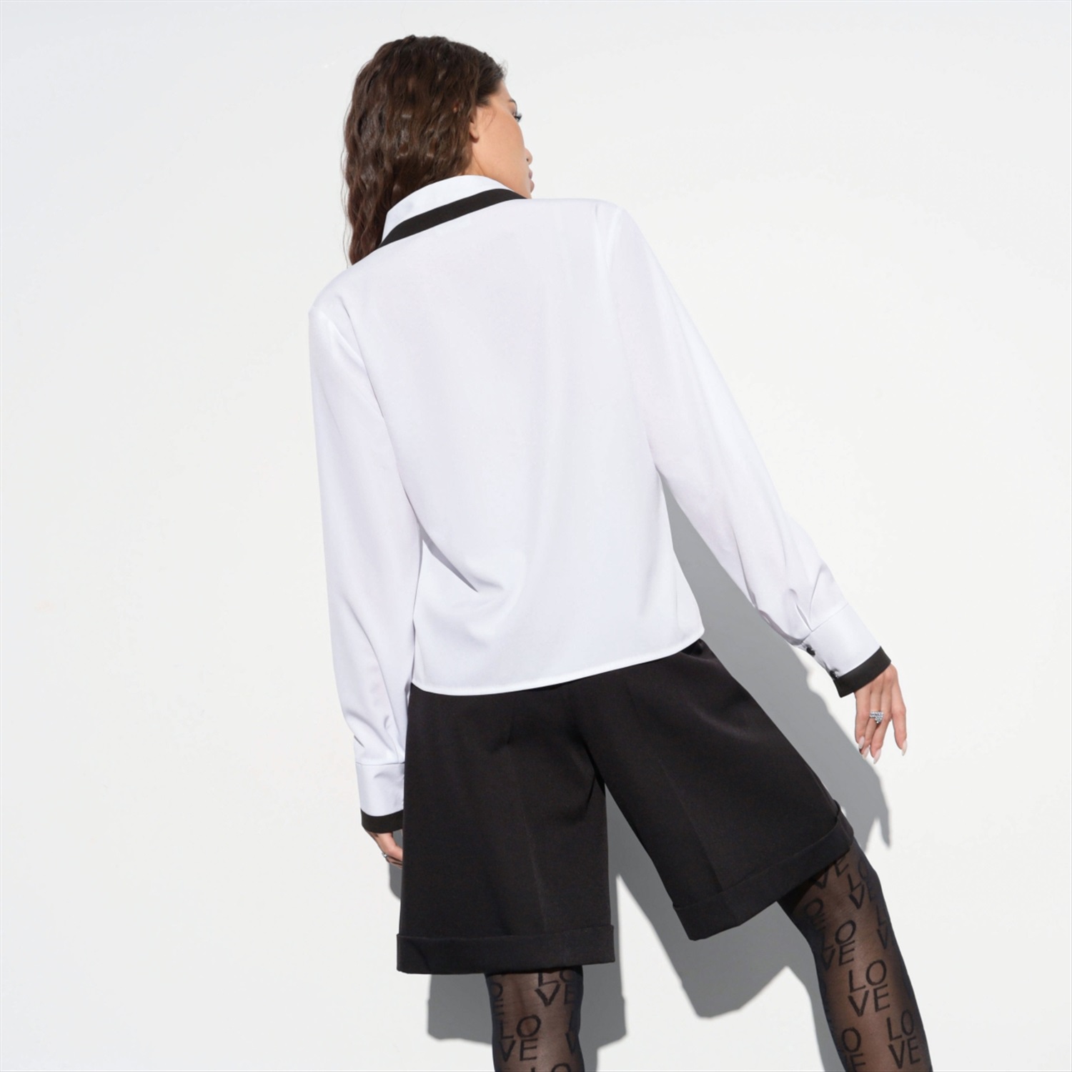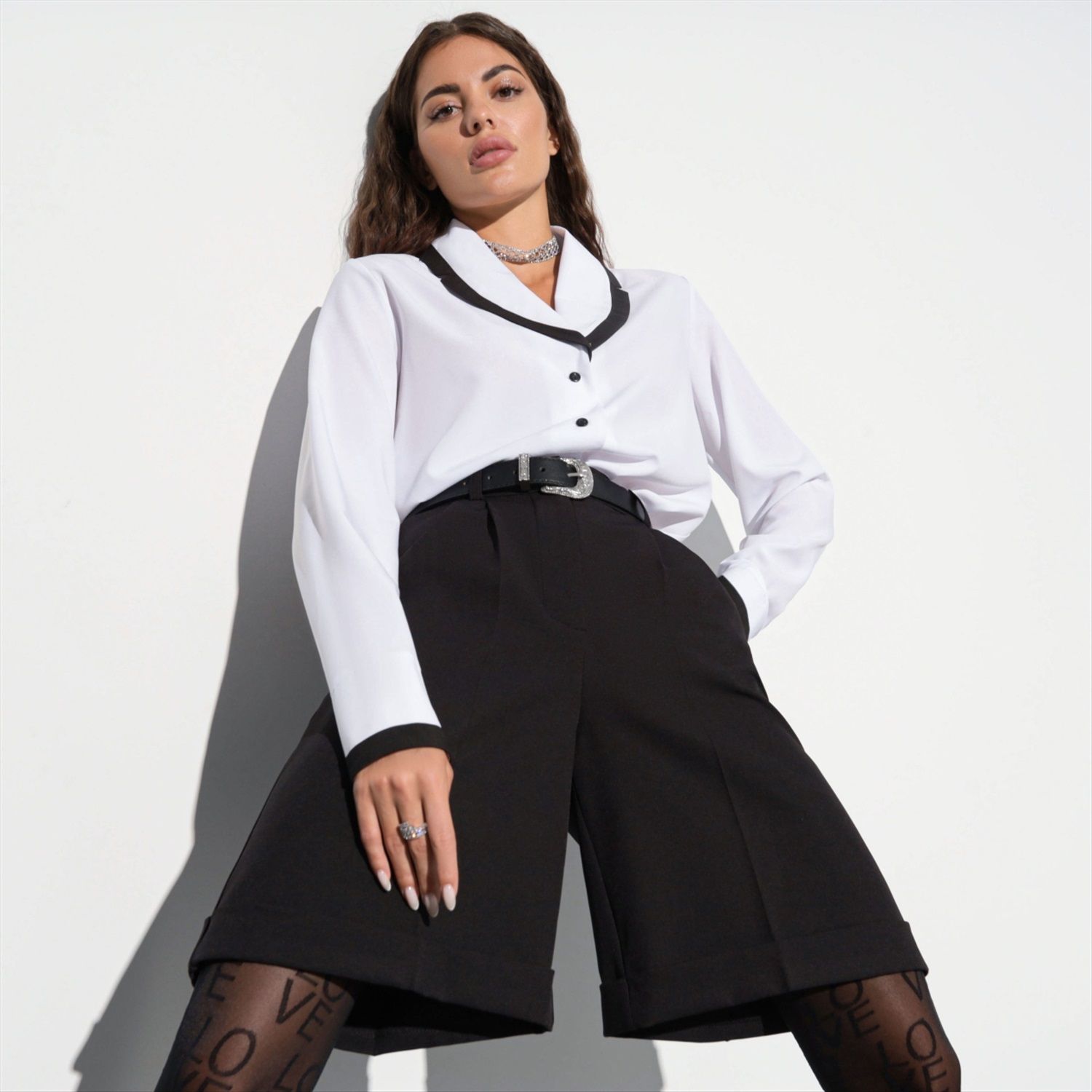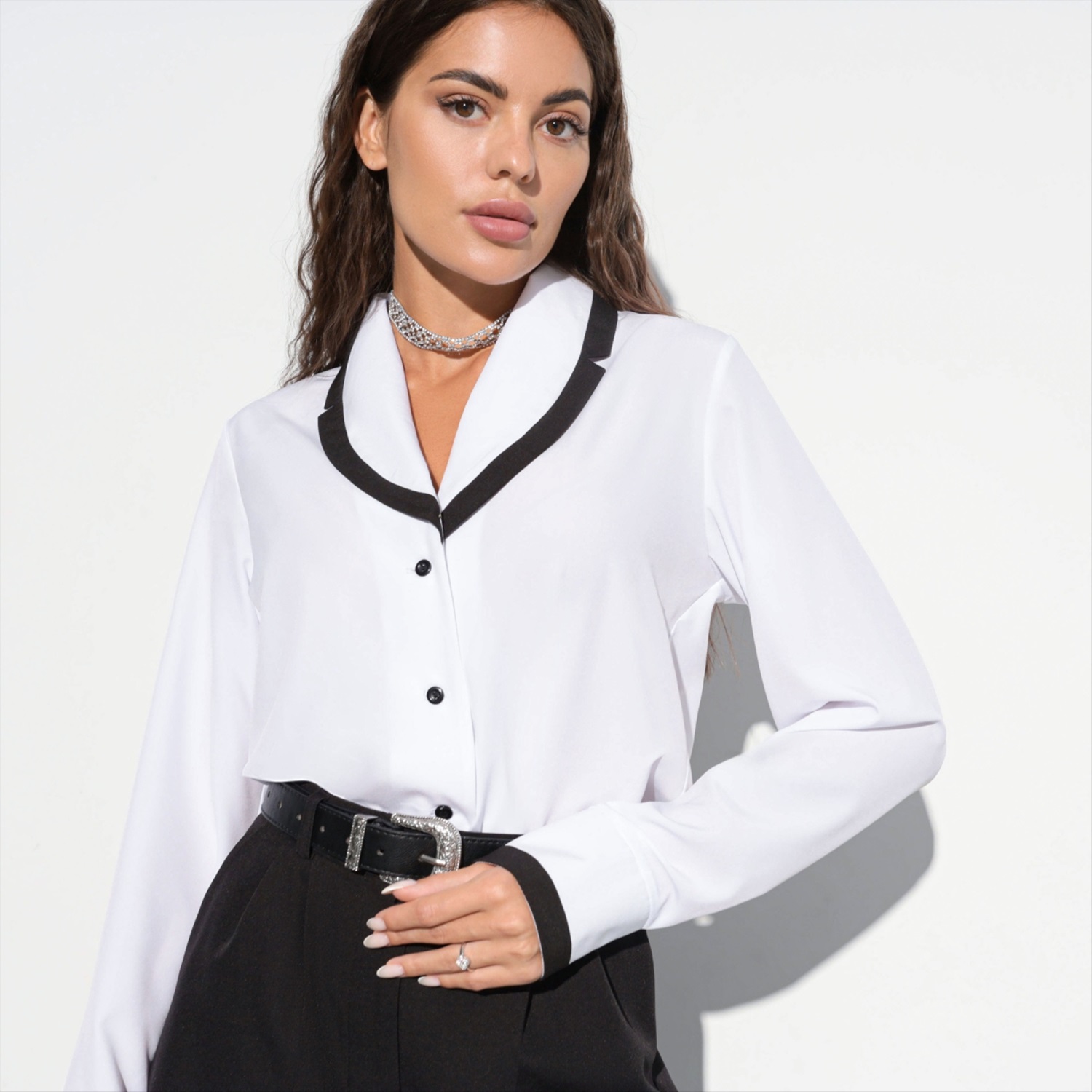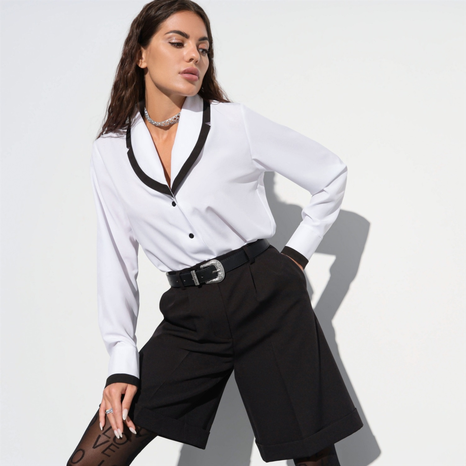 Состав: «Ниагара» (65% п/э, 30% вискоза, 5% эластан) Плотность ткани: Средняя Тип ткани: Текстиль Вид застежки: Пуговица/-ы Дополнительный цвет ткани: Черный Карманы: Нет Основной цвет ткани: Белый Отрезная талия: Нет Подклад: Нет Резинка по талии: Нет Рисунок/раппорт: Нет, все изделия идентичны Сезон: Круглогодичный Силуэт: Свободный Стиль: Деловой Параметры модели на фото: