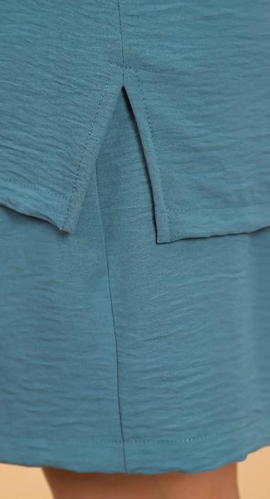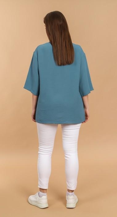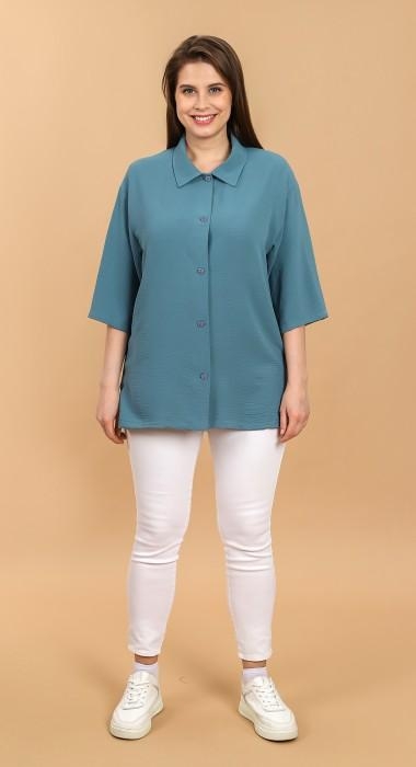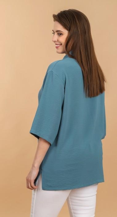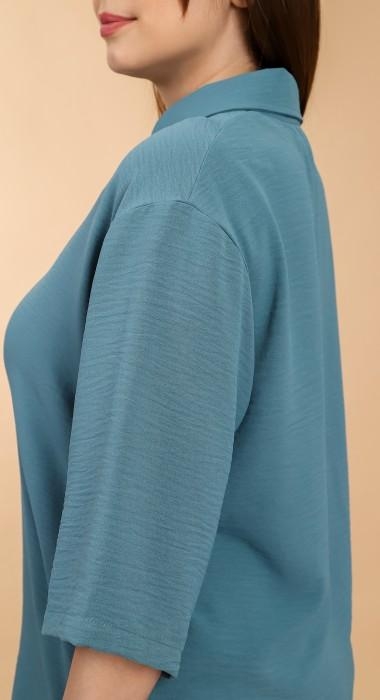 Блуза (рубашка) женская из тканого гладкокрашеного полотна «Лен Манго», свободного покроя, с короткими втачными рукавами, стояче-отложным воротником, центральной бортовой застежкой на обметанные петли и пуговицы. В боковых швах разрезы. *Ткань Лен Манго является искусственным аналогом ткани из натурального состава и имеет схожие текстурные характеристики. Лен Манго имеет крэш-эффект - "эффект помятости", в отличие от натурального льна не требует тщательного разглаживания утюгом и практически не мнется при носке. Ткань тактильно приятная, лёгкая и прочная, садится по фигуре. Оптимальные показатели паропроводимости позволяют использовать Лен Манго для пошива летней одежды.