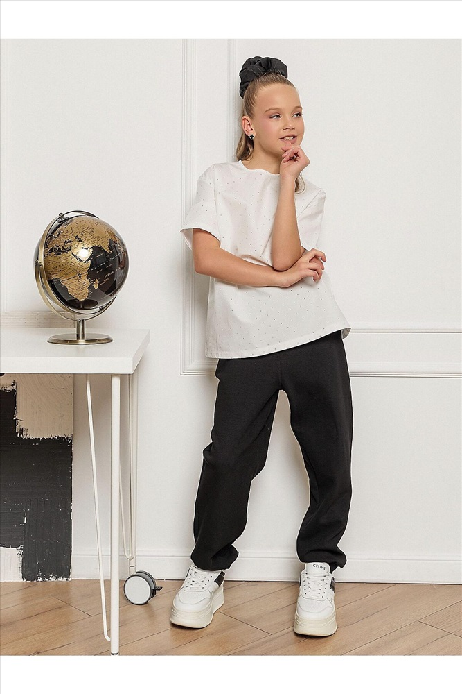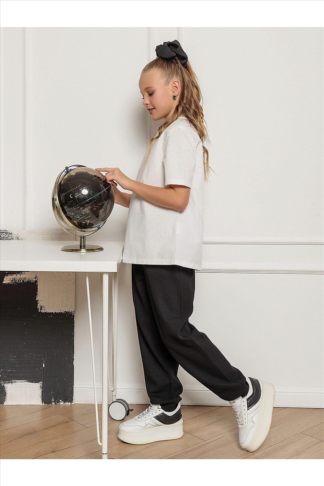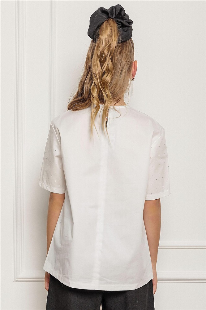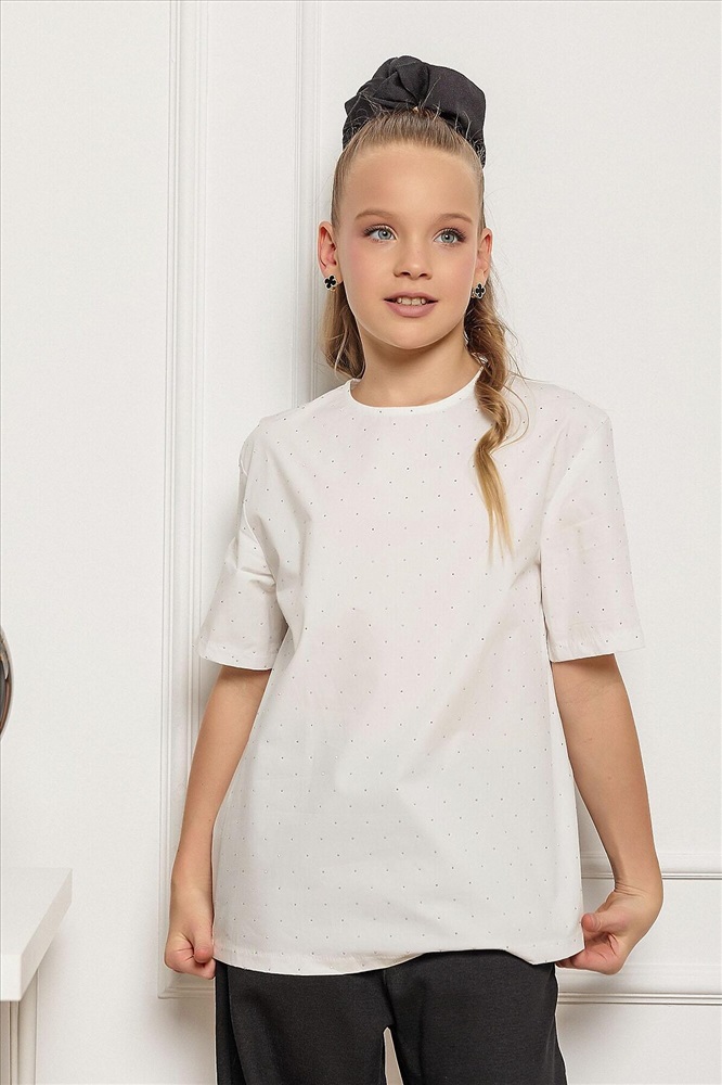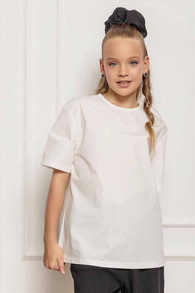 Белая блузка для девочки с элегантными деталями. Спущенное плечо – модный дизайн, который добавляет образу легкость. Короткий рукав – идеальный вариант для теплого сезона. Застежка на пуговицу сзади. Классический белый цвет – универсальный оттенок, который сочетается с любой юбкой, брюками или шортами. Удобный крой – не сковывает движения, обеспечивая комфорт в течение всего дня. Качественный материал – приятный к телу, хорошо держит форму. Стильный фасон – подходит как для школы, так и для праздничных мероприятий.